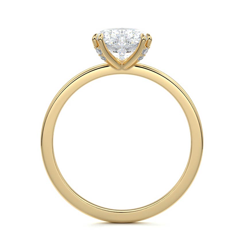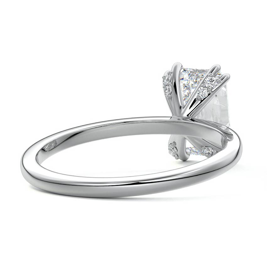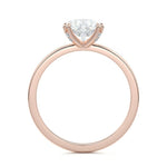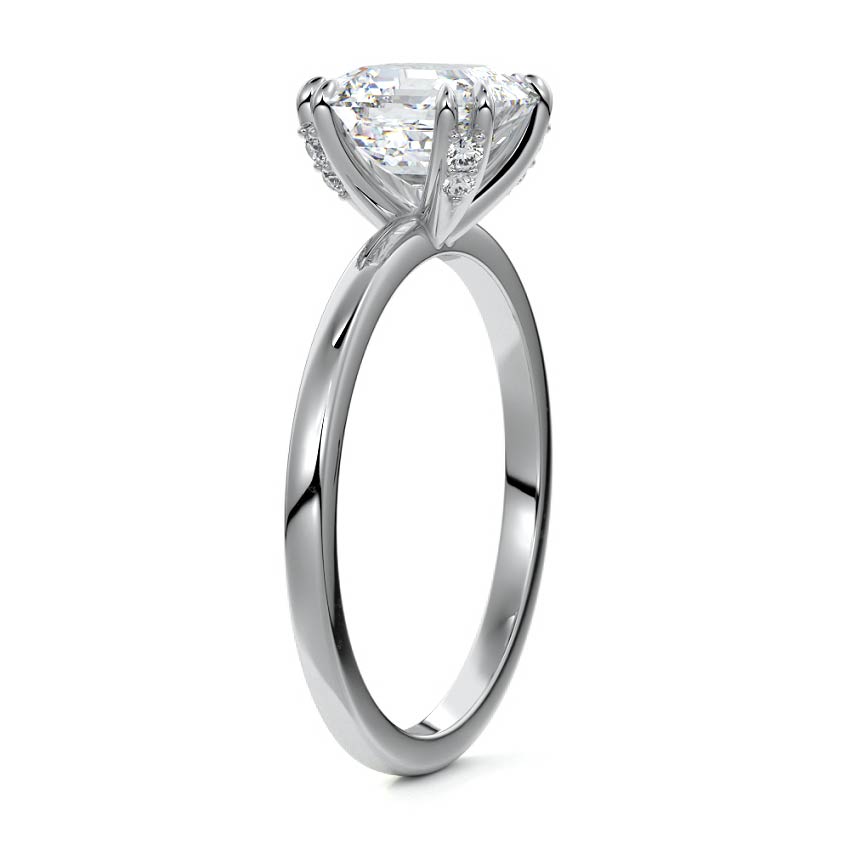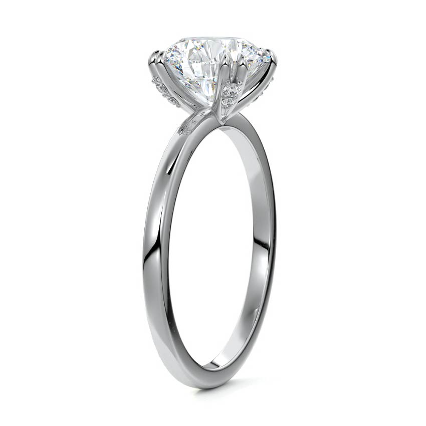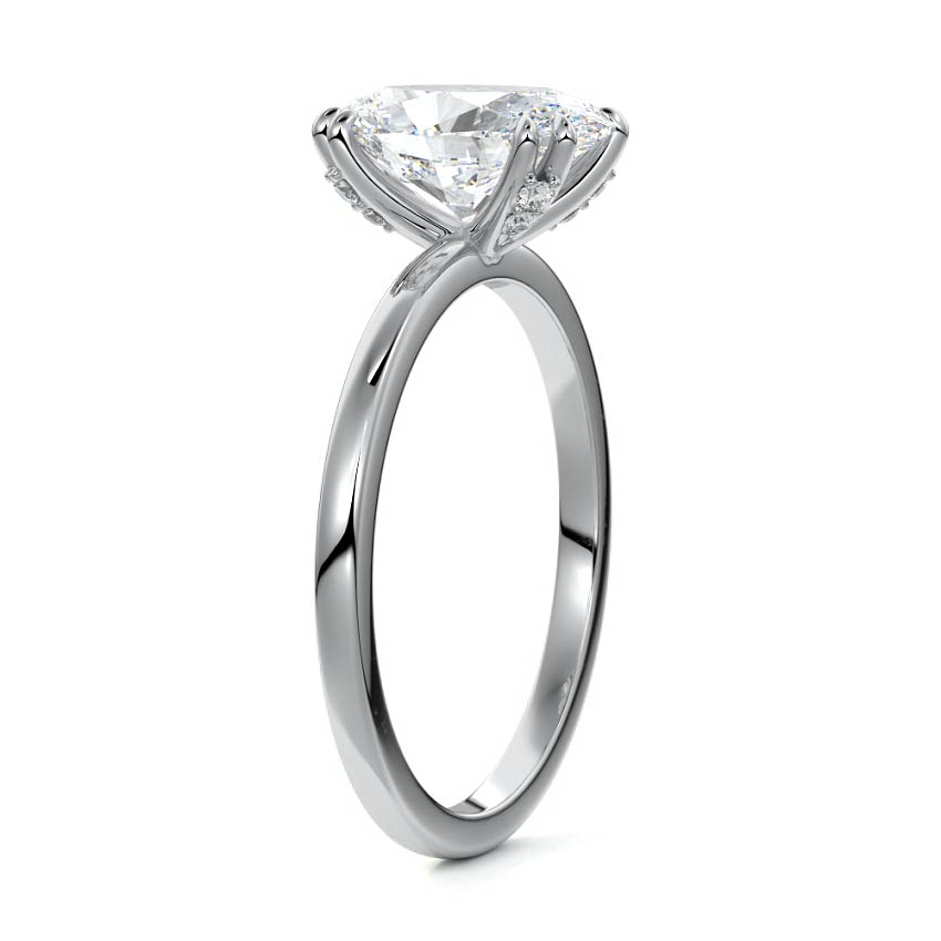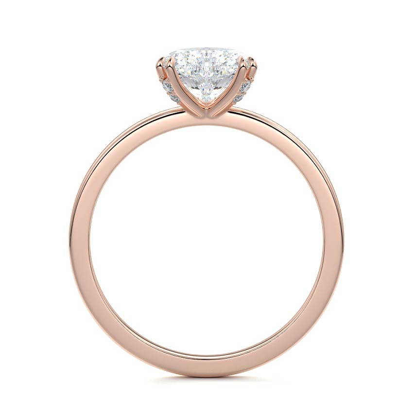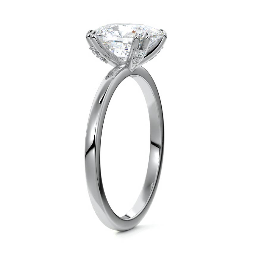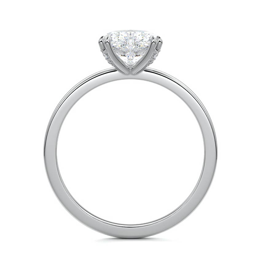 The solitaire setting boasts a semi-rounded mount adorned with a diamond-accented double prong arrangement, adding a contemporary touch of grace that distinguishes it from the conventional double prong solitaire design.