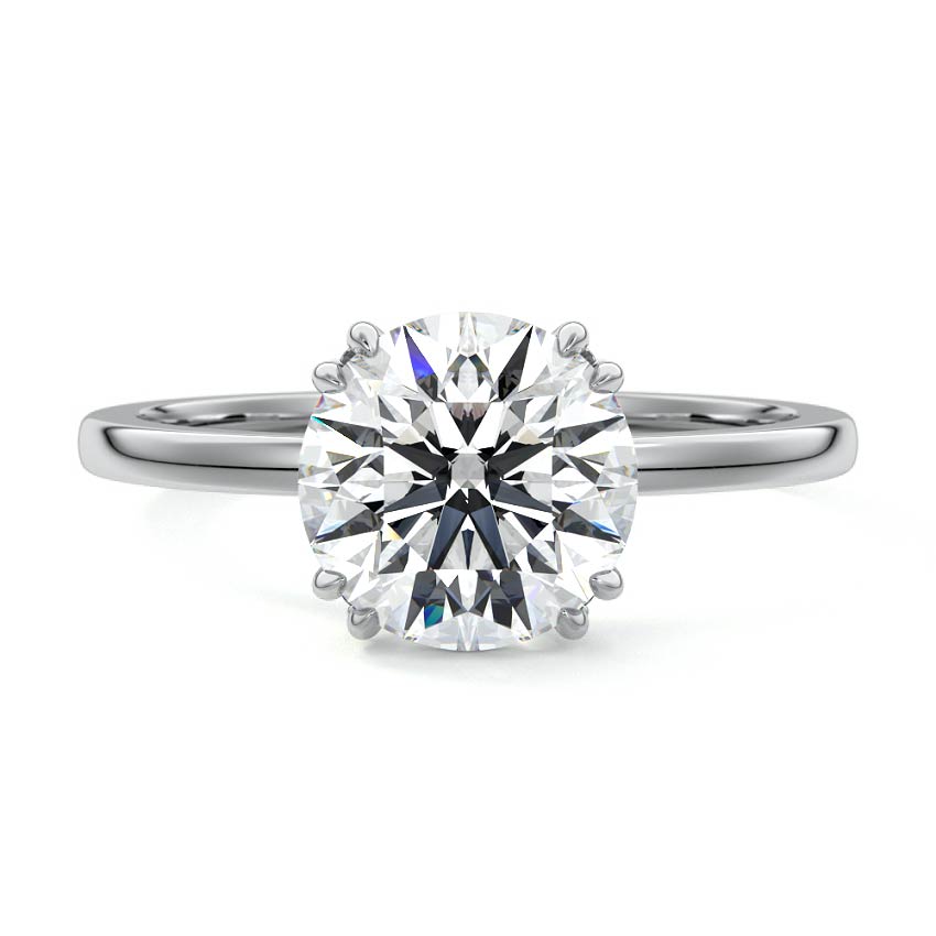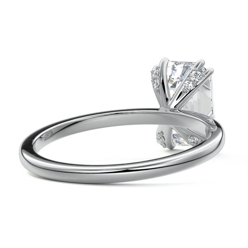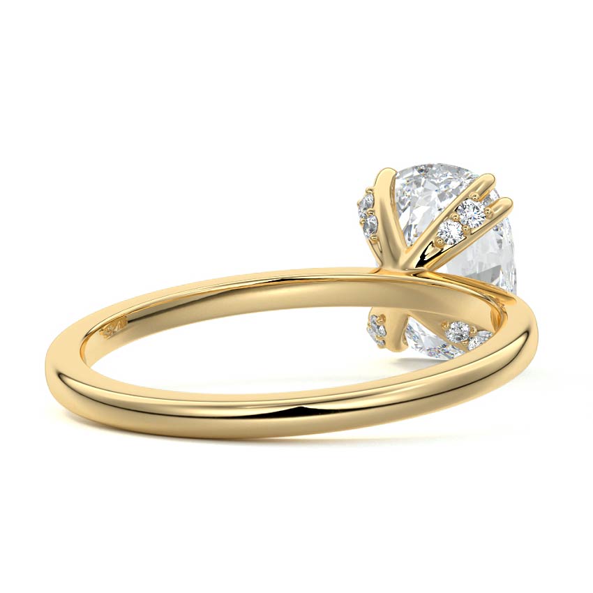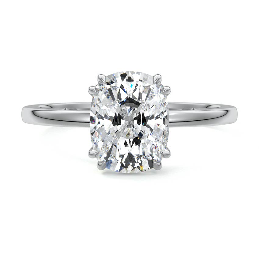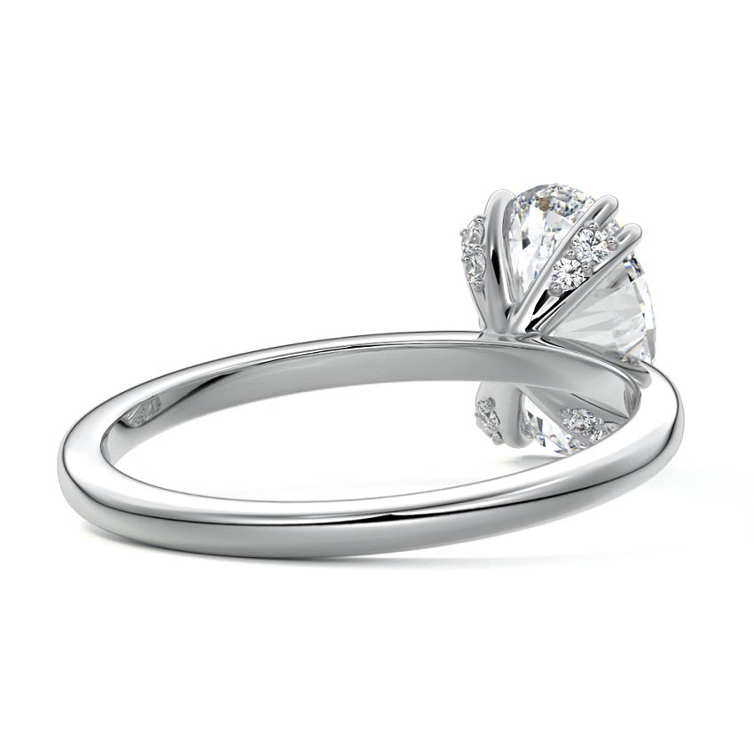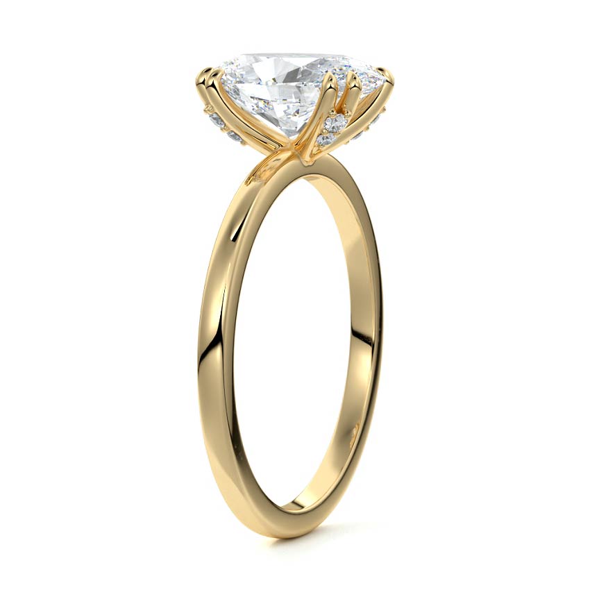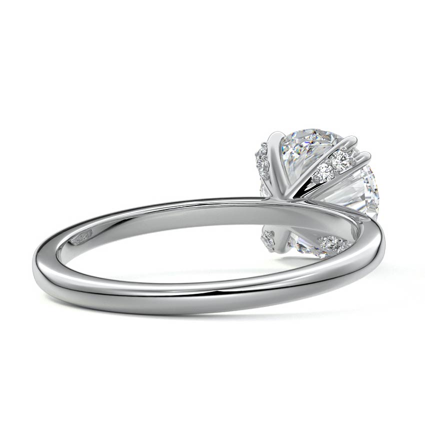 The solitaire setting boasts a semi-rounded mount adorned with a diamond-accented double prong arrangement, adding a contemporary touch of grace that distinguishes it from the conventional double prong solitaire design.