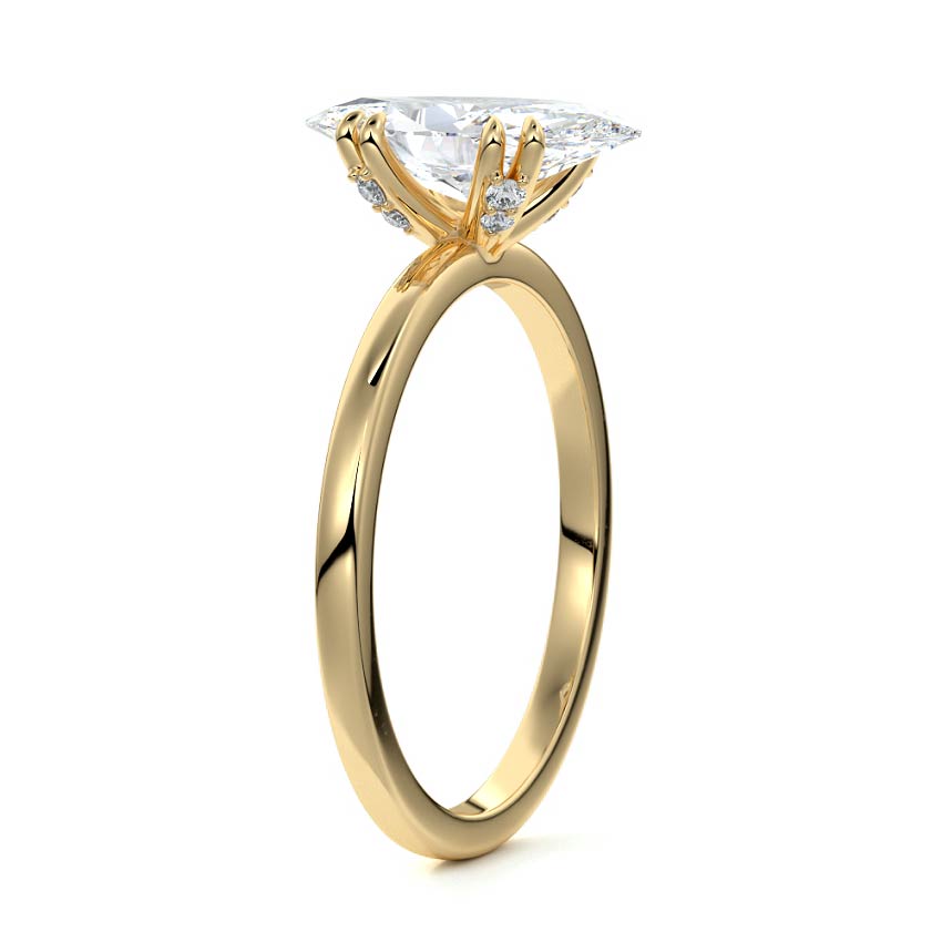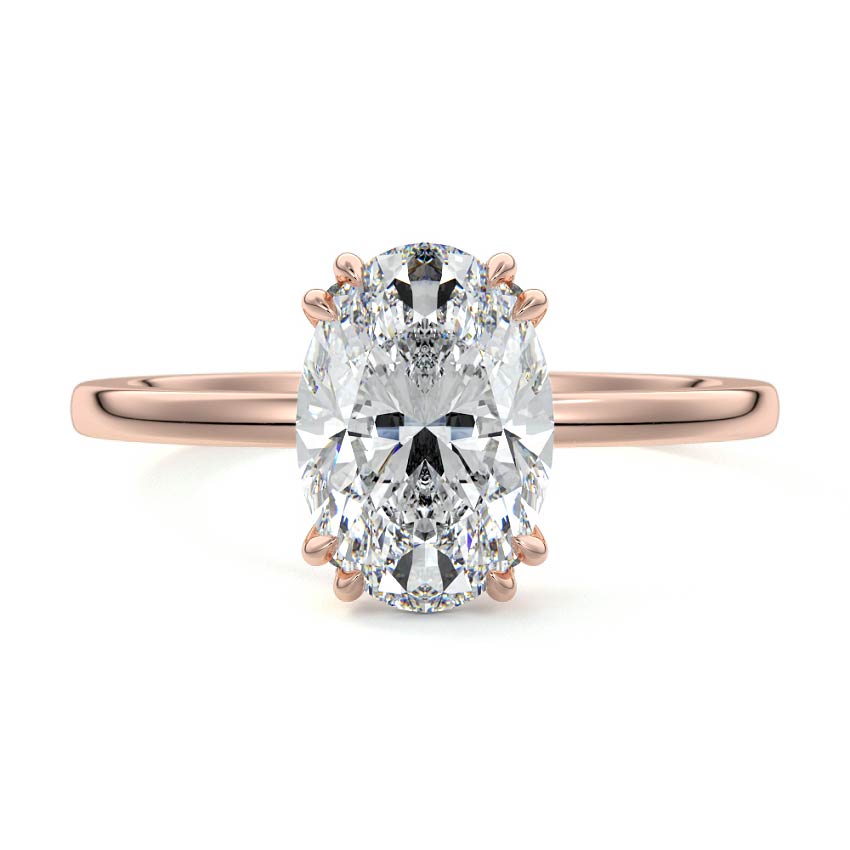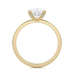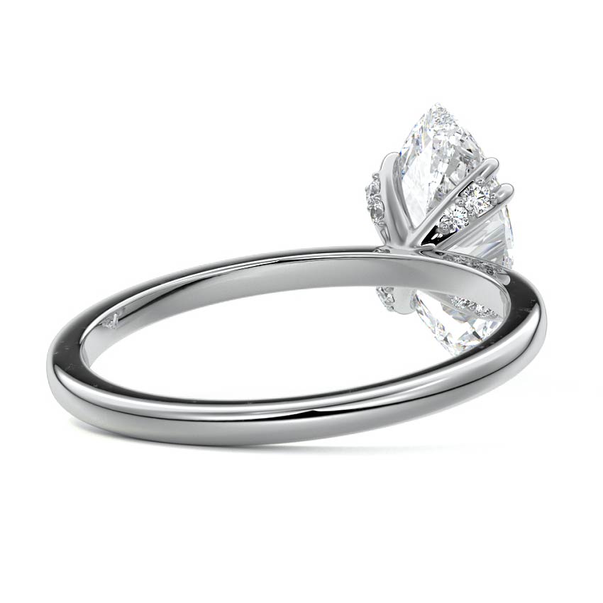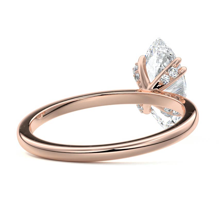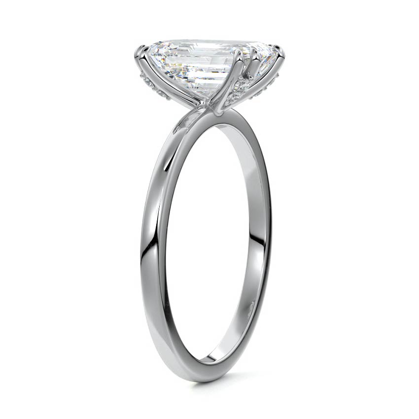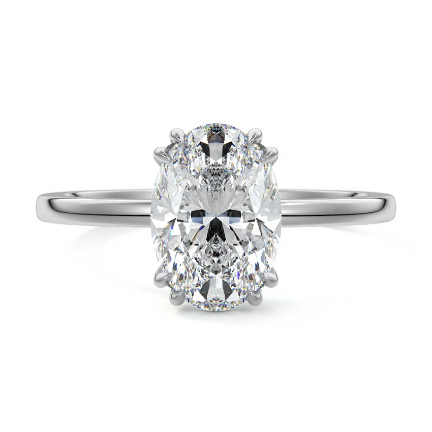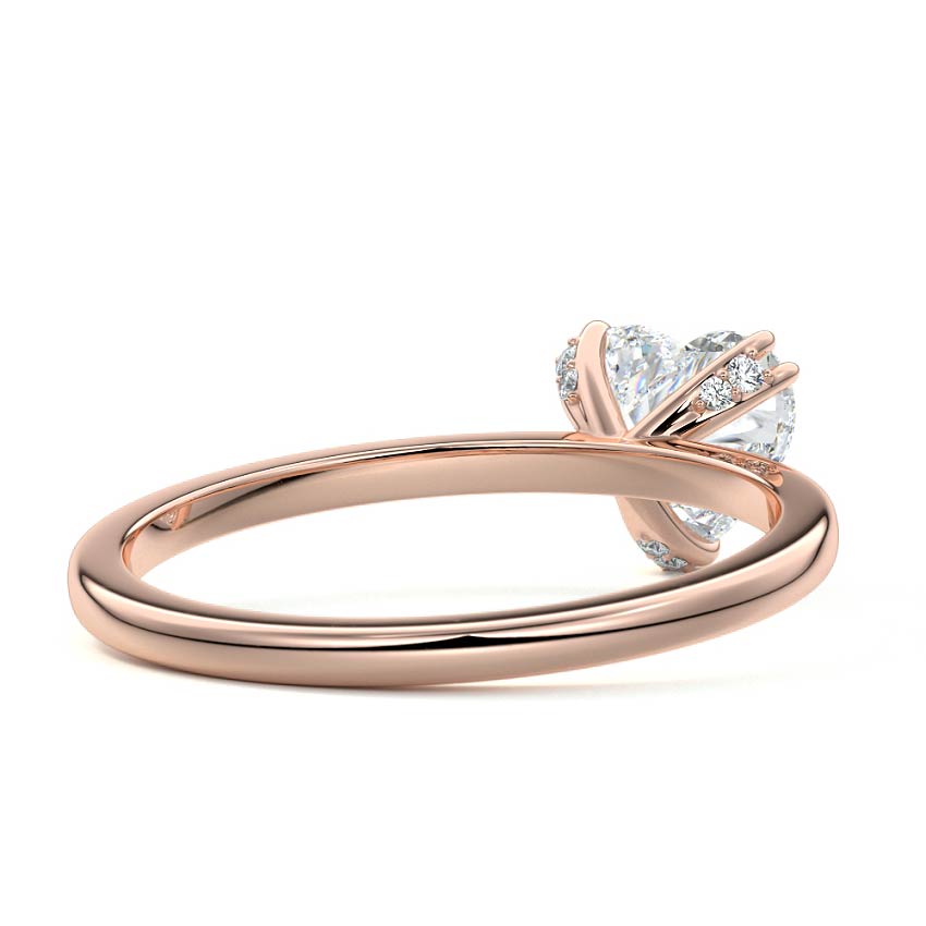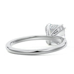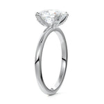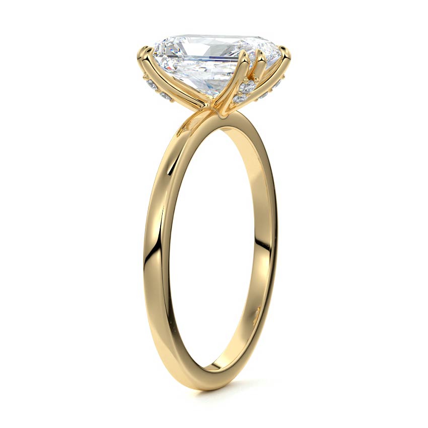 The solitaire setting boasts a semi-rounded mount adorned with a diamond-accented double prong arrangement, adding a contemporary touch of grace that distinguishes it from the conventional double prong solitaire design.