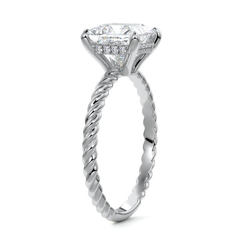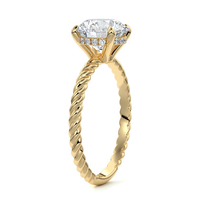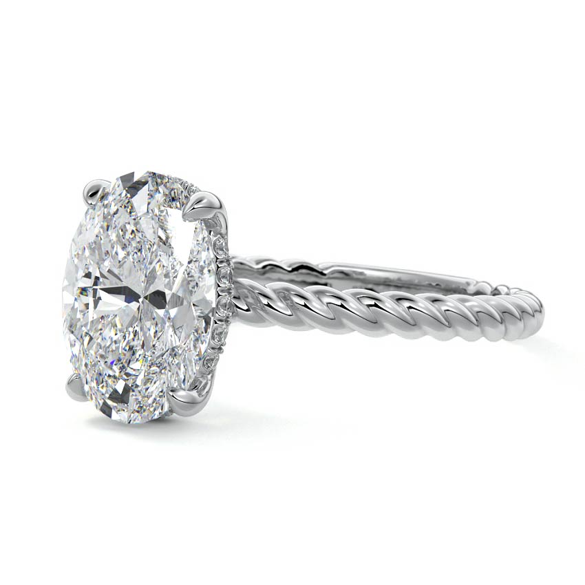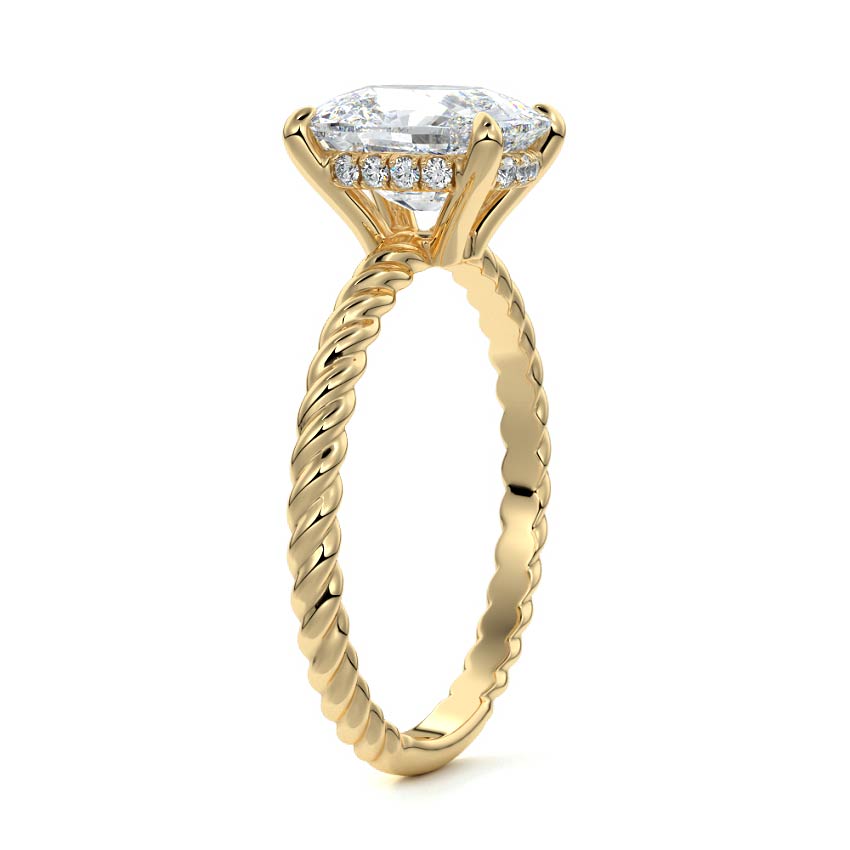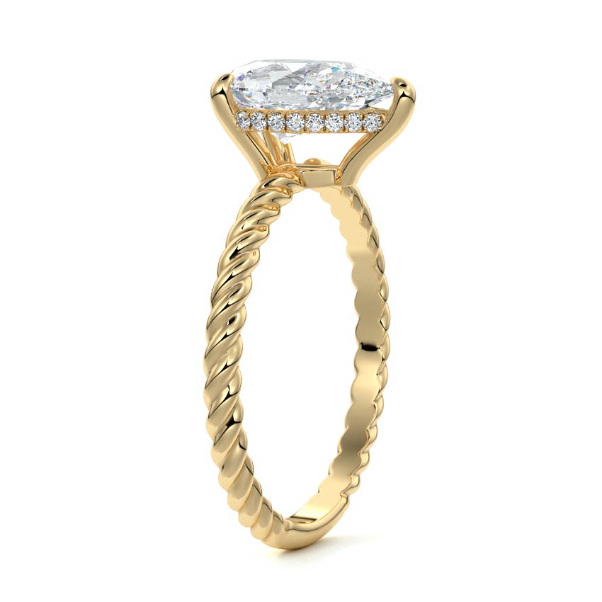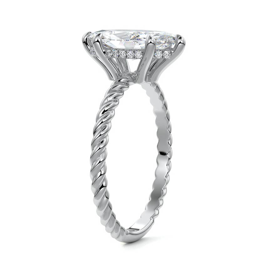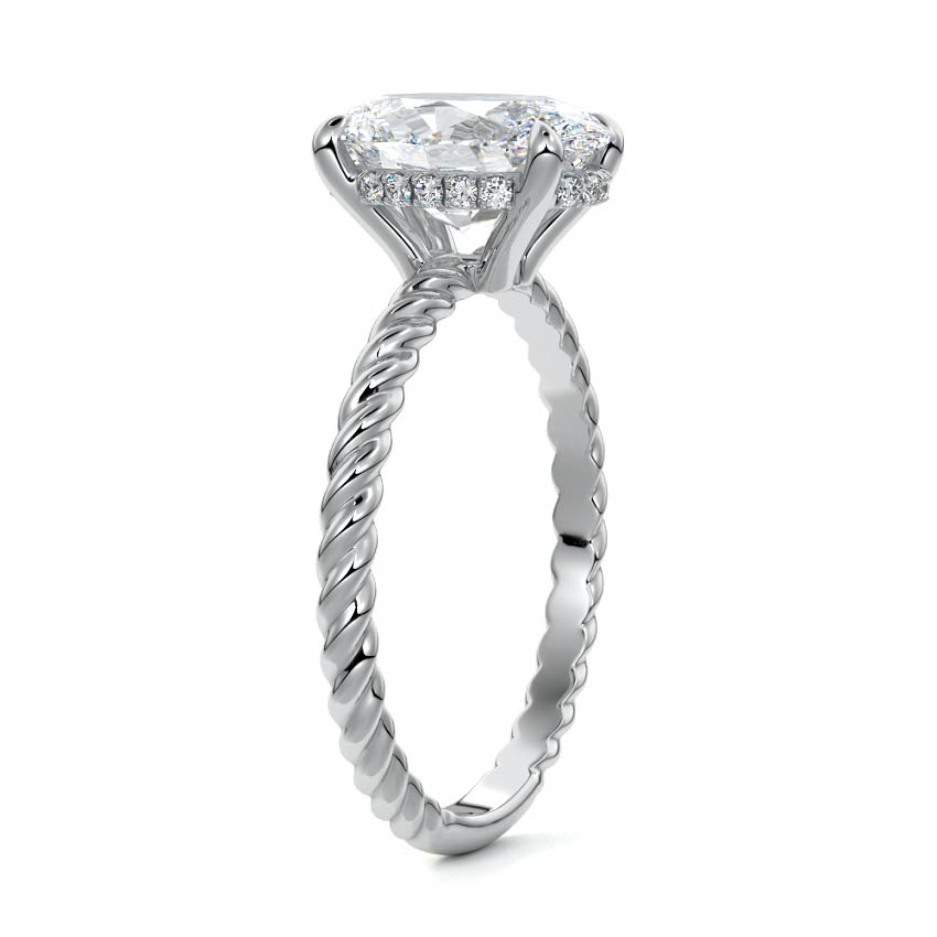 A striking and distinctive ring for those who appreciate unconventional designs. It combines the elegance of a hidden halo with the artistic charm of a twisted band, resulting in a unforgettable piece of jewelry.
