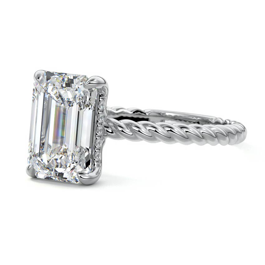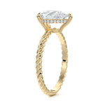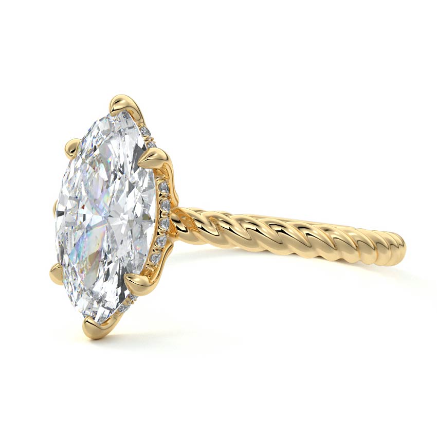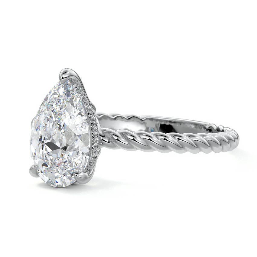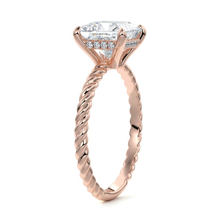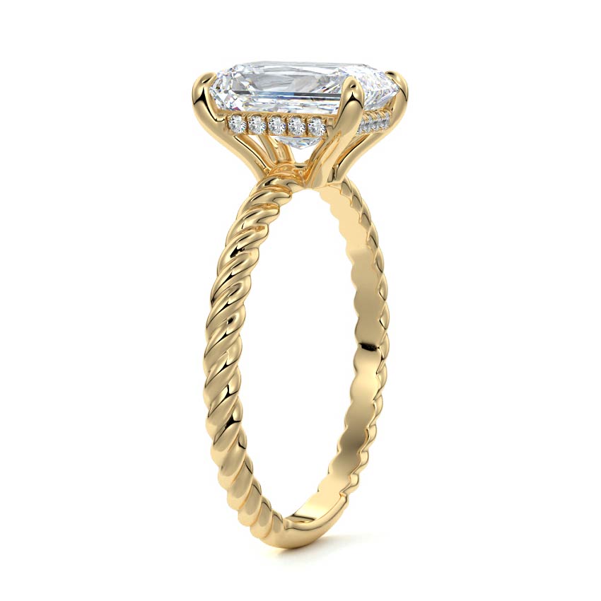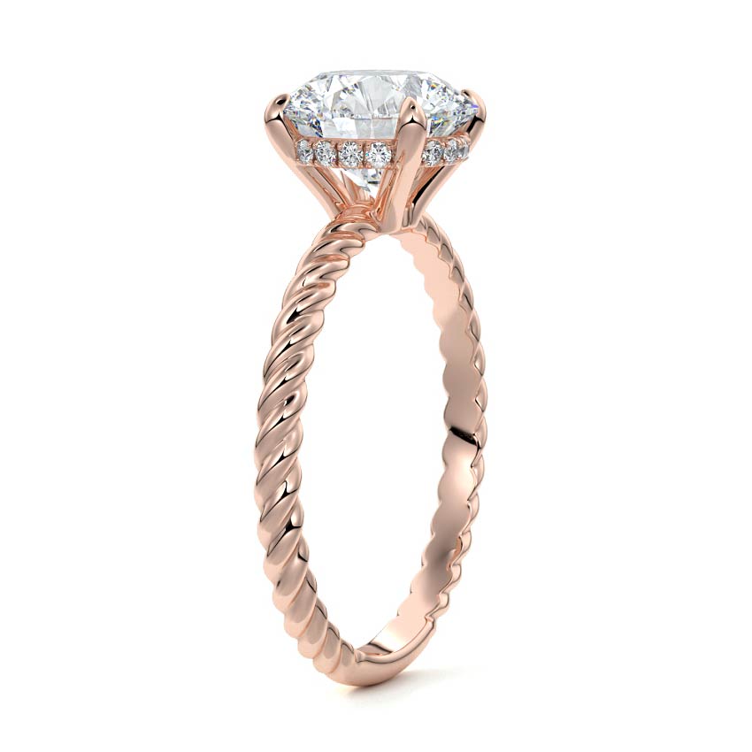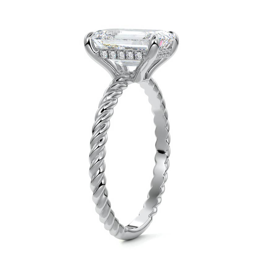 A striking and distinctive ring for those who appreciate unconventional designs. It combines the elegance of a hidden halo with the artistic charm of a twisted band, resulting in a unforgettable piece of jewelry.