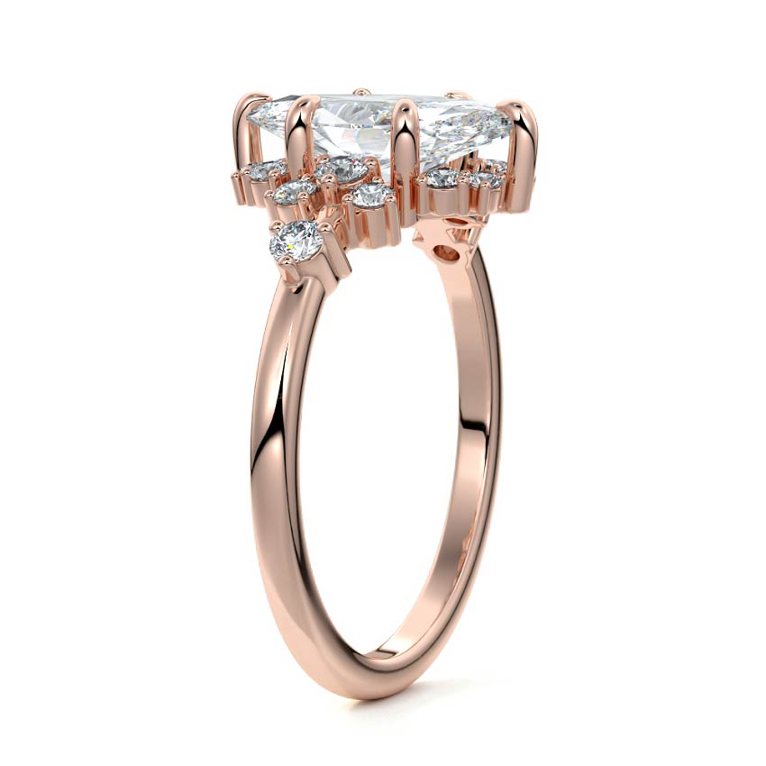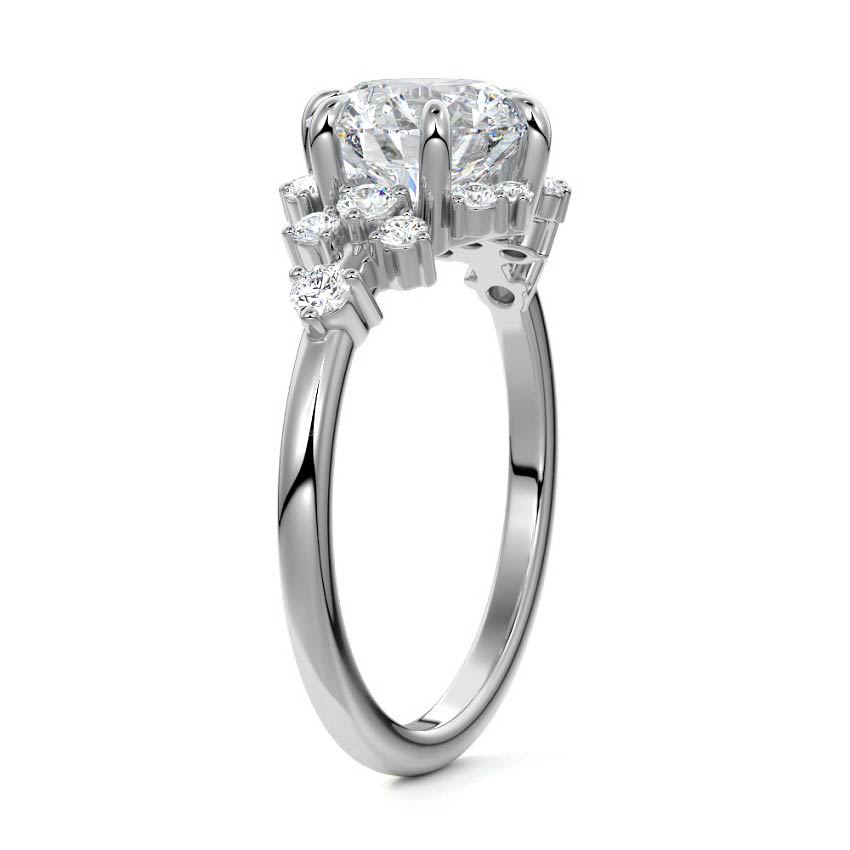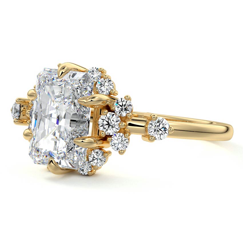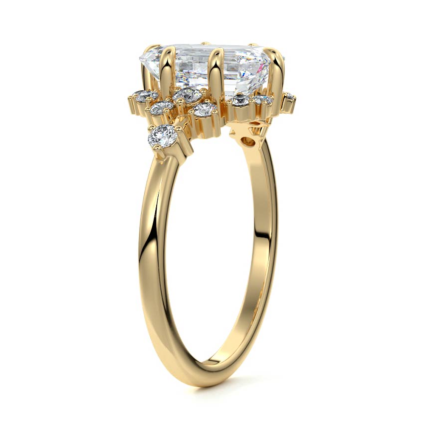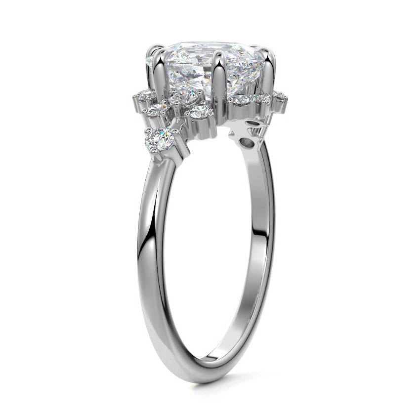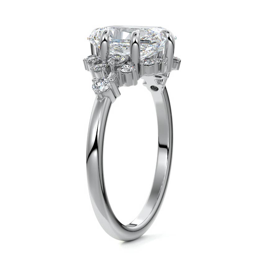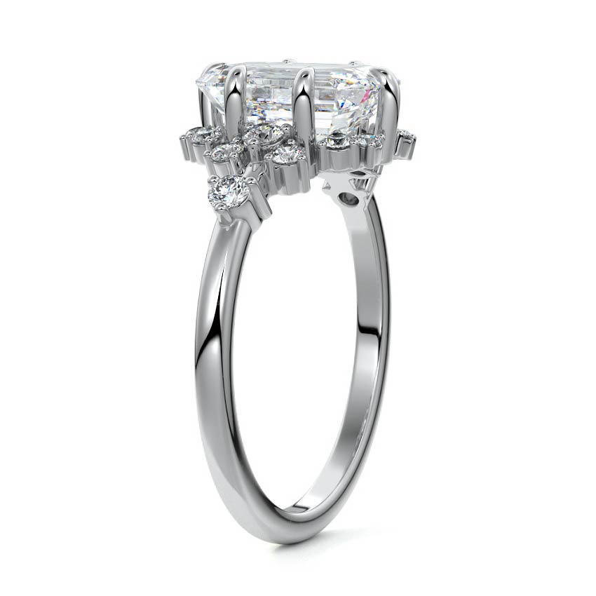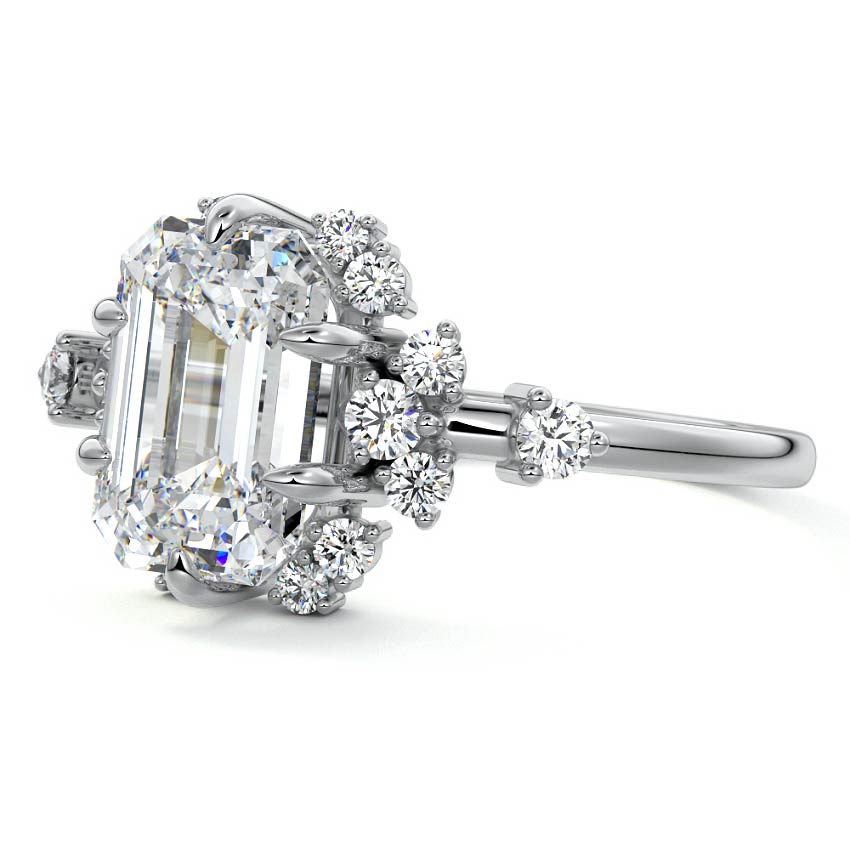 The band of the ring serves as a canvas for this extravagant display, with numerous round diamonds carefully pavé-set in a fancy pattern. The particular configuration of these diamonds hints at various floral motifs, guaranteeing a distinctive and visually enchanting allure.