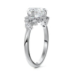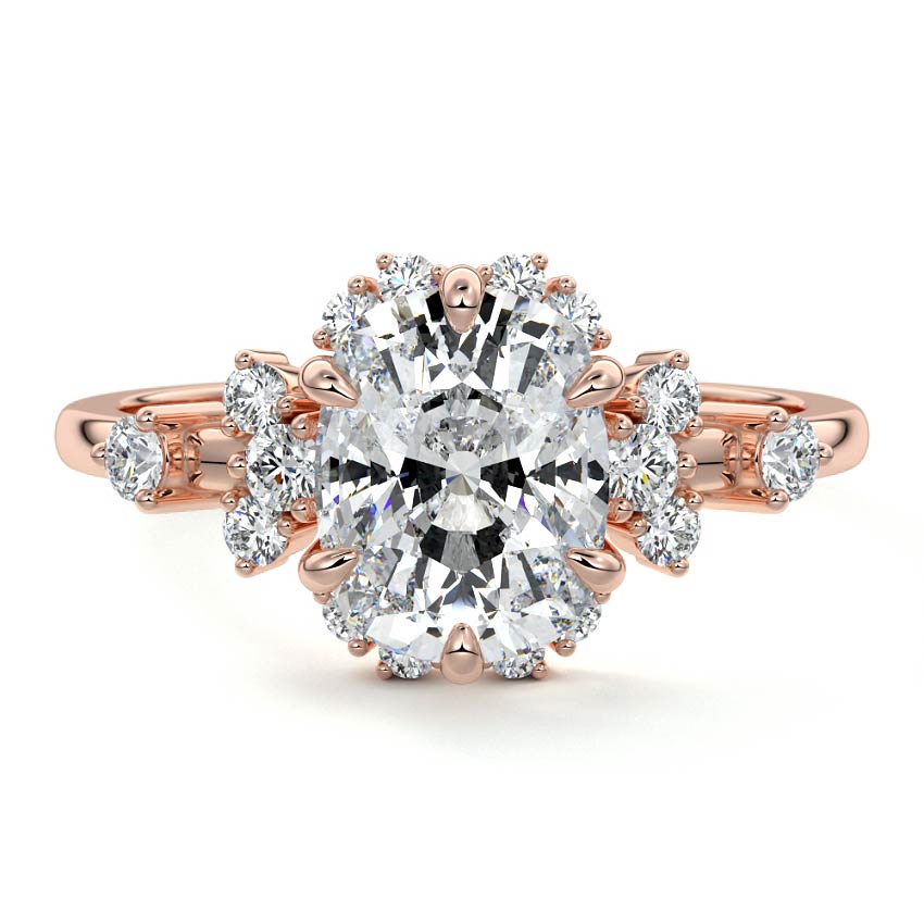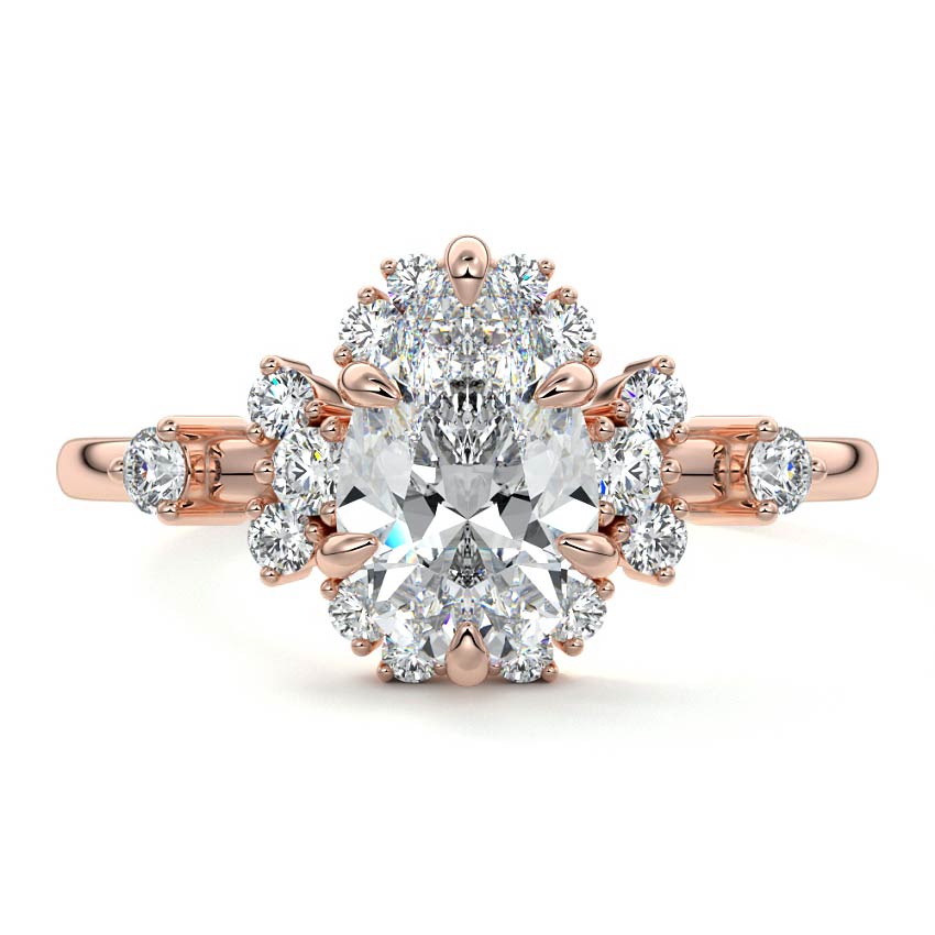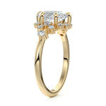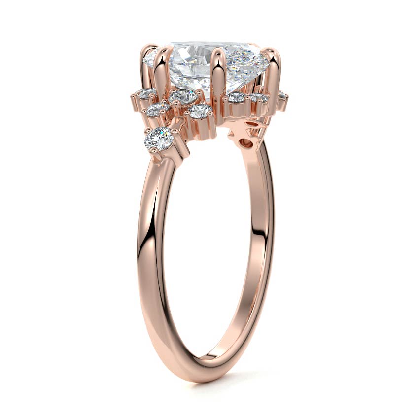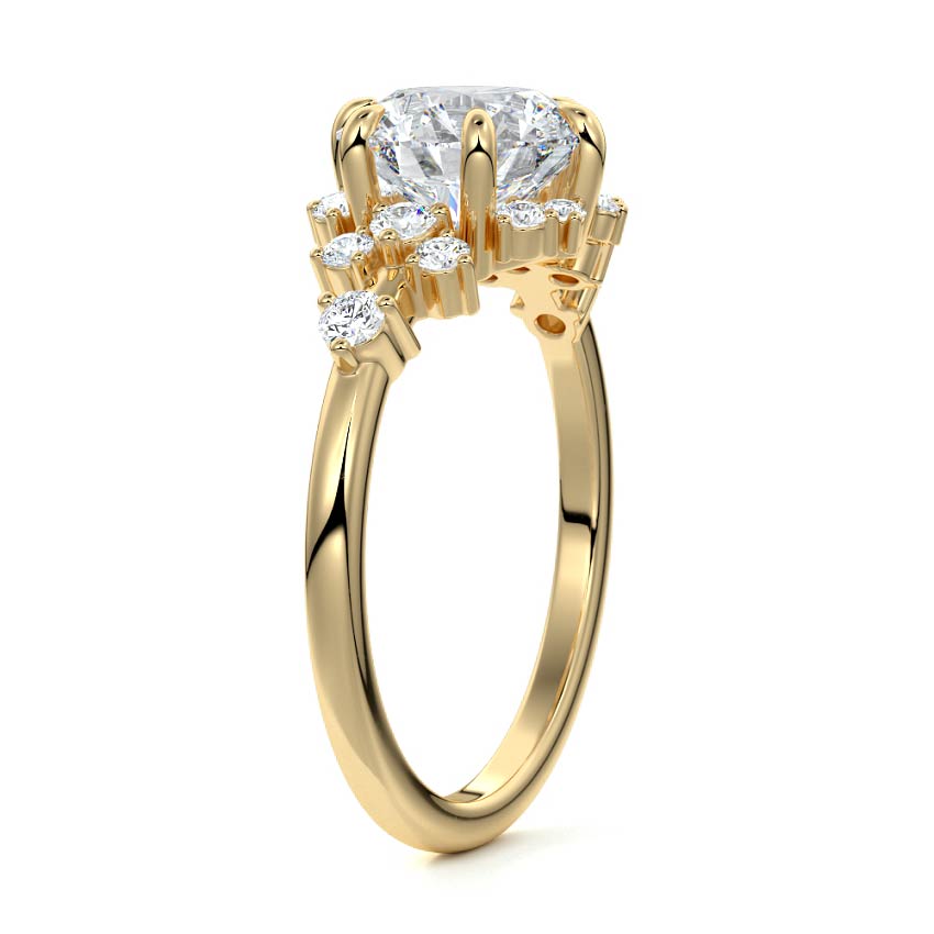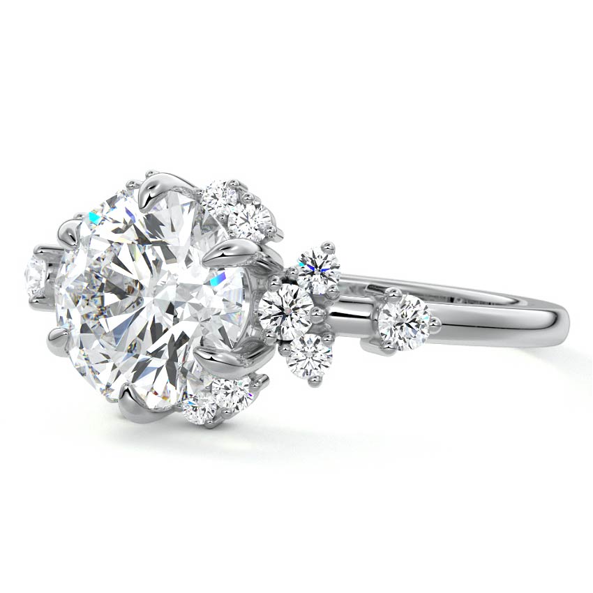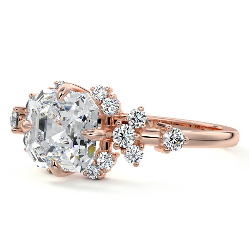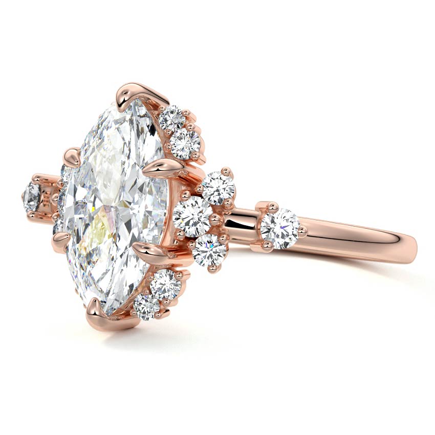 The band of the ring serves as a canvas for this extravagant display, with numerous round diamonds carefully pavé-set in a fancy pattern. The particular configuration of these diamonds hints at various floral motifs, guaranteeing a distinctive and visually enchanting allure.