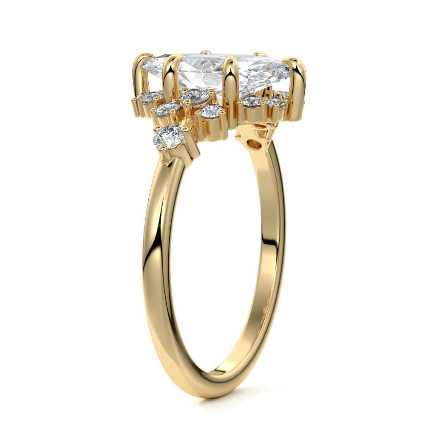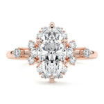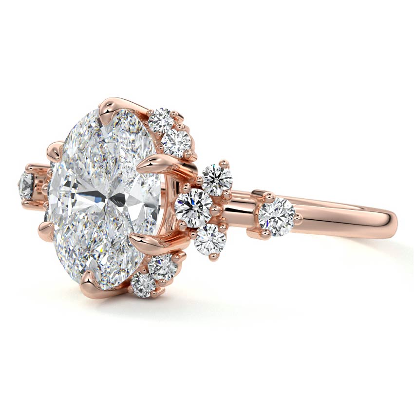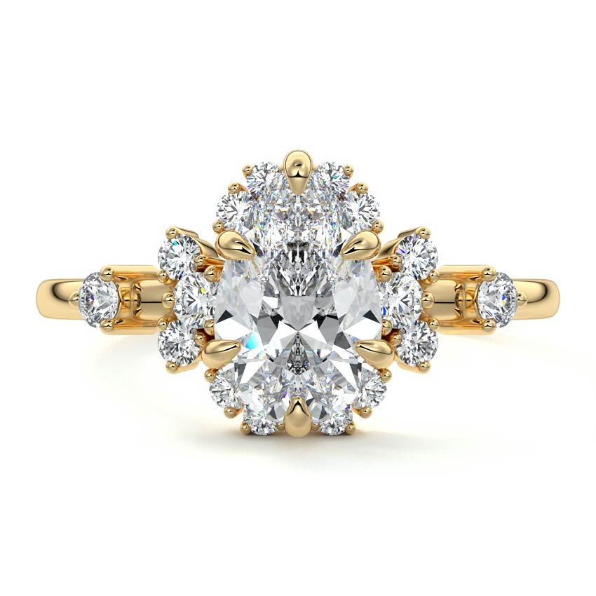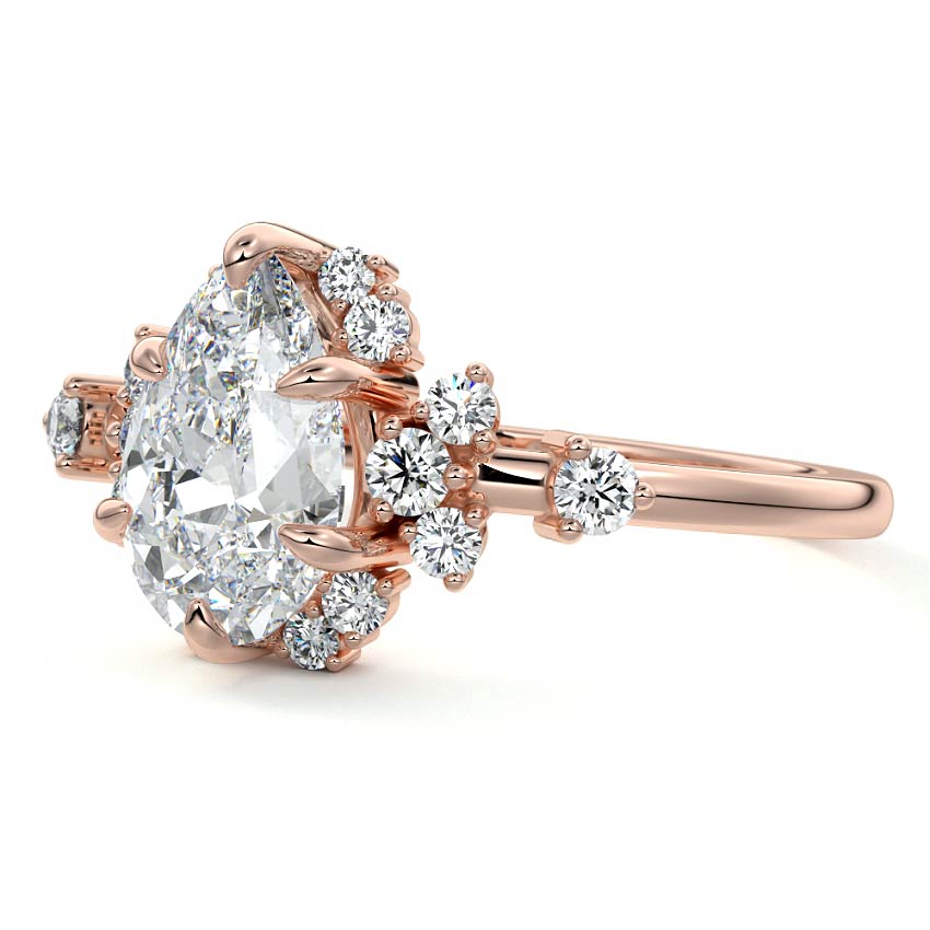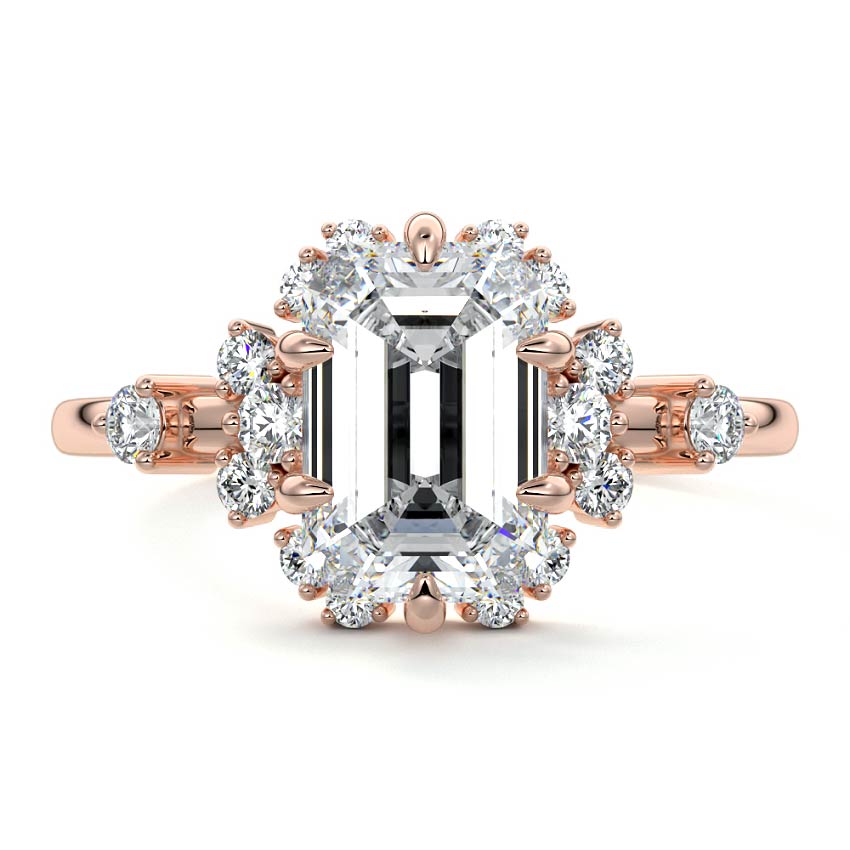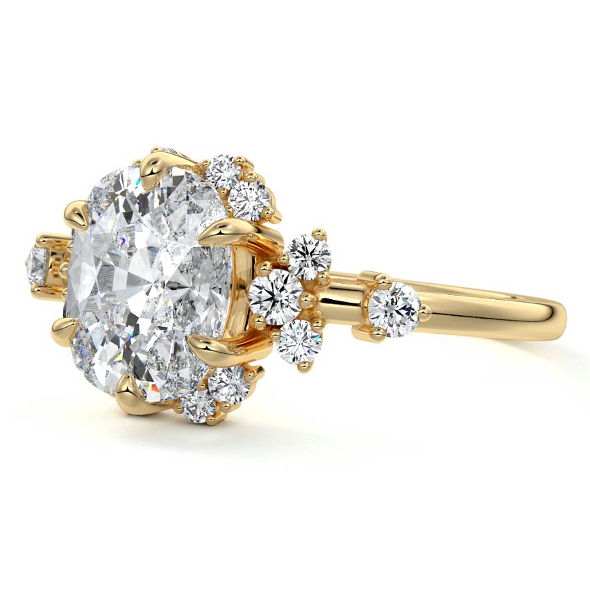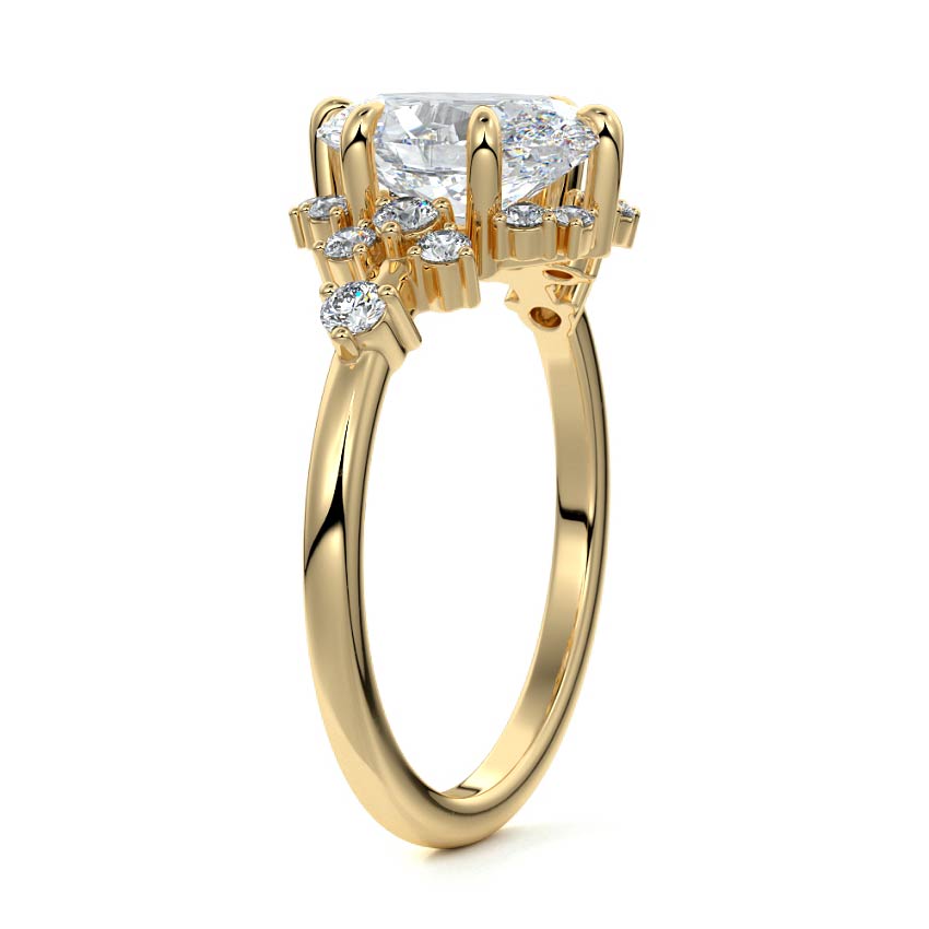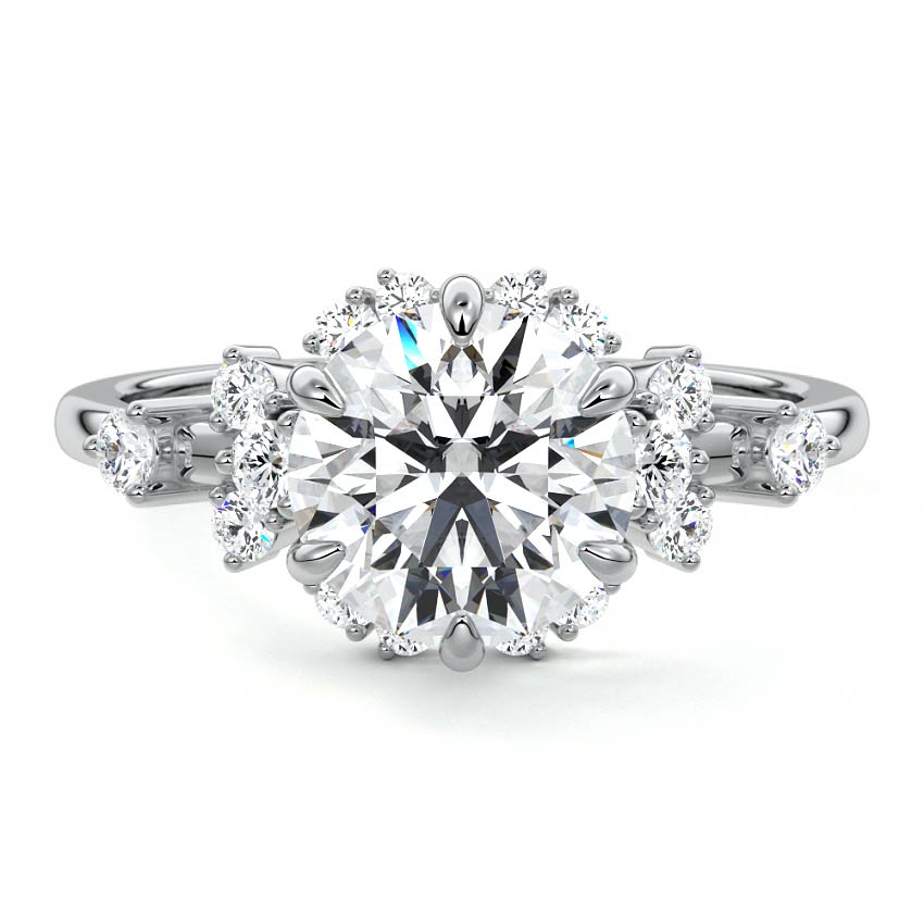 The band of the ring serves as a canvas for this extravagant display, with numerous round diamonds carefully pavé-set in a fancy pattern. The particular configuration of these diamonds hints at various floral motifs, guaranteeing a distinctive and visually enchanting allure.