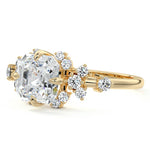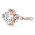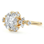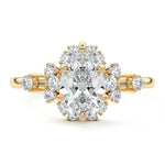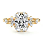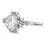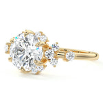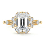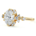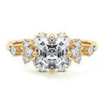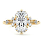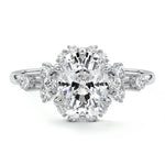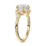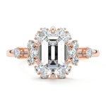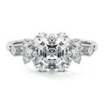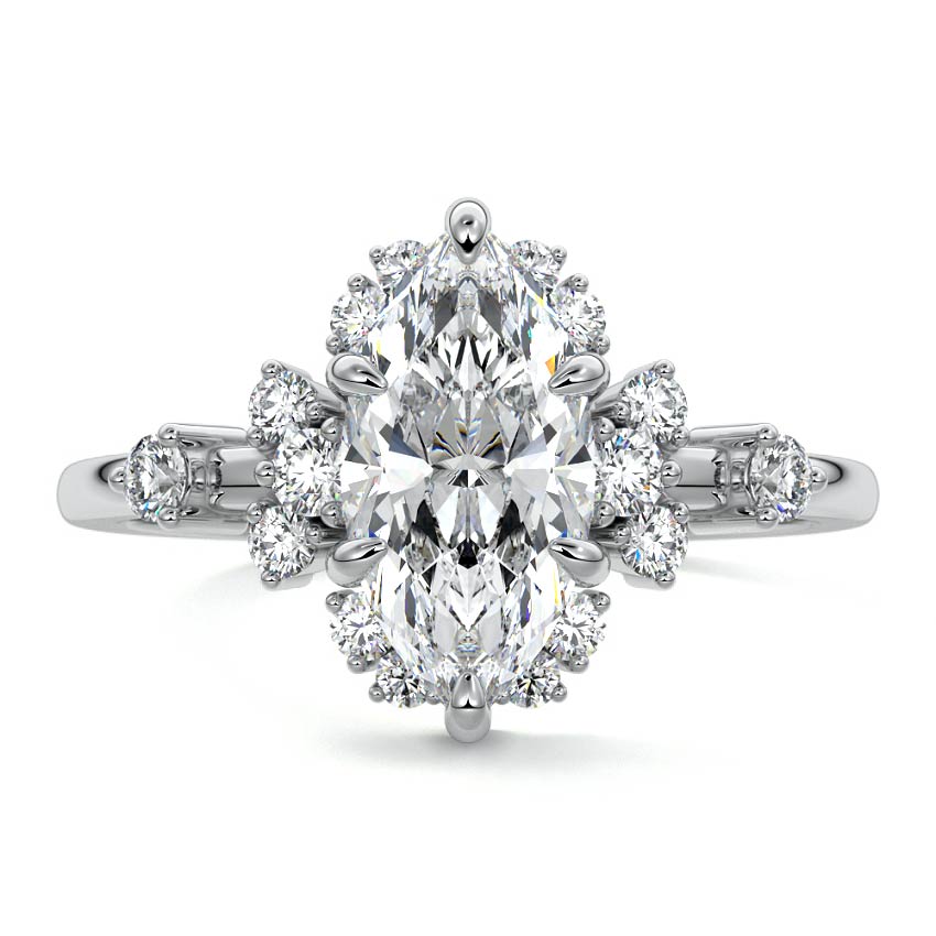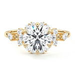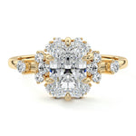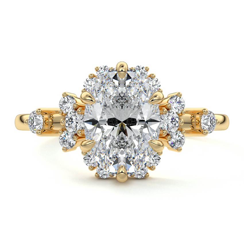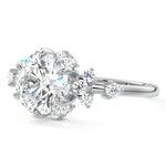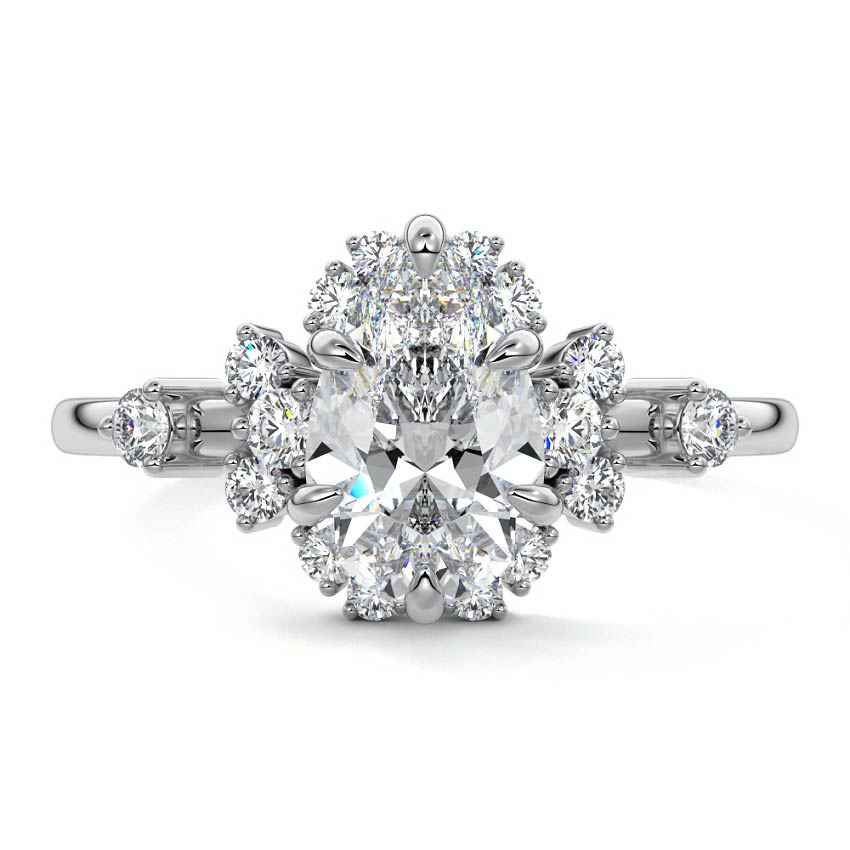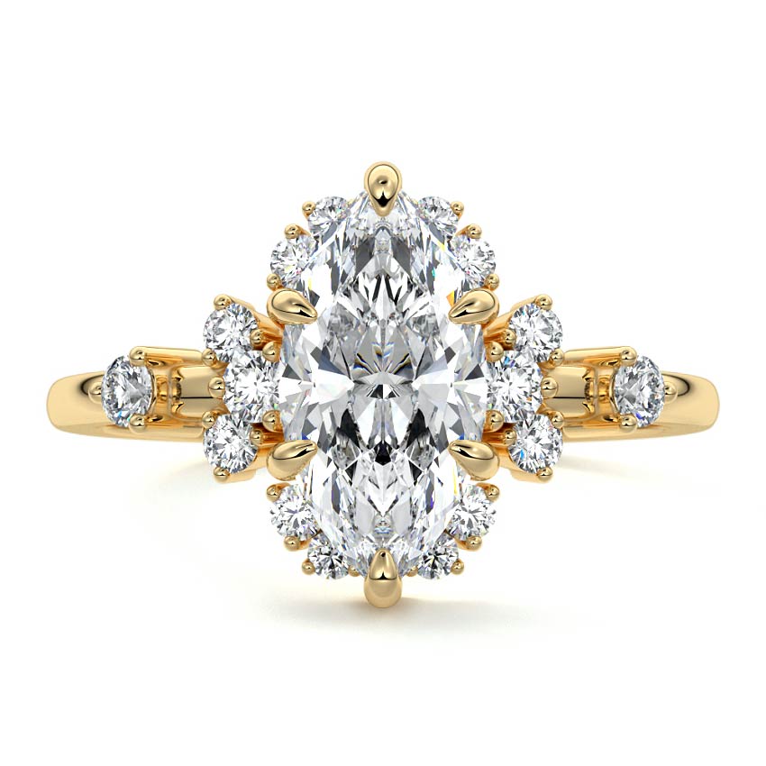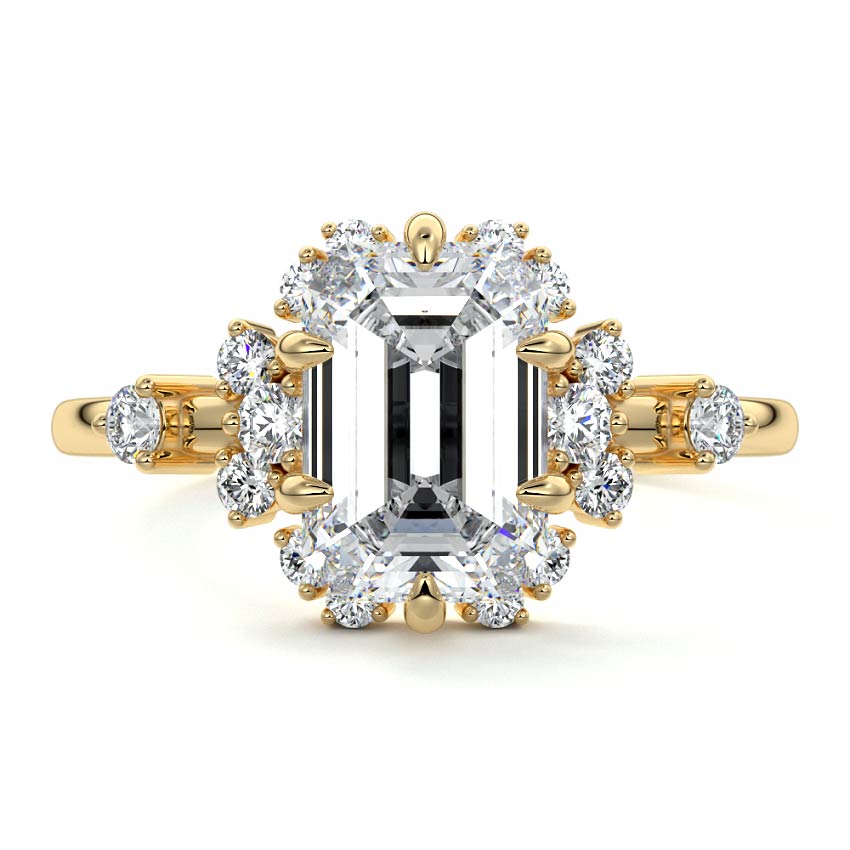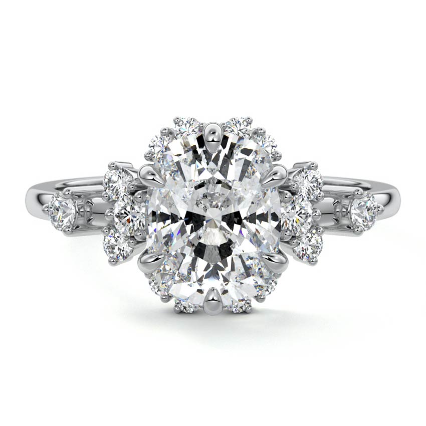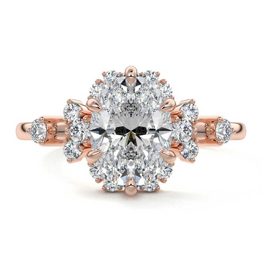The band of the ring serves as a canvas for this extravagant display, with numerous round diamonds carefully pavé-set in a fancy pattern. The particular configuration of these diamonds hints at various floral motifs, guaranteeing a distinctive and visually enchanting allure.