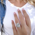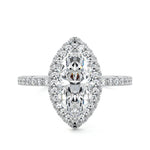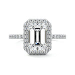 This setting showcases a sophisticated design featuring pave-set diamonds along half of the band, leading to an accentuated under gallery beneath the center stone. The center stone is further enhanced by a double diamond halo, which adds a layer of brilliance and opulence, resulting in a striking and luxurious piece of jewelry.