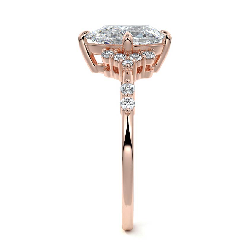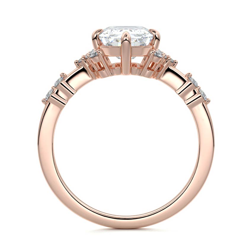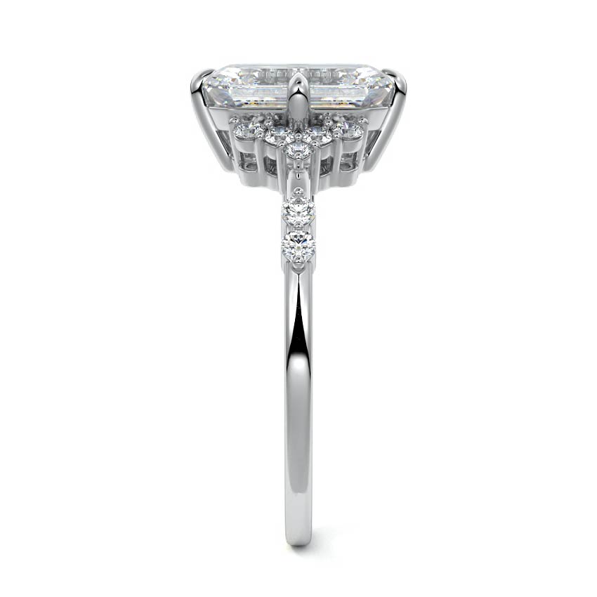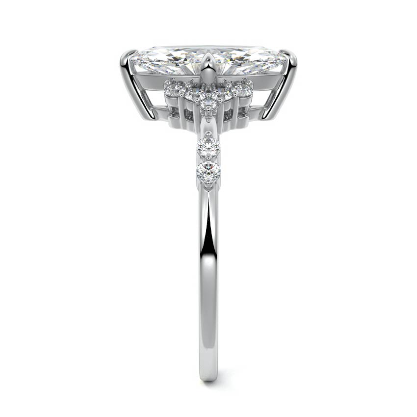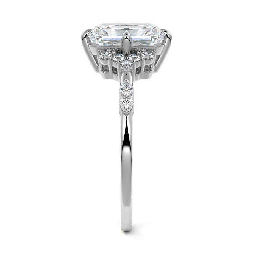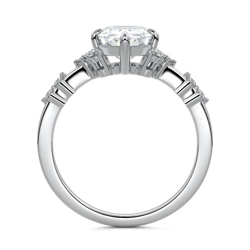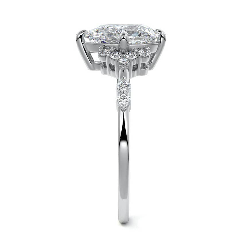 In this ornate ring setting, you'll find an array of diamond accents in various shapes, along with an adorned cluster of diamonds flanking the center stone. These compass-style prongs lend a decorative and ornate quality to the setting.