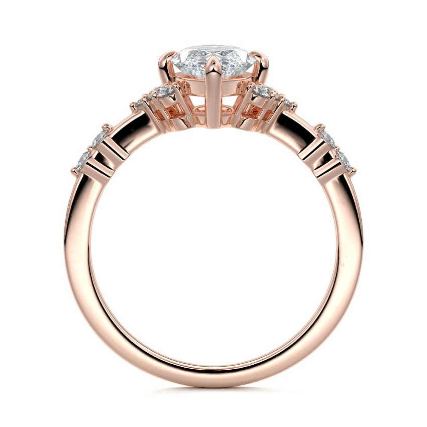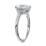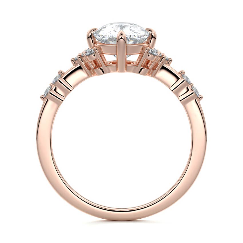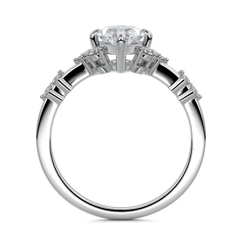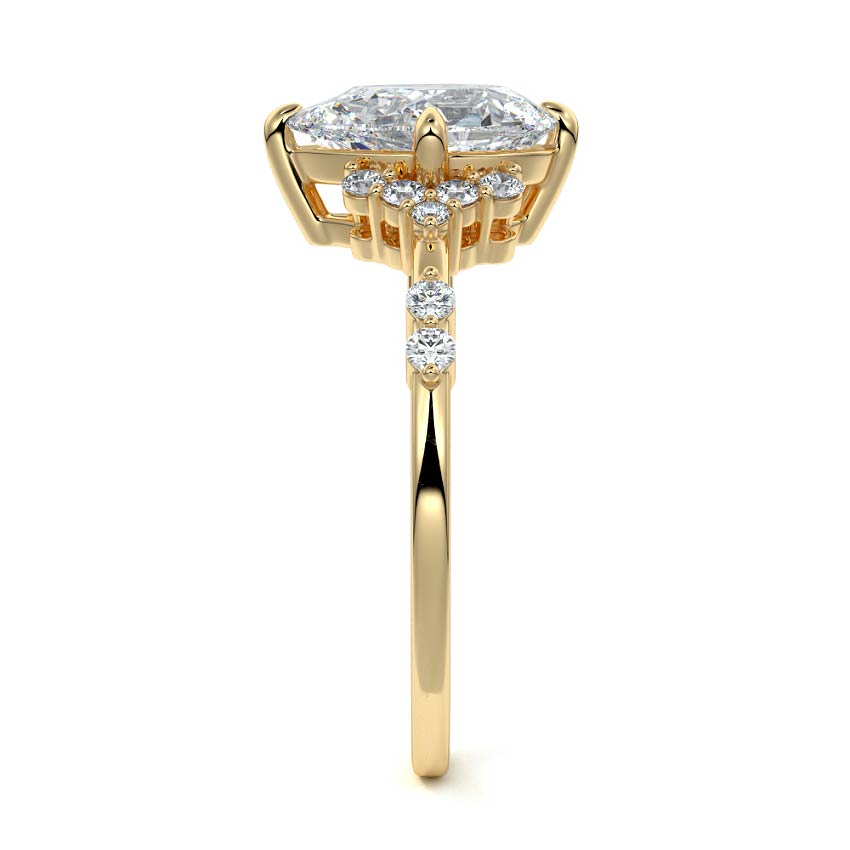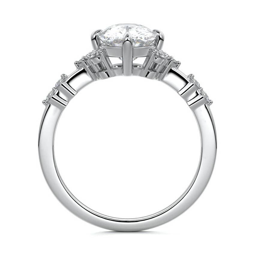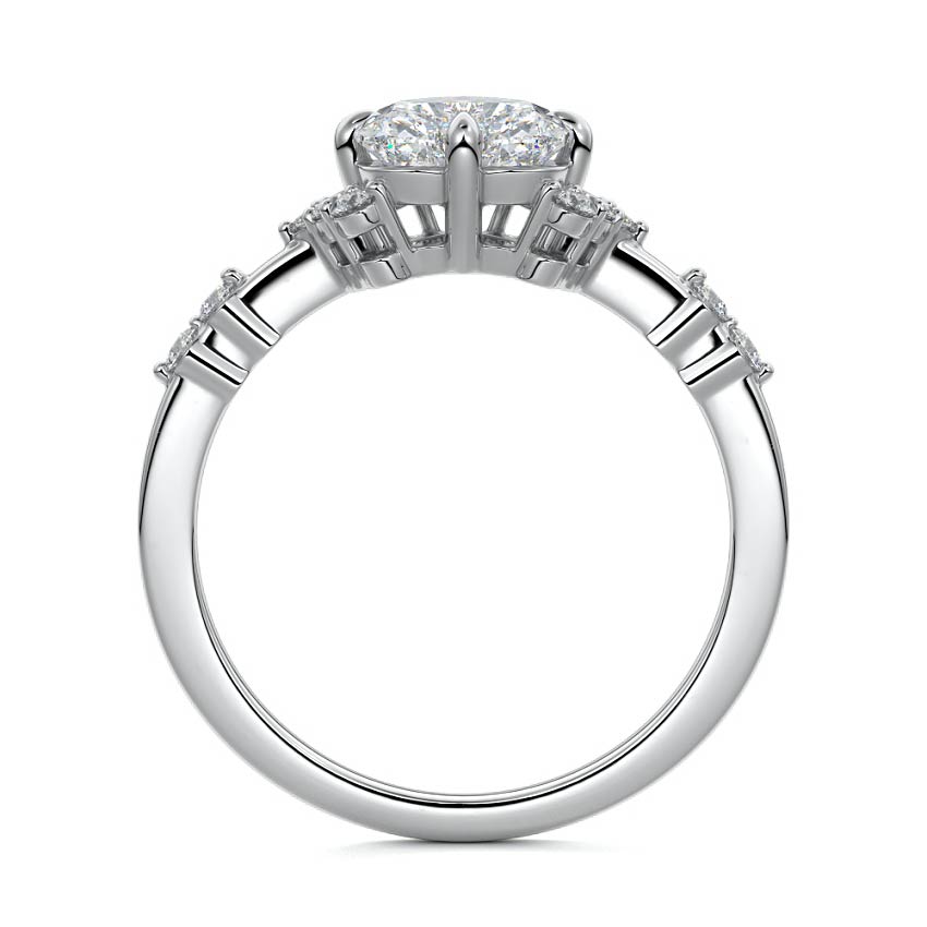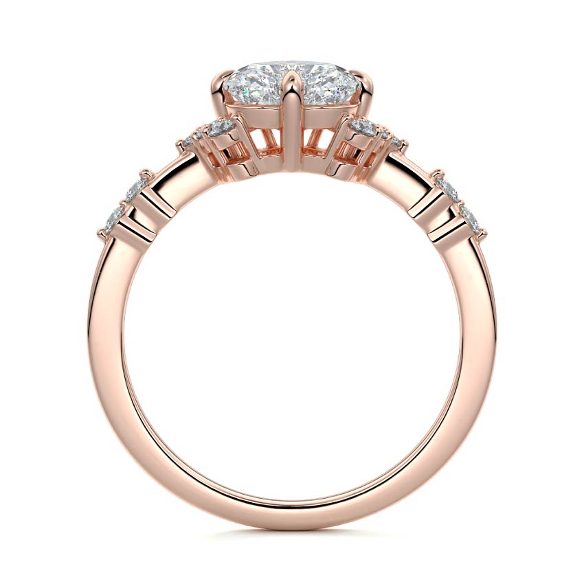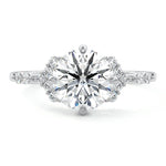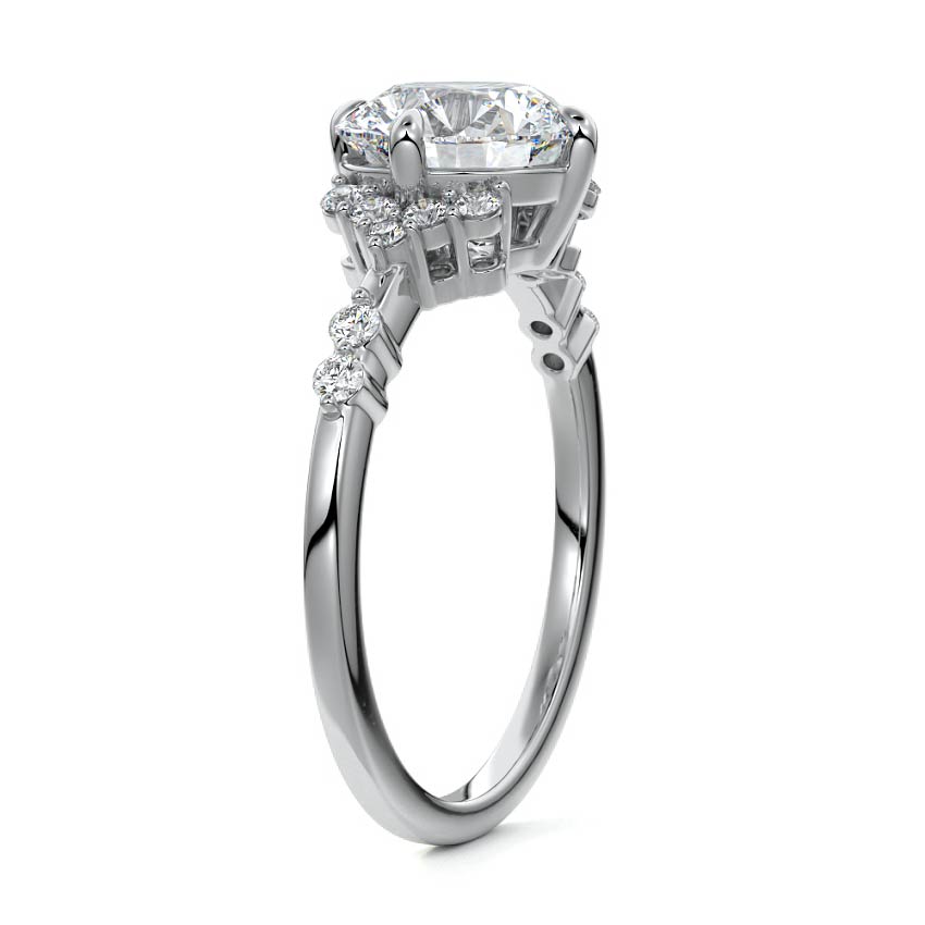 In this ornate ring setting, you'll find an array of diamond accents in various shapes, along with an adorned cluster of diamonds flanking the center stone. These compass-style prongs lend a decorative and ornate quality to the setting.