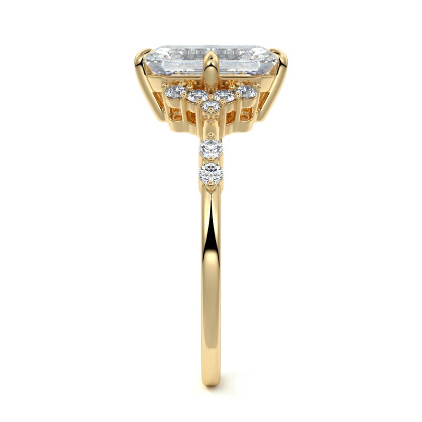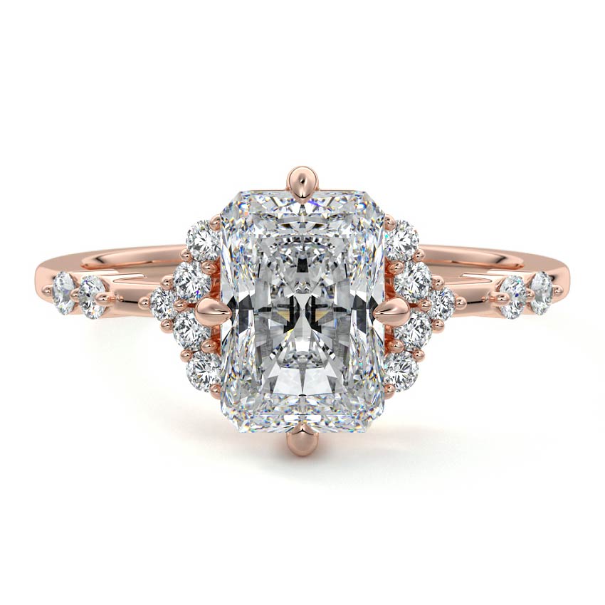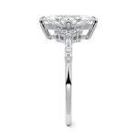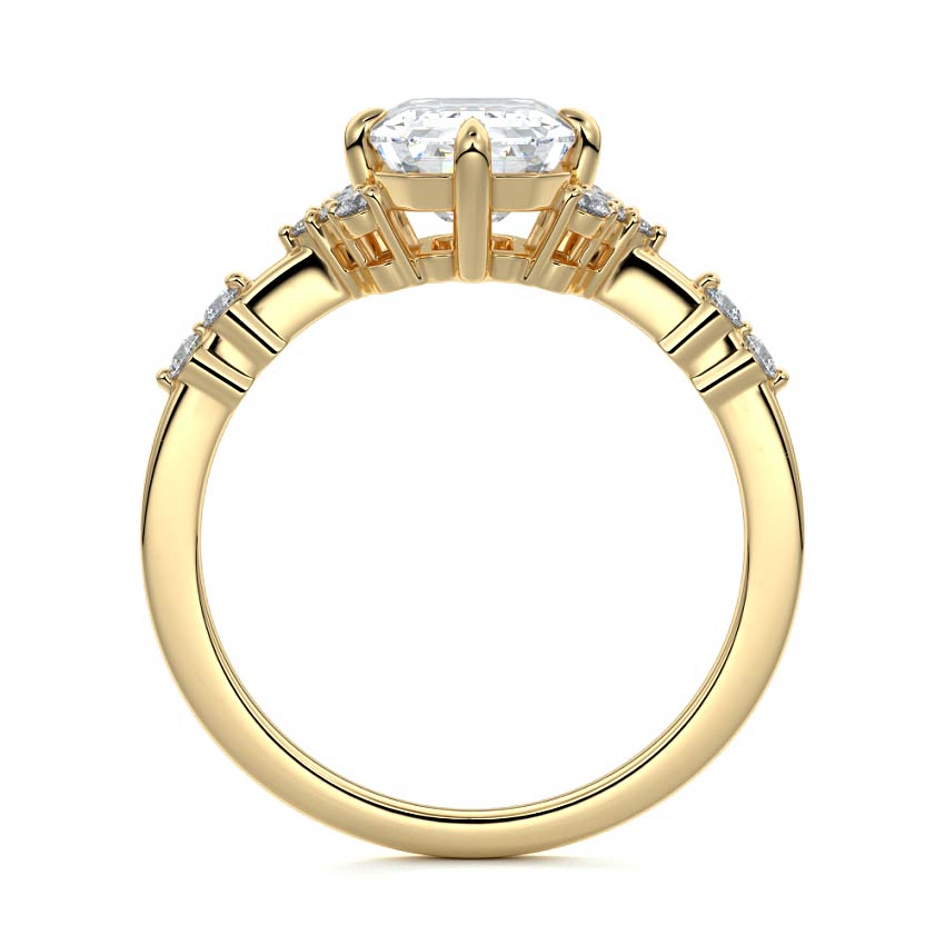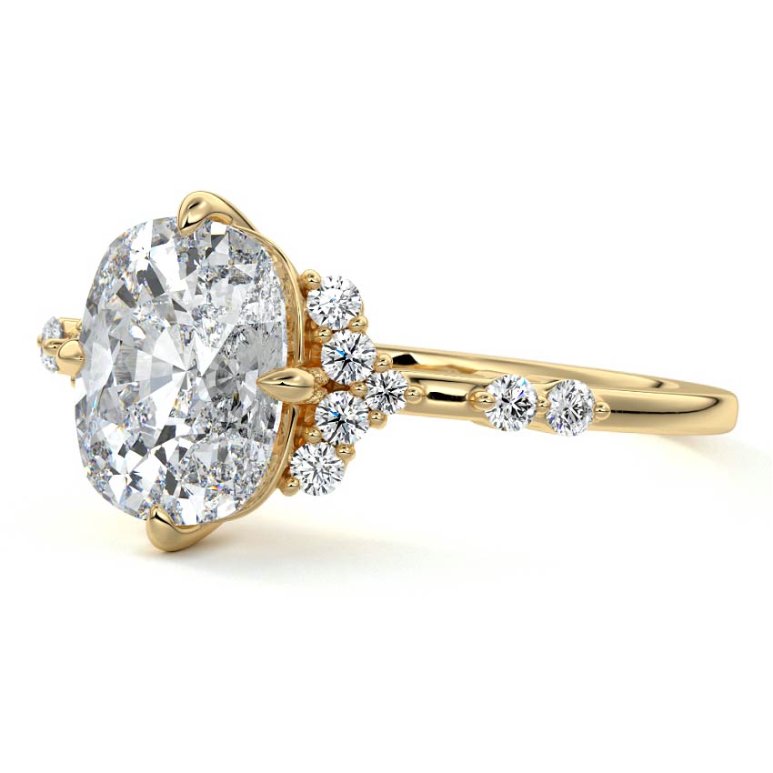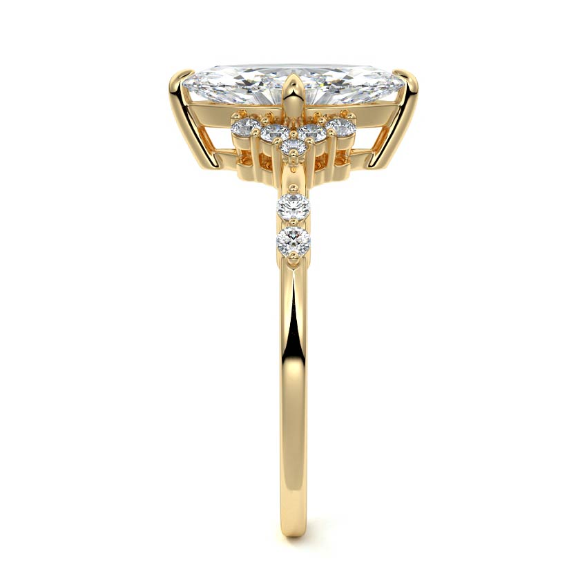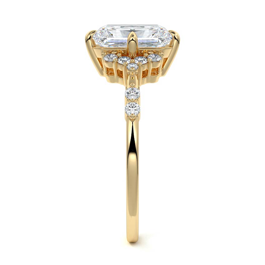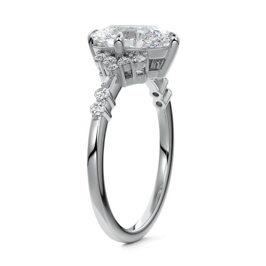 In this ornate ring setting, you'll find an array of diamond accents in various shapes, along with an adorned cluster of diamonds flanking the center stone. These compass-style prongs lend a decorative and ornate quality to the setting.