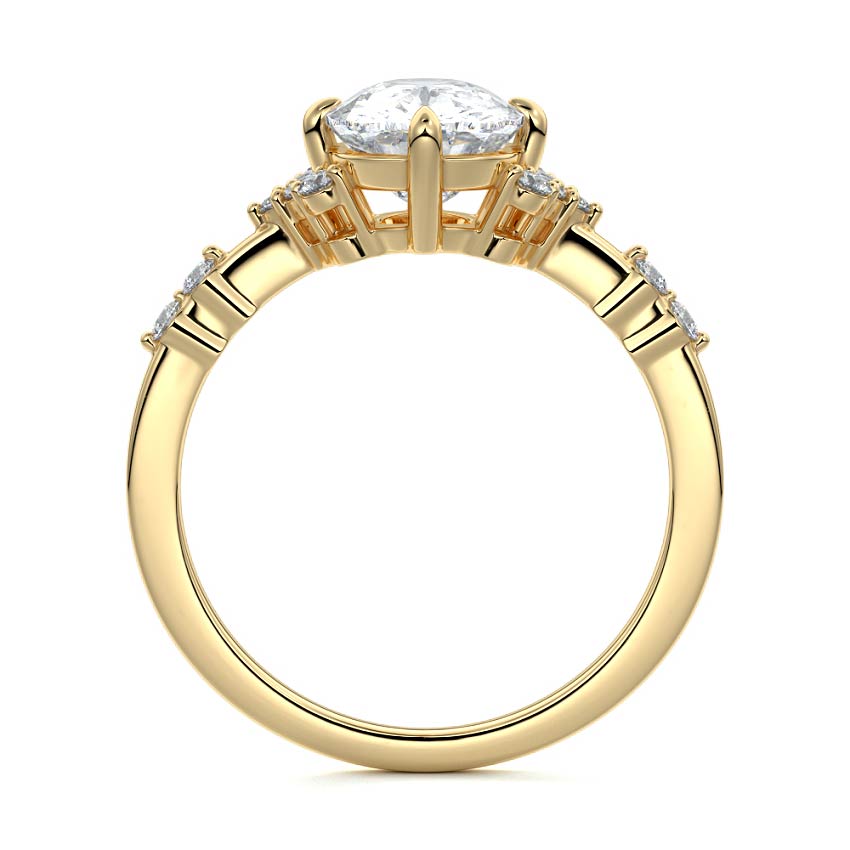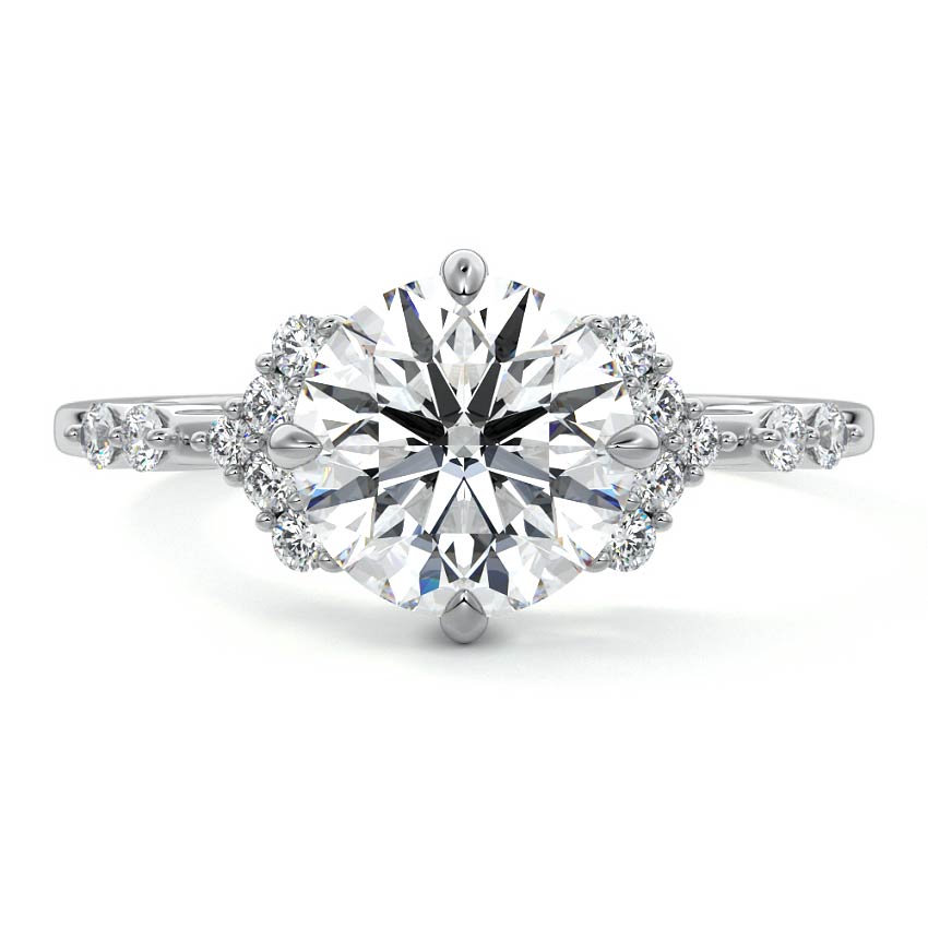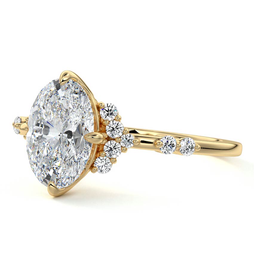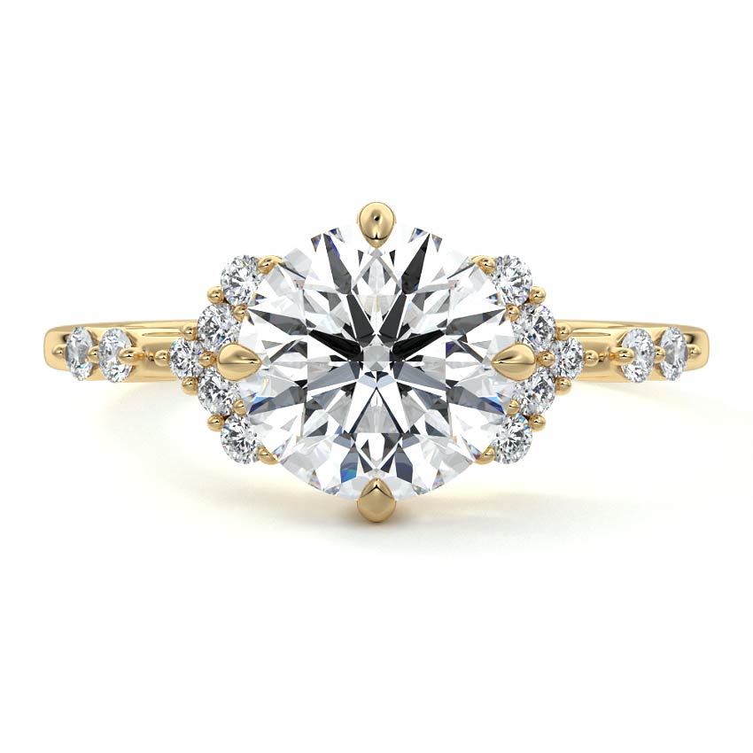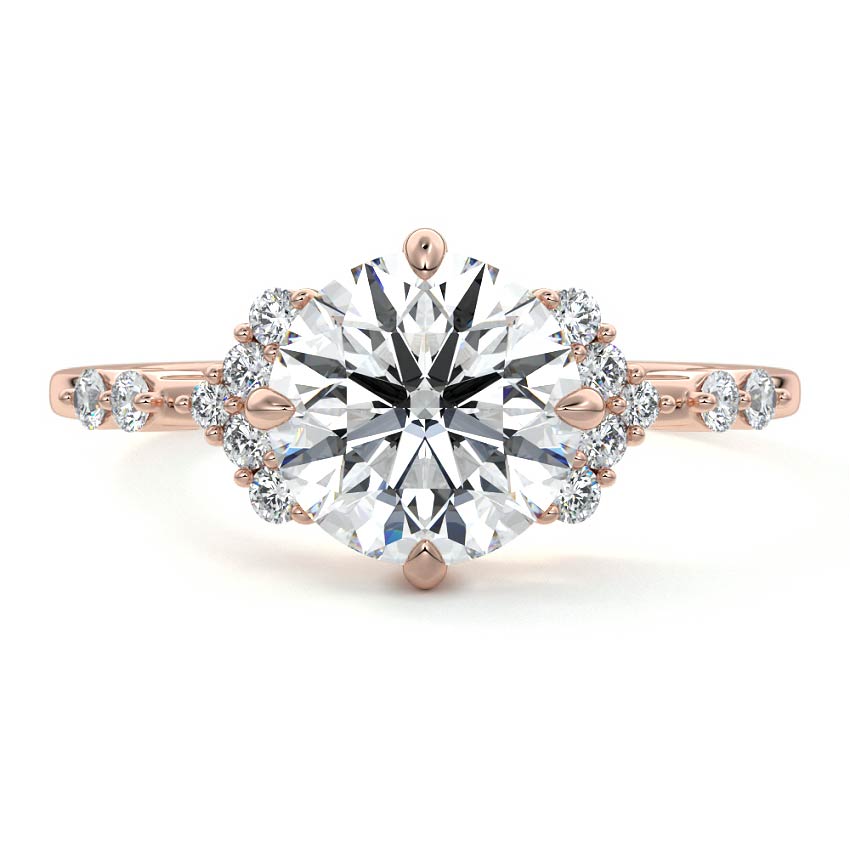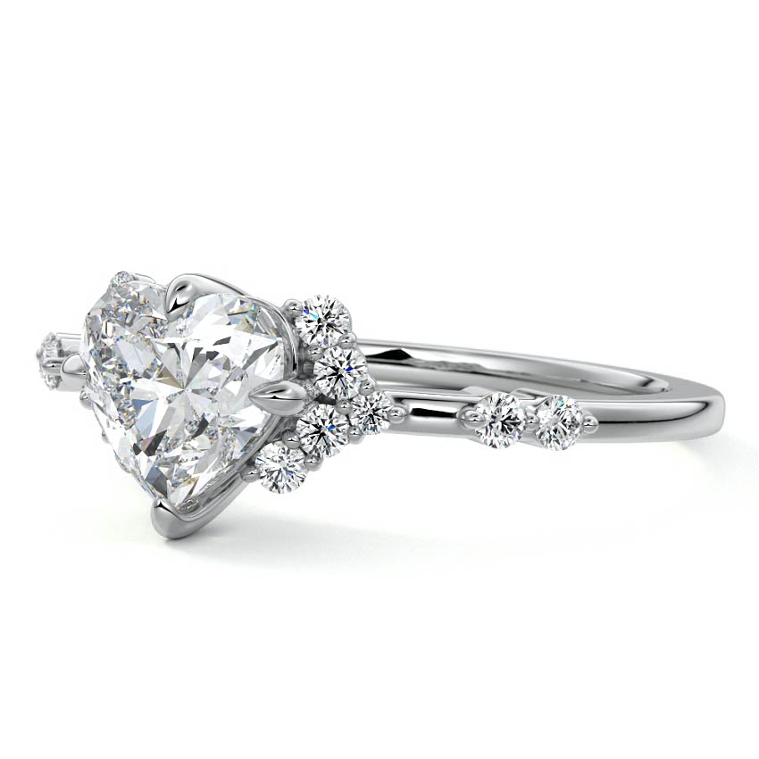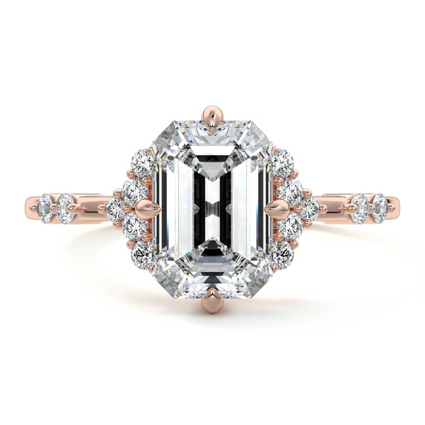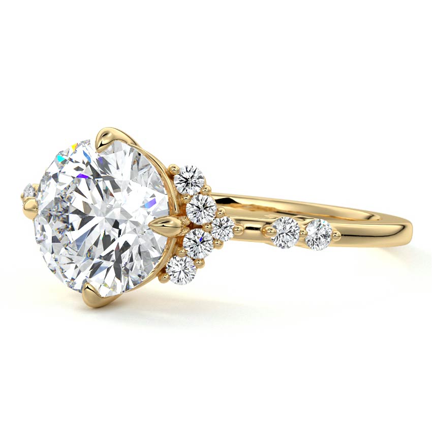 In this ornate ring setting, you'll find an array of diamond accents in various shapes, along with an adorned cluster of diamonds flanking the center stone. These compass-style prongs lend a decorative and ornate quality to the setting.