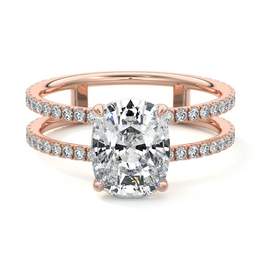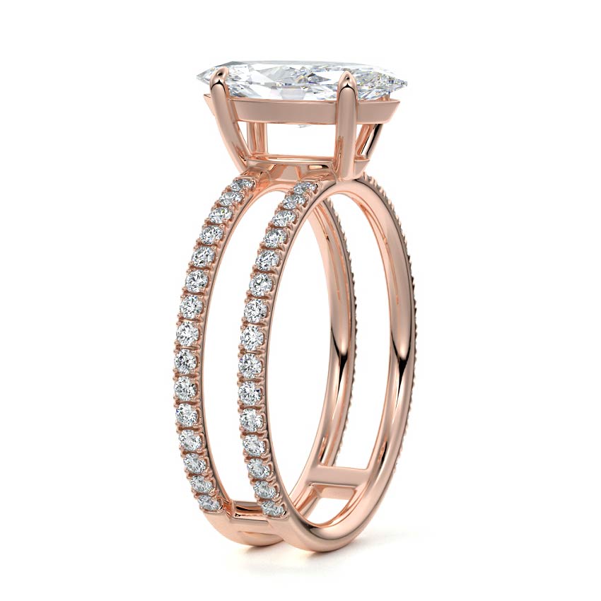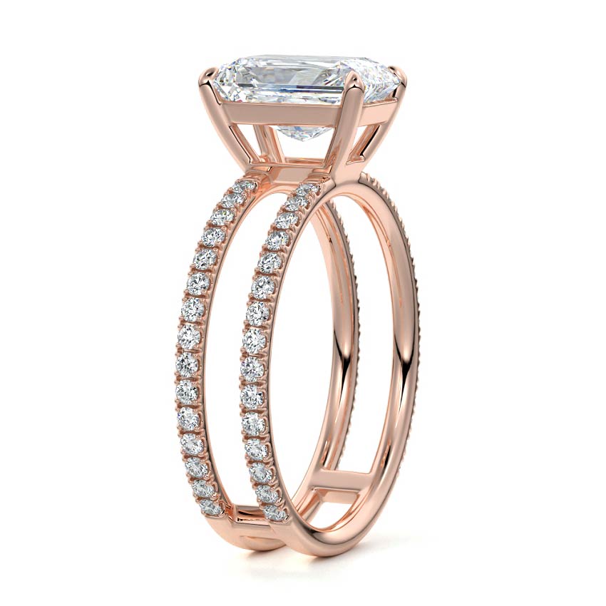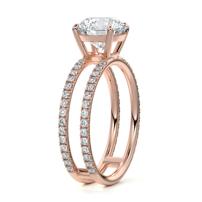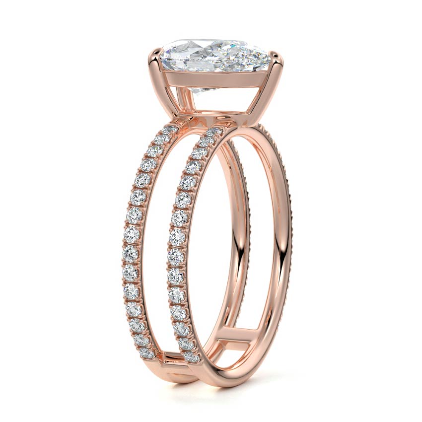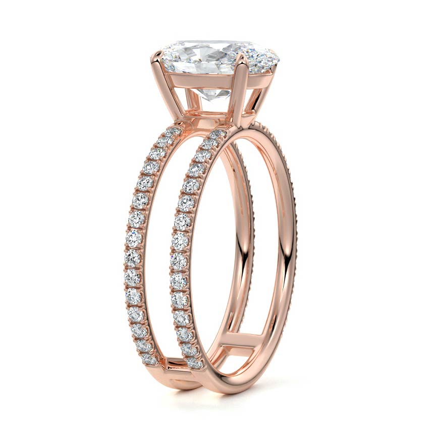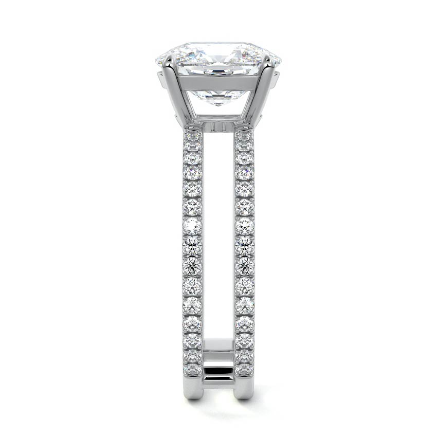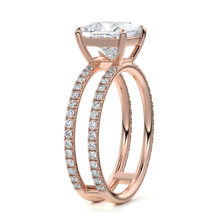 The standout feature of this setting is its double row diamond band. This means that there are two rows of diamonds set along the band of the ring. The double row of diamonds adds extra brilliance, sparkle, and a sense of luxury to the ring.