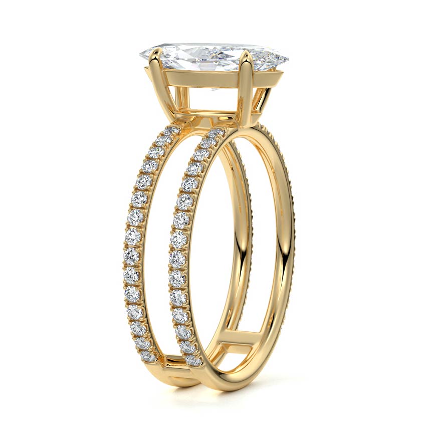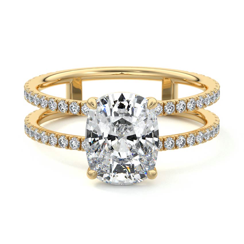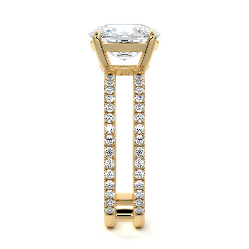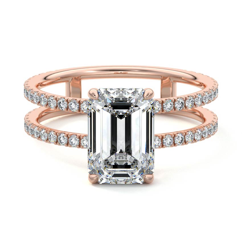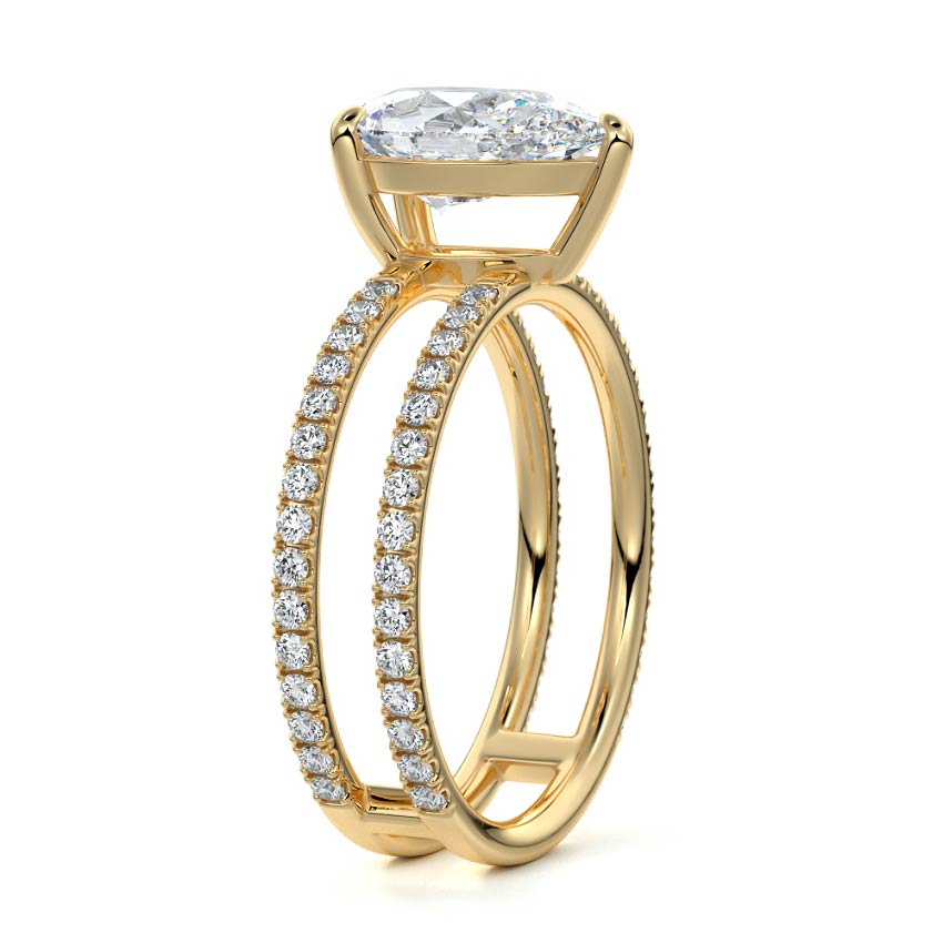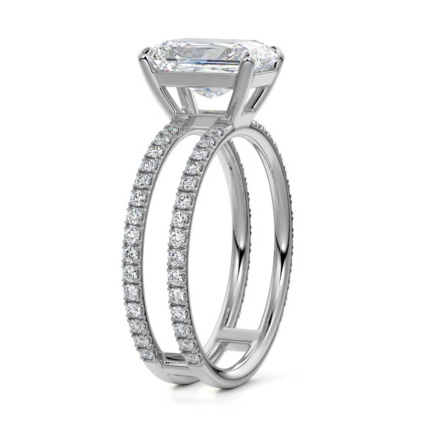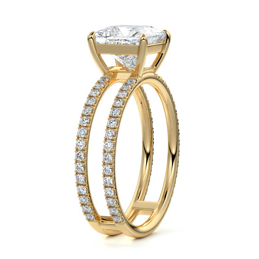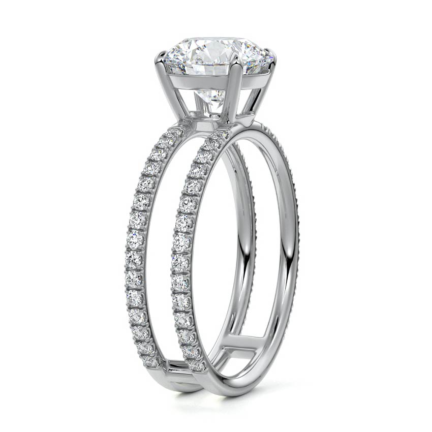 The standout feature of this setting is its double row diamond band. This means that there are two rows of diamonds set along the band of the ring. The double row of diamonds adds extra brilliance, sparkle, and a sense of luxury to the ring.