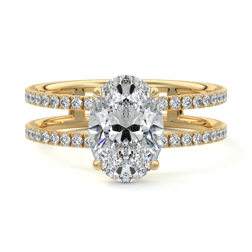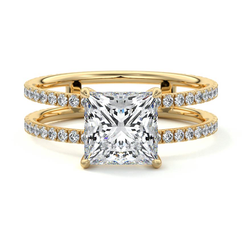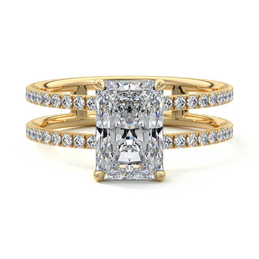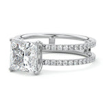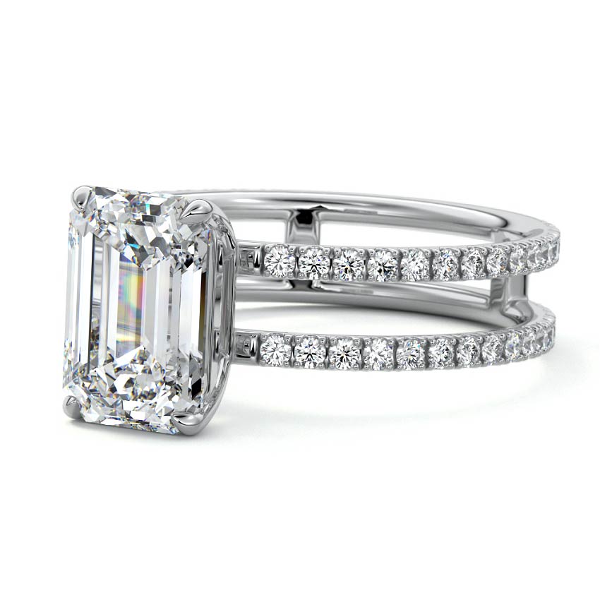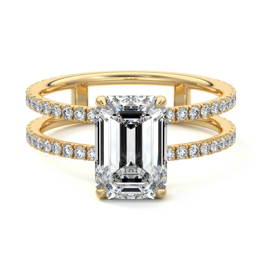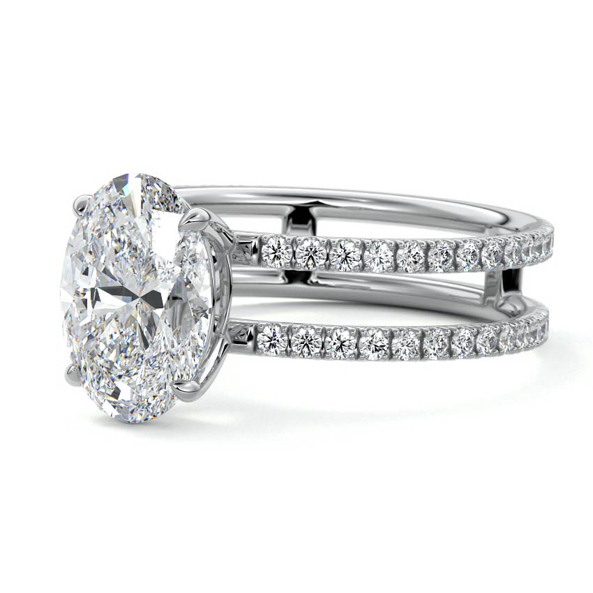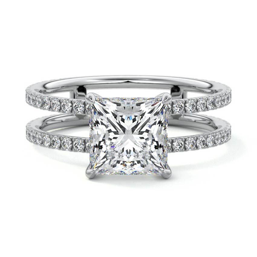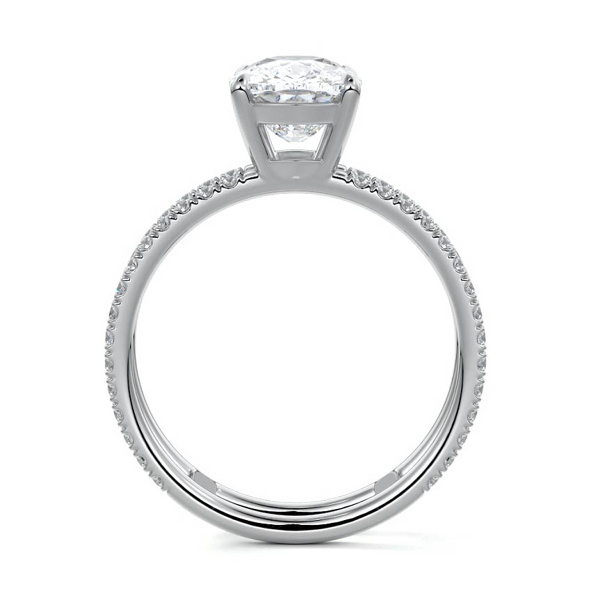 The standout feature of this setting is its double row diamond band. This means that there are two rows of diamonds set along the band of the ring. The double row of diamonds adds extra brilliance, sparkle, and a sense of luxury to the ring.