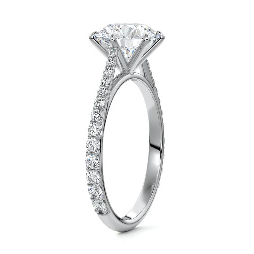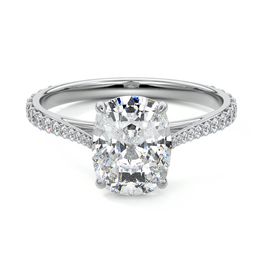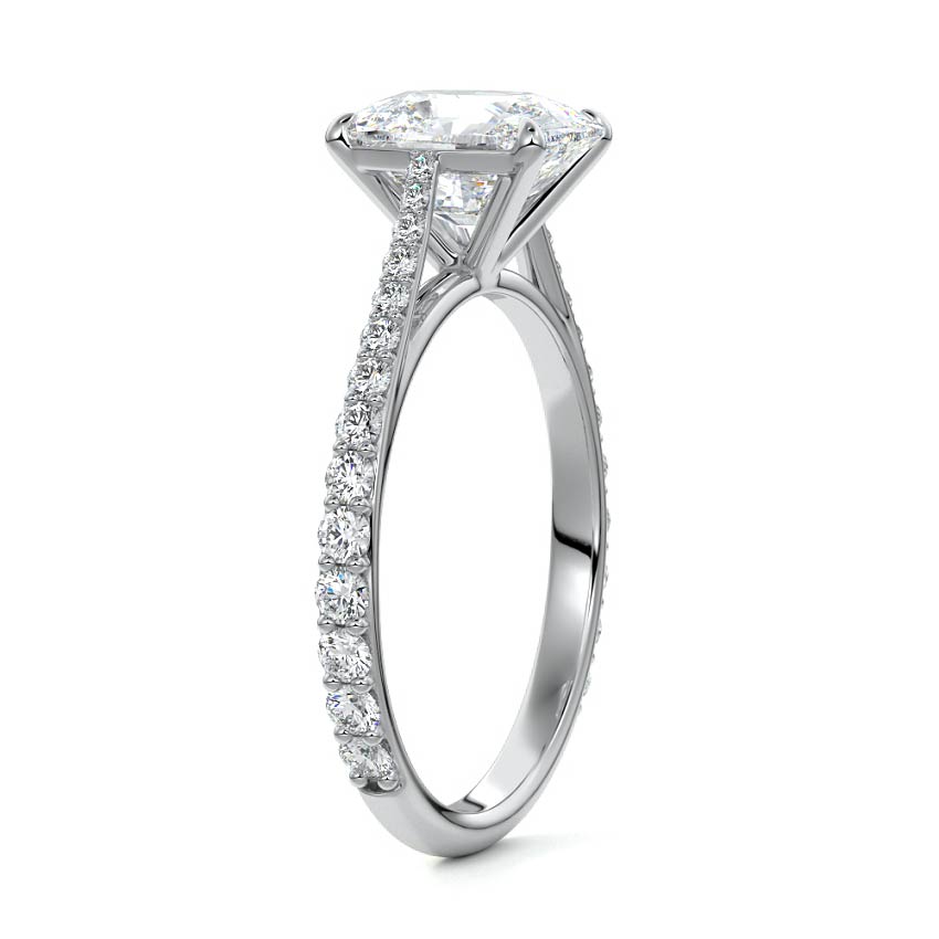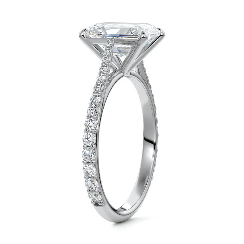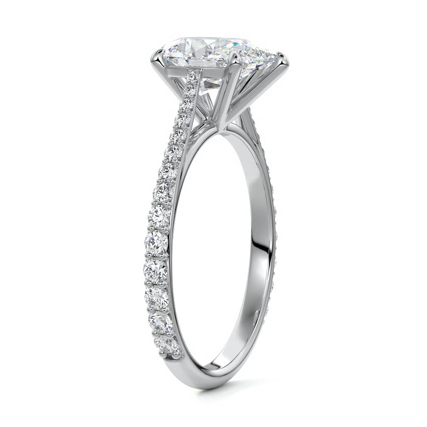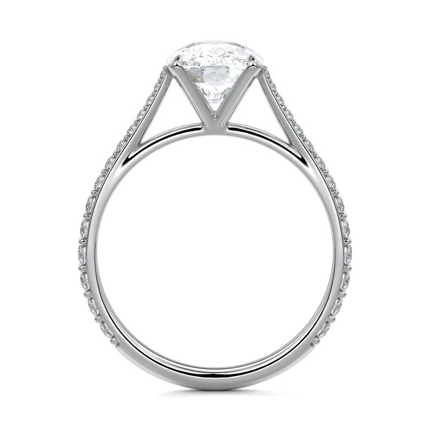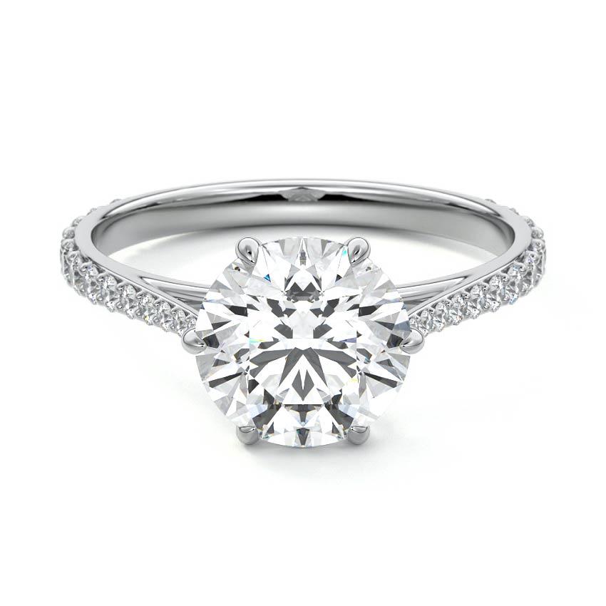 This setting is a striking choice for those who want a balance between a classic solitaire engagement ring and one with added detail and brilliance. The cathedral arches and graduated pave diamonds create a captivating and regal look that is sure to dazzle and delight.