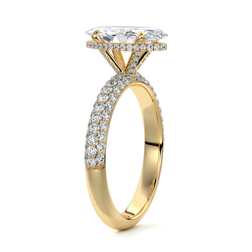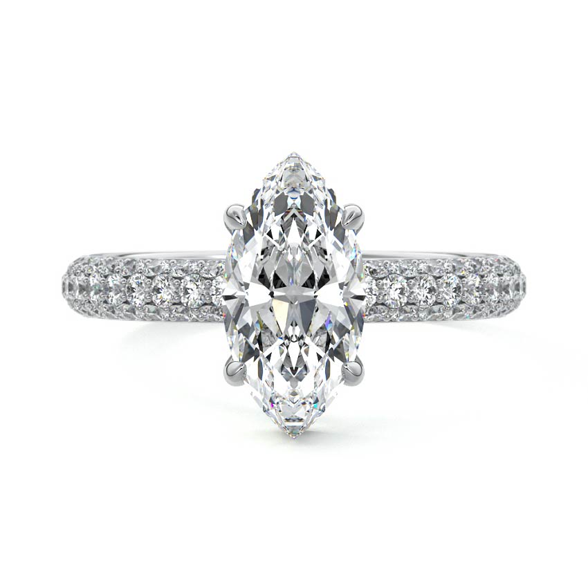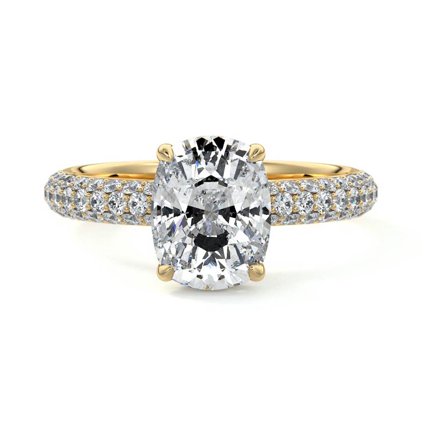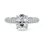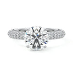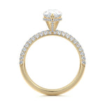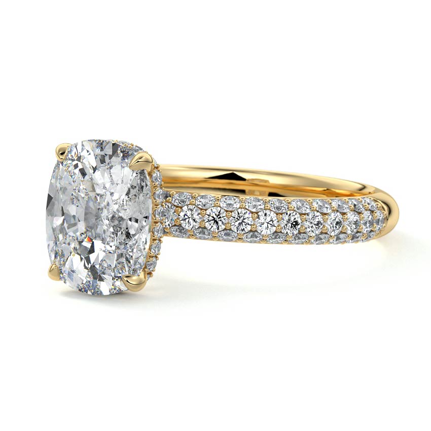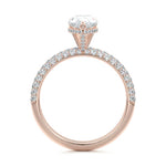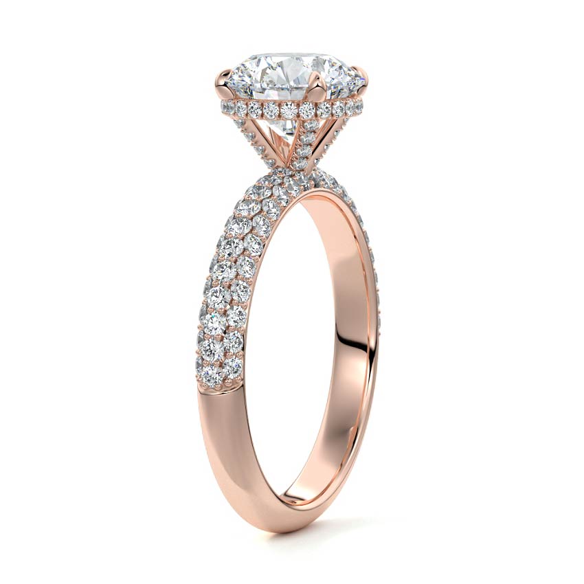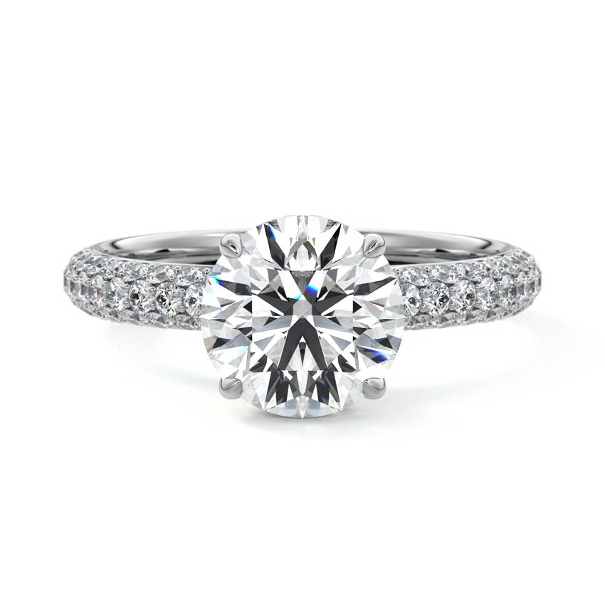 Aveta is an enchanting setting adorned with intricate pave embellishments. This ring boasts three tiers of meticulously pave-set diamonds, gracefully ascending towards a central gemstone held securely by a 4-claw prong setting. Additionally, the prongs themselves are adorned with diamonds, and a concealed halo of pave diamonds adds a touch of elegance to the design, complemented by accent stones on each of the four prongs.