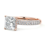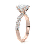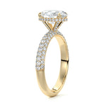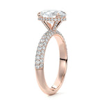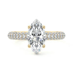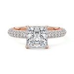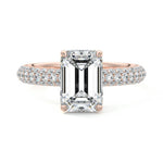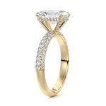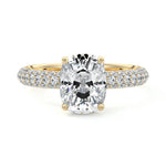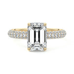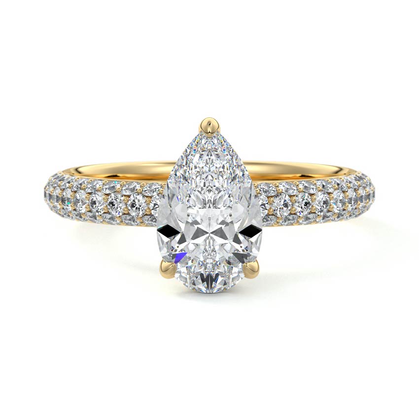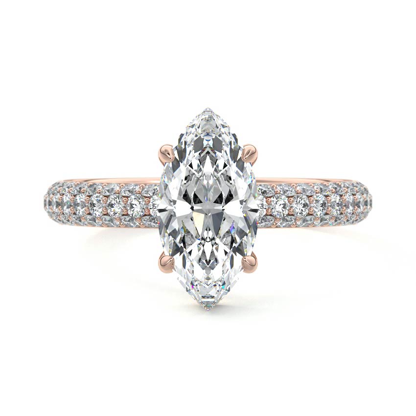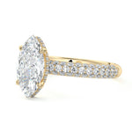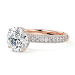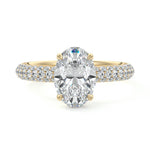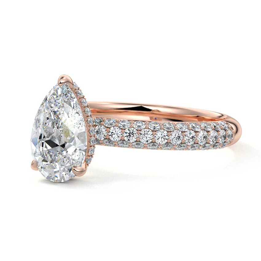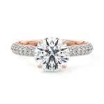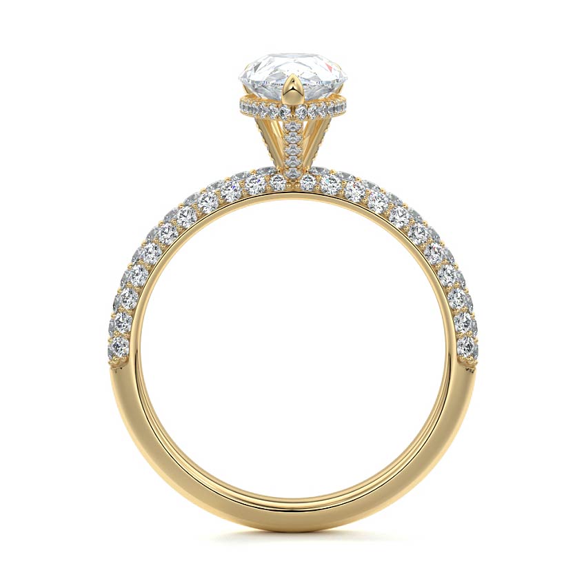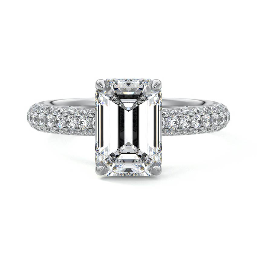 Aveta is an enchanting setting adorned with intricate pave embellishments. This ring boasts three tiers of meticulously pave-set diamonds, gracefully ascending towards a central gemstone held securely by a 4-claw prong setting. Additionally, the prongs themselves are adorned with diamonds, and a concealed halo of pave diamonds adds a touch of elegance to the design, complemented by accent stones on each of the four prongs.
