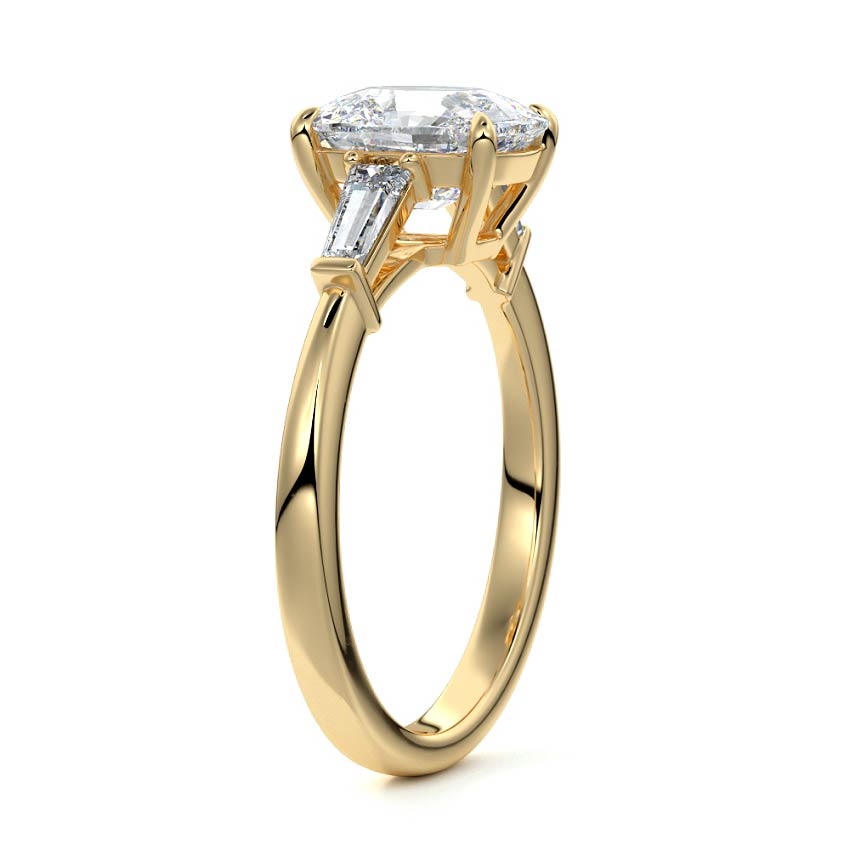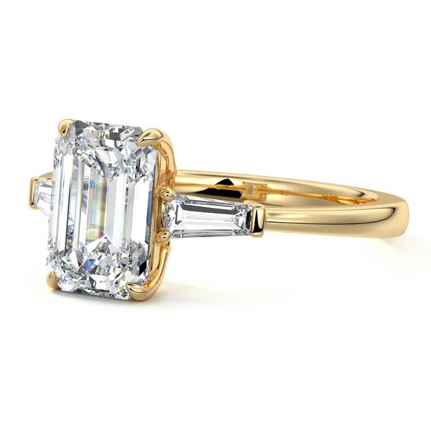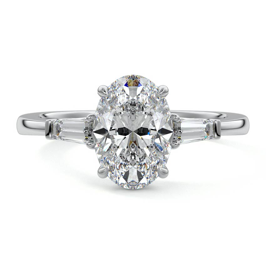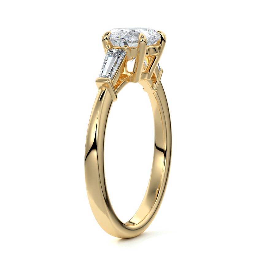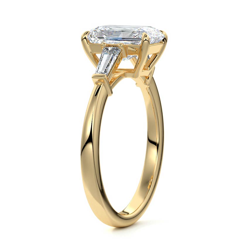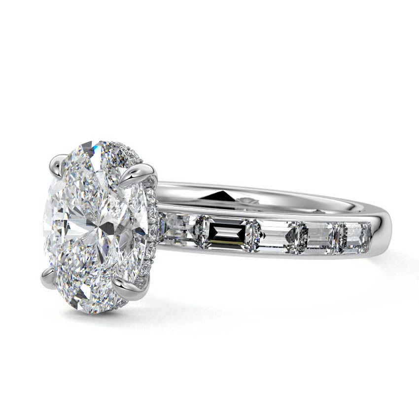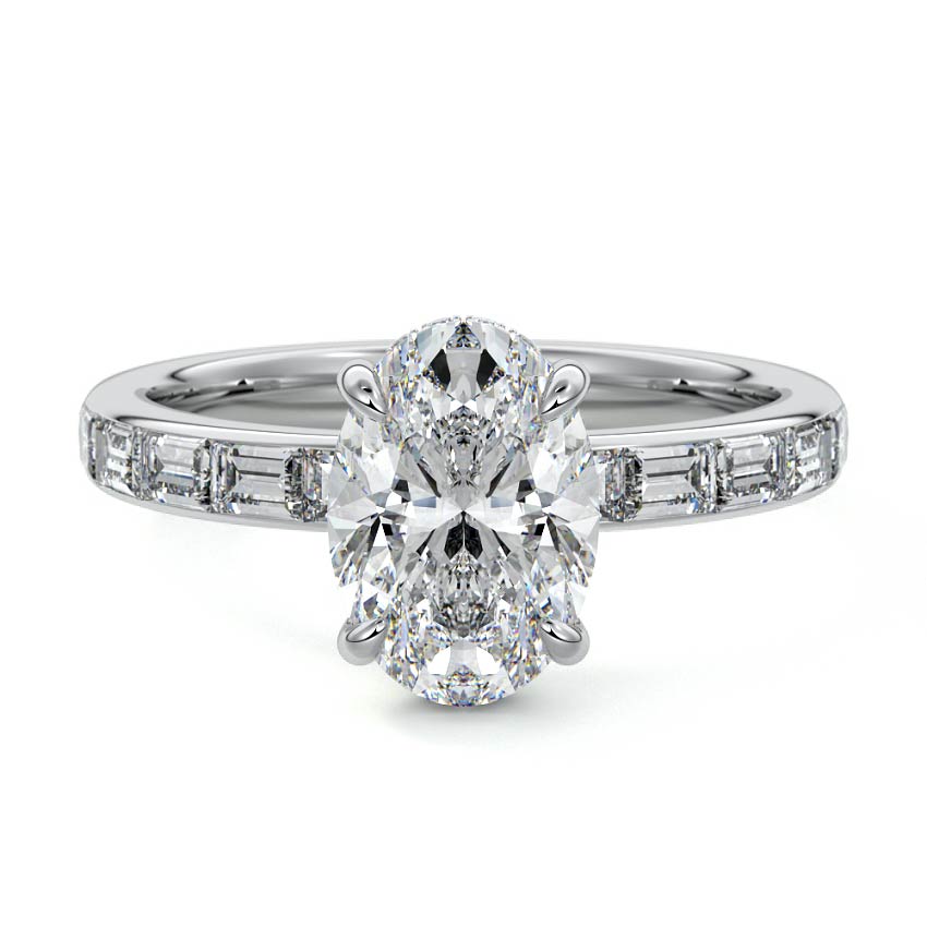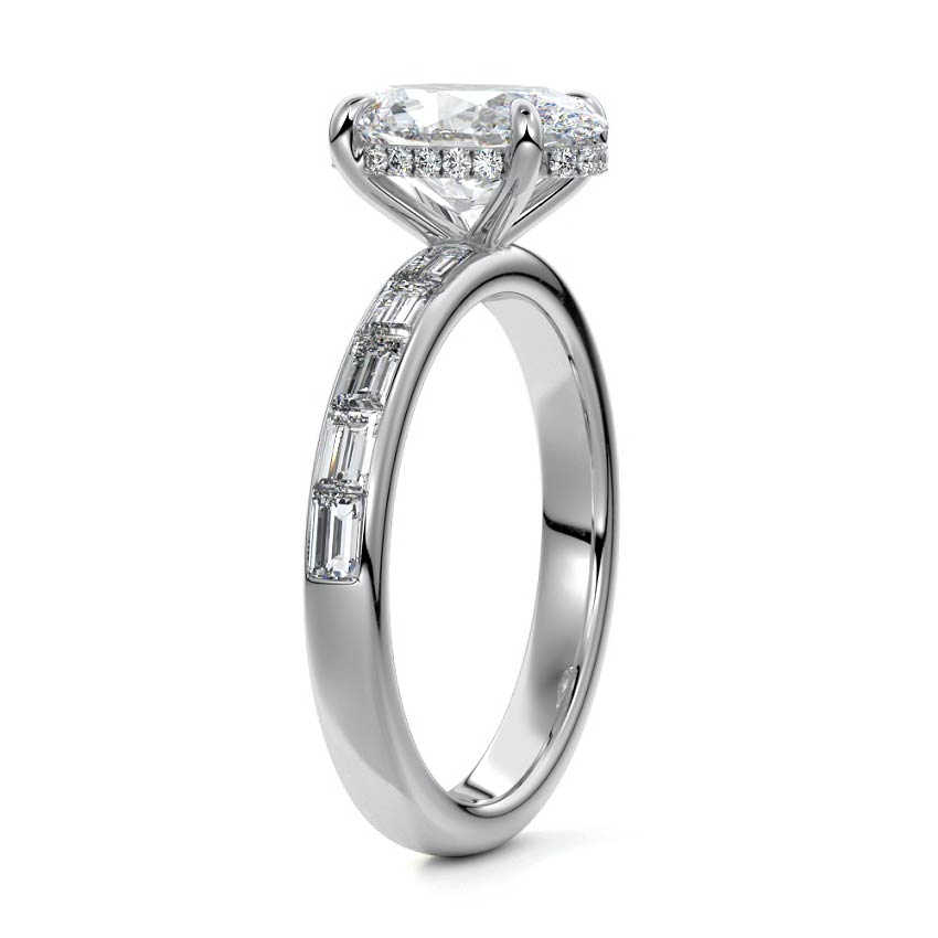 The baguette-cut stones, characterized by their rectangular shape and step-cut facets, offer a sleek and contemporary aesthetic, embodying timeless beauty in a streamlined design.