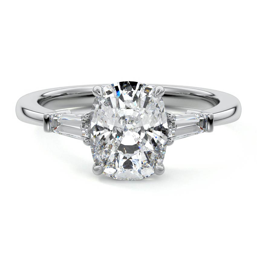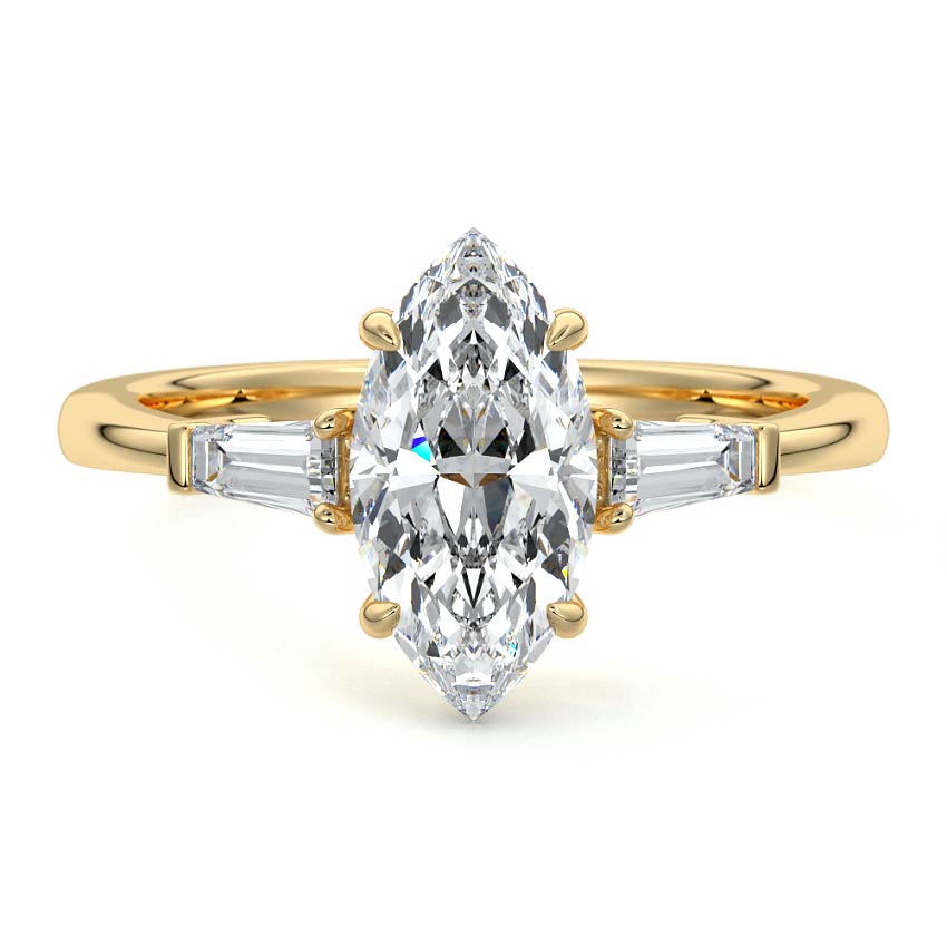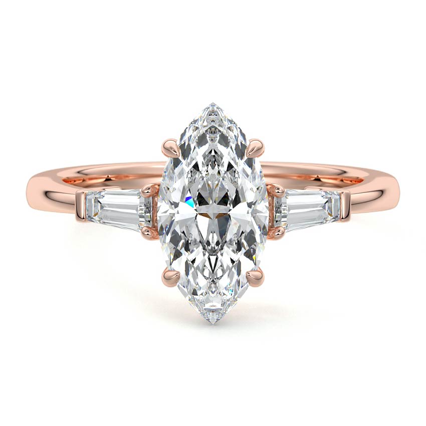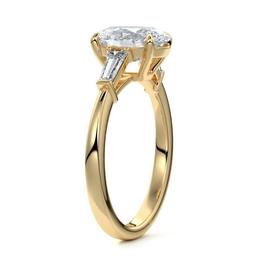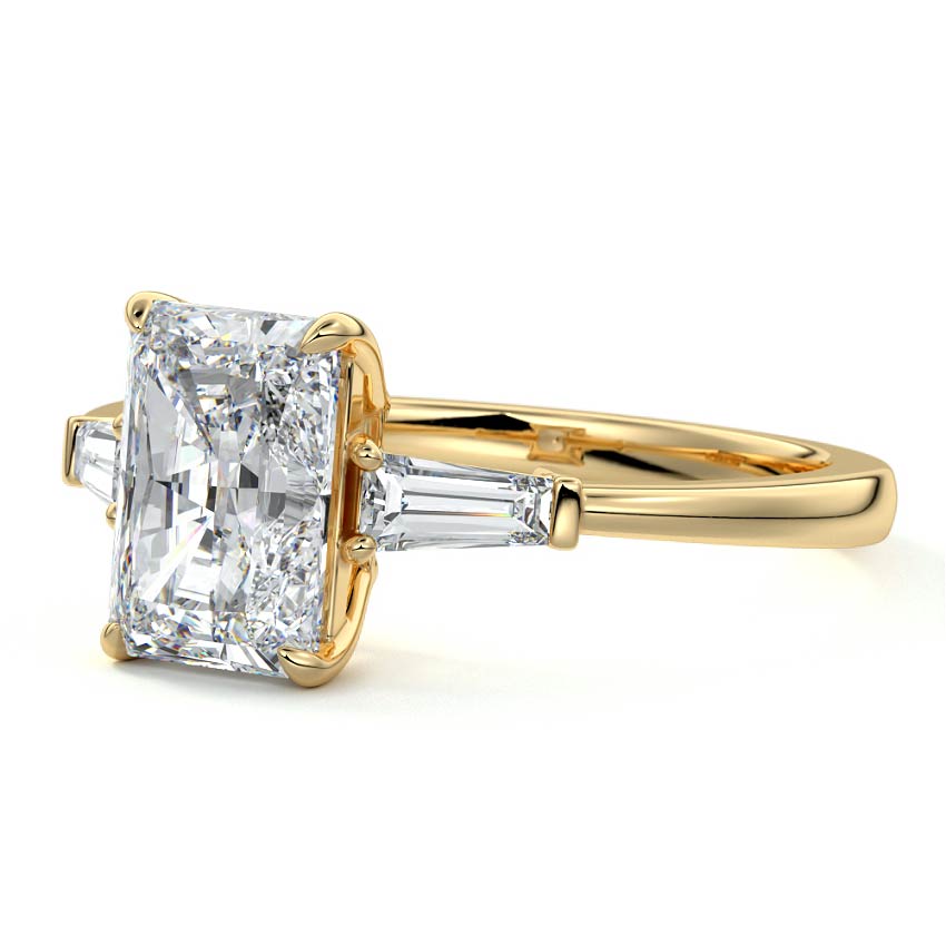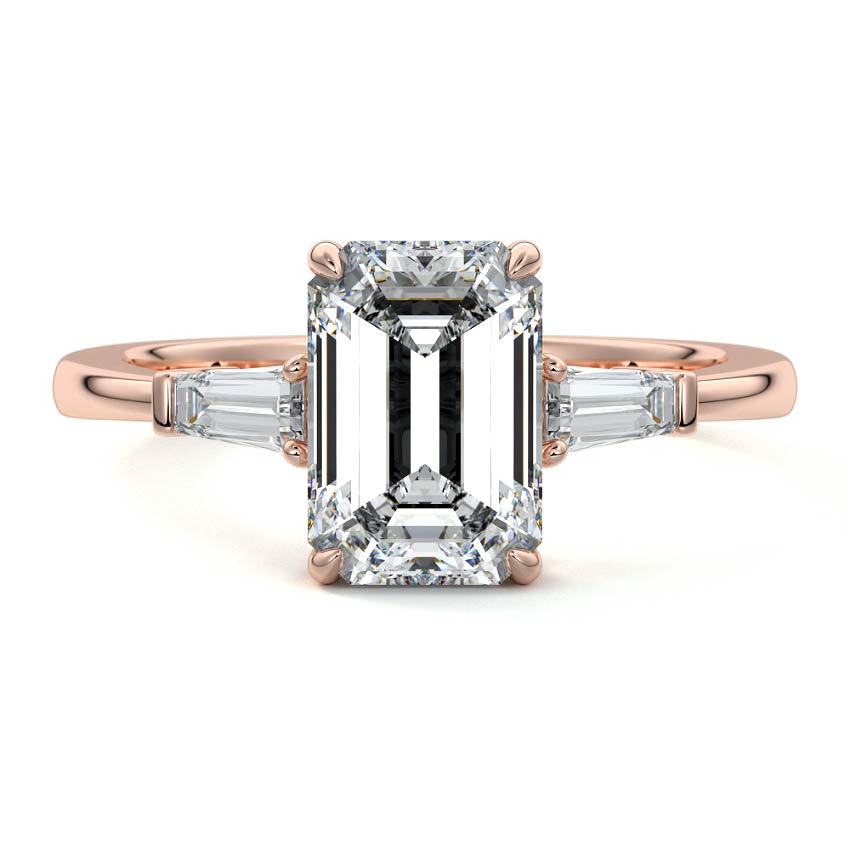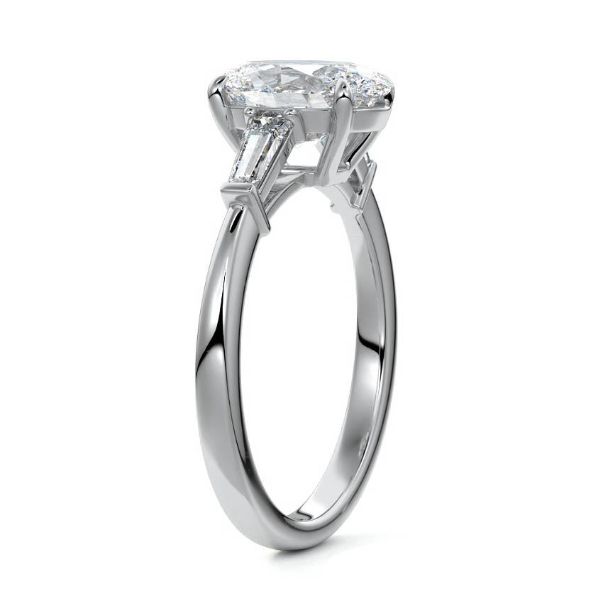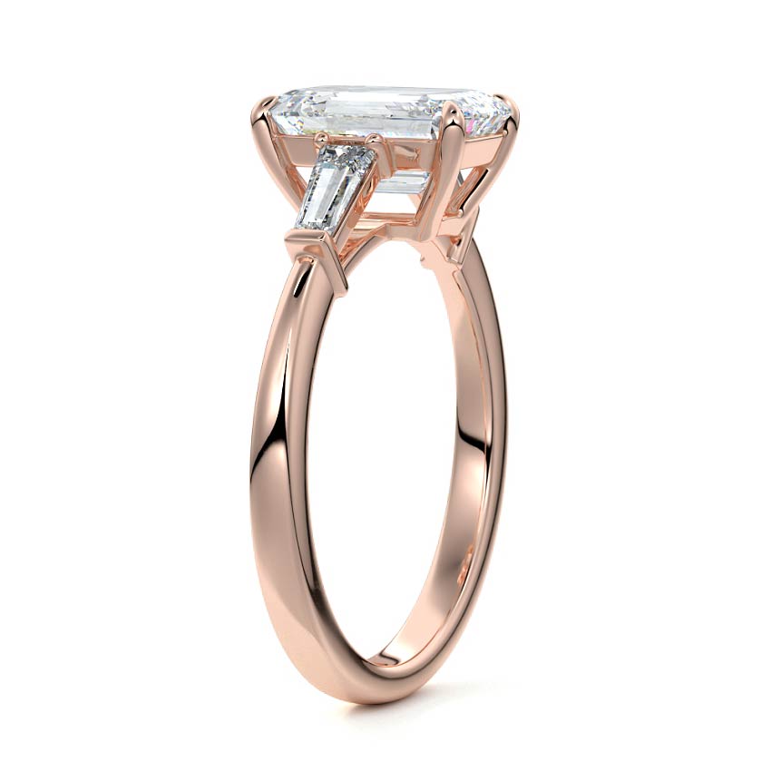 The baguette-cut stones, characterized by their rectangular shape and step-cut facets, offer a sleek and contemporary aesthetic, embodying timeless beauty in a streamlined design.