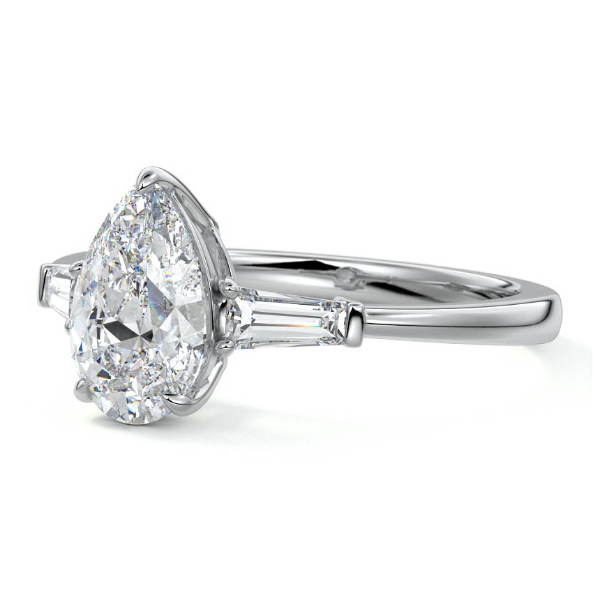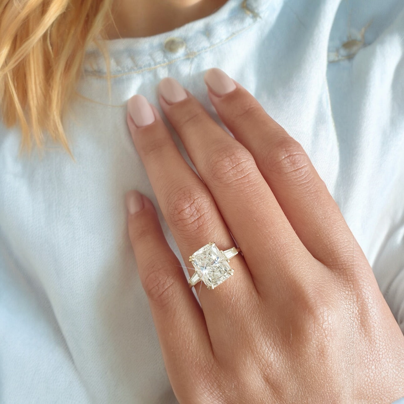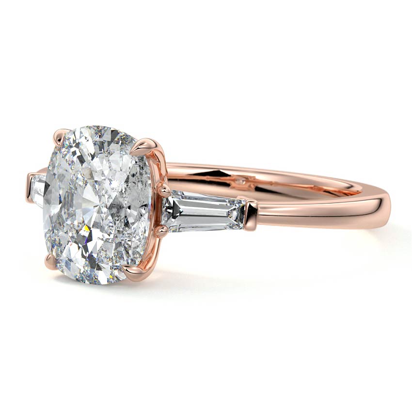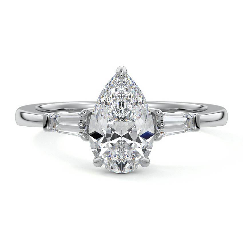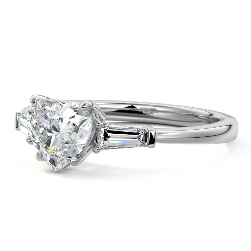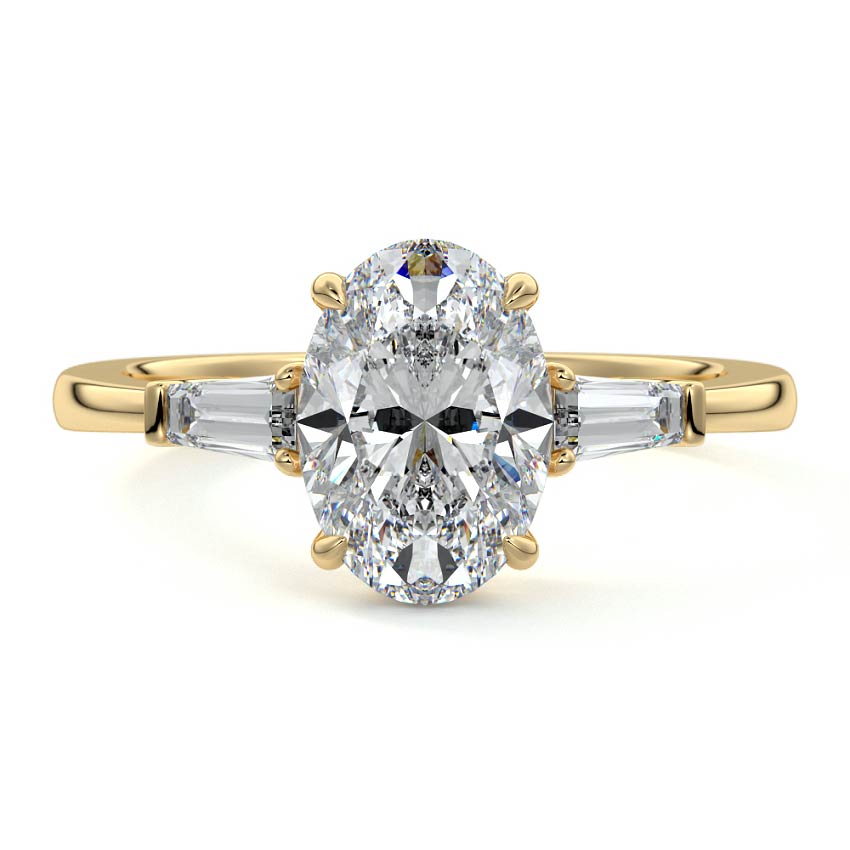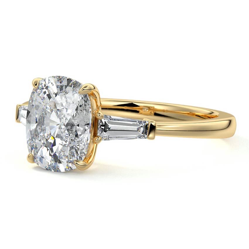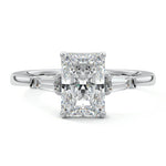 The baguette-cut stones, characterized by their rectangular shape and step-cut facets, offer a sleek and contemporary aesthetic, embodying timeless beauty in a streamlined design.
