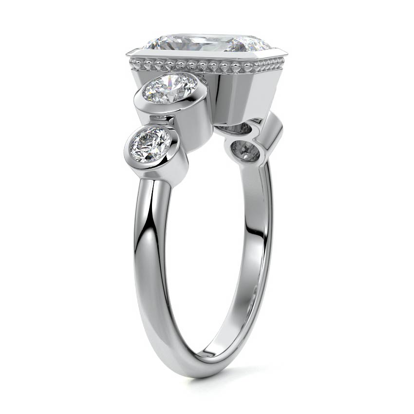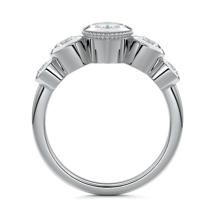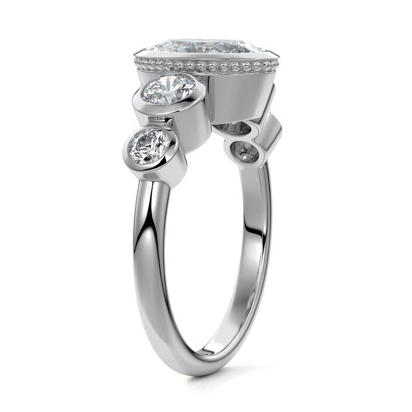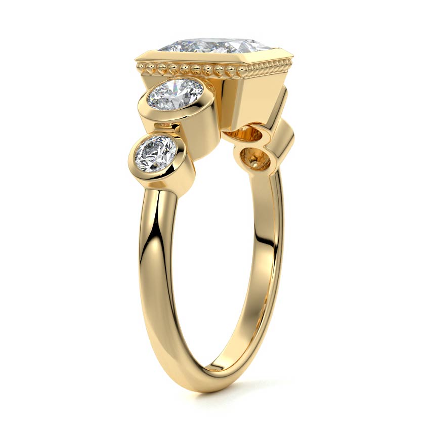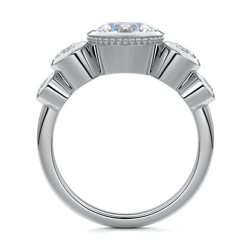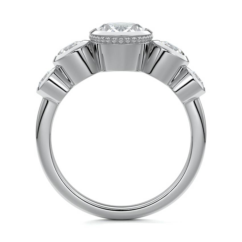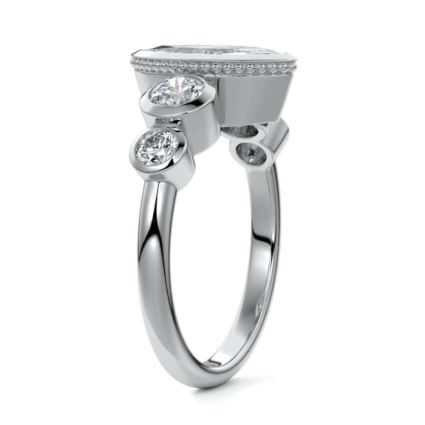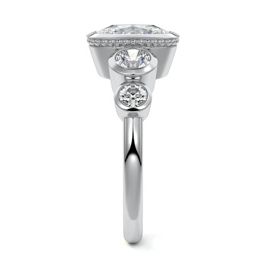 This setting is a sophisticated and refined choice for those who appreciate the combination of classic design elements with intricate detailing. It offers a timeless and elegant look that can hold special meaning with the choice of gemstones and metal, making it a cherished piece of jewelry.
