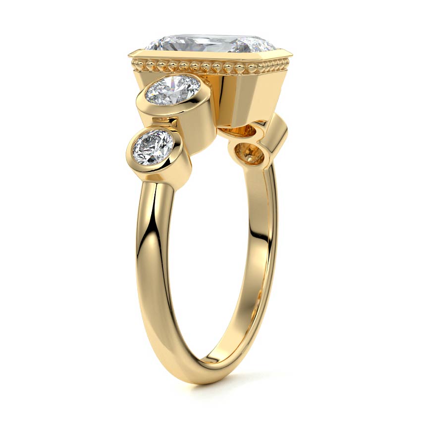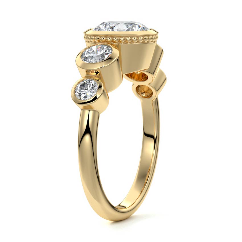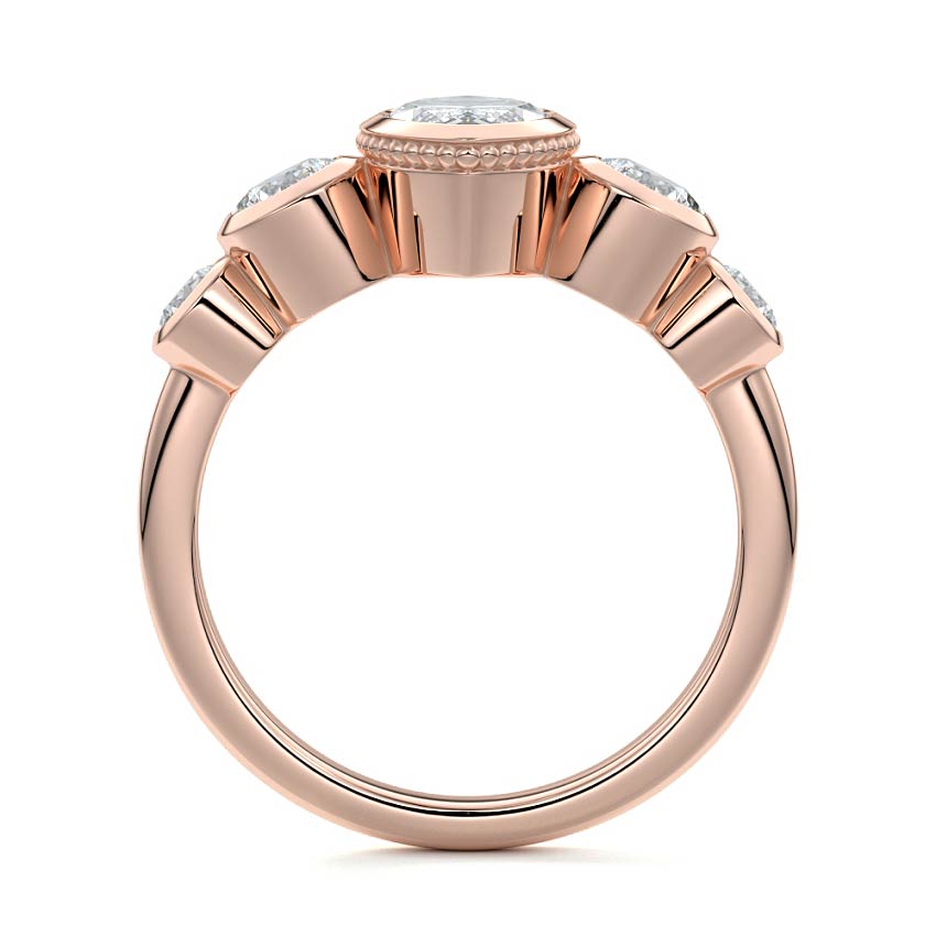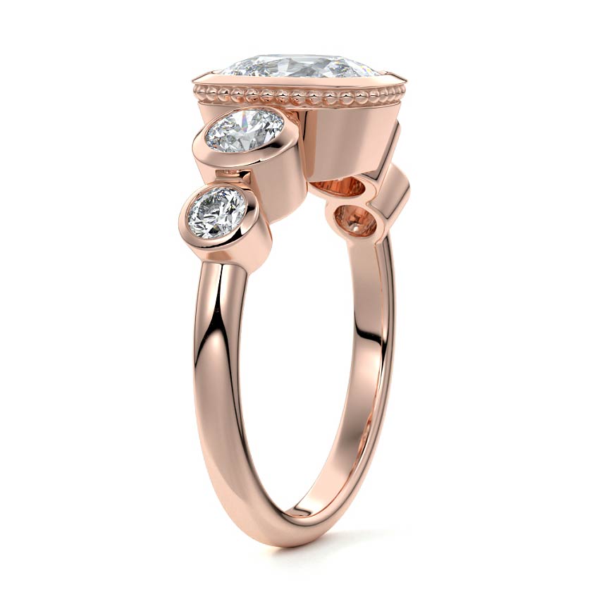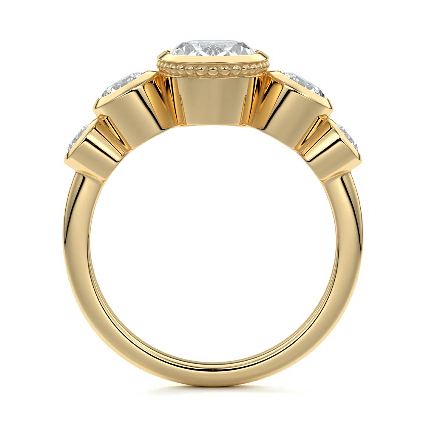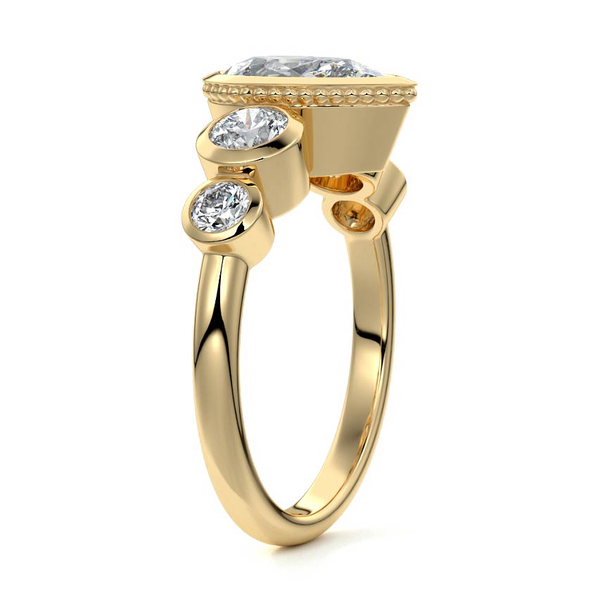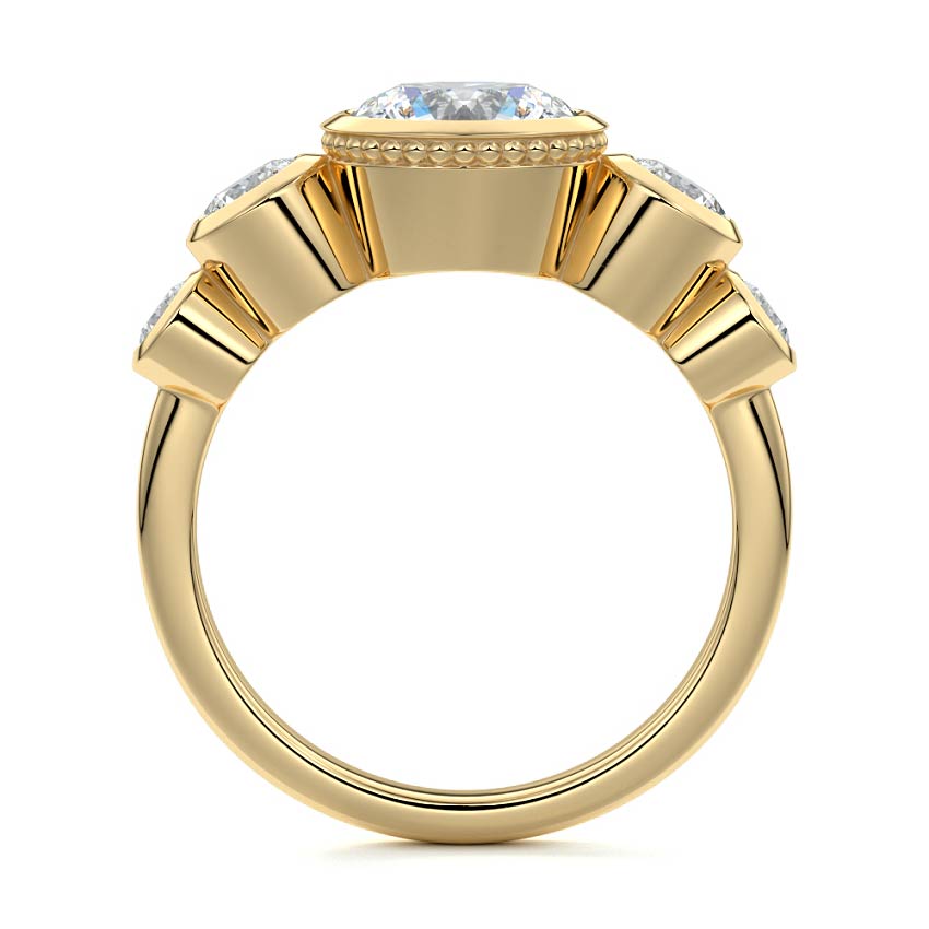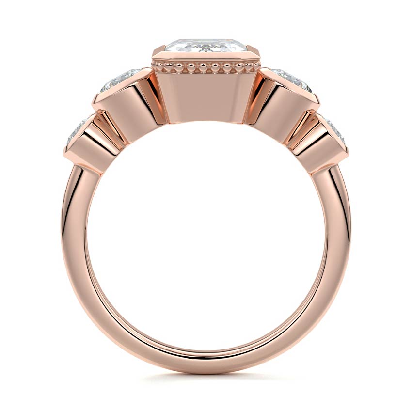 This setting is a sophisticated and refined choice for those who appreciate the combination of classic design elements with intricate detailing. It offers a timeless and elegant look that can hold special meaning with the choice of gemstones and metal, making it a cherished piece of jewelry.