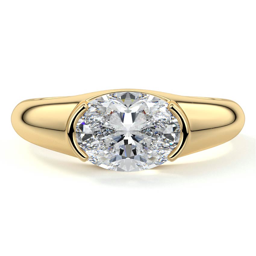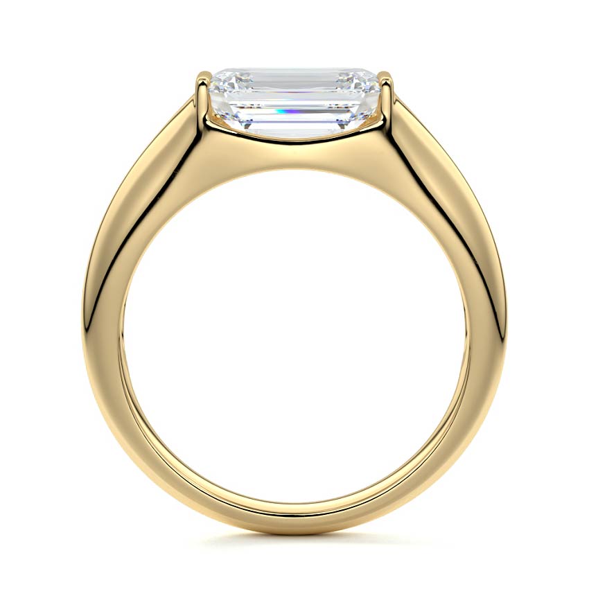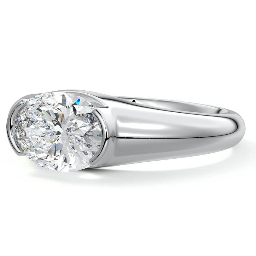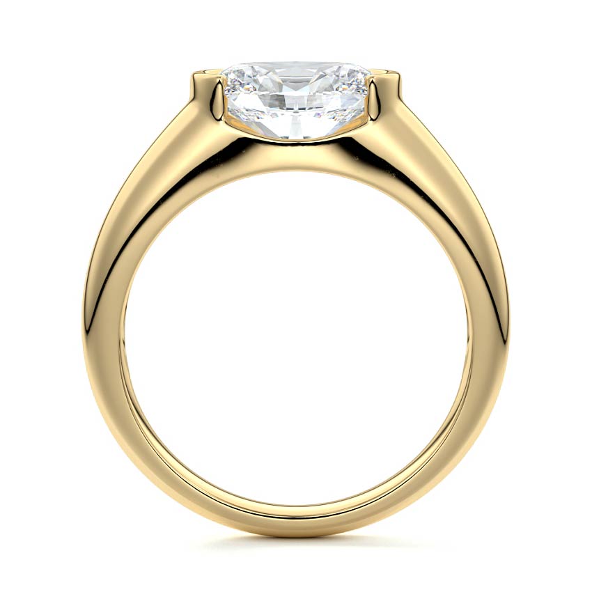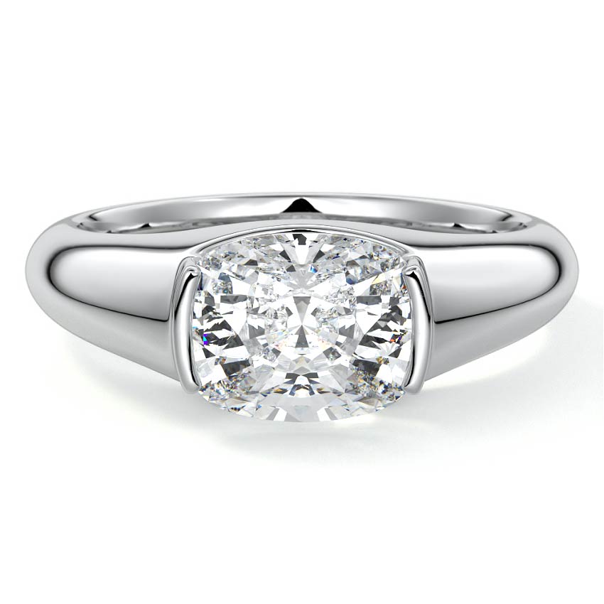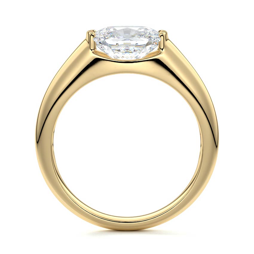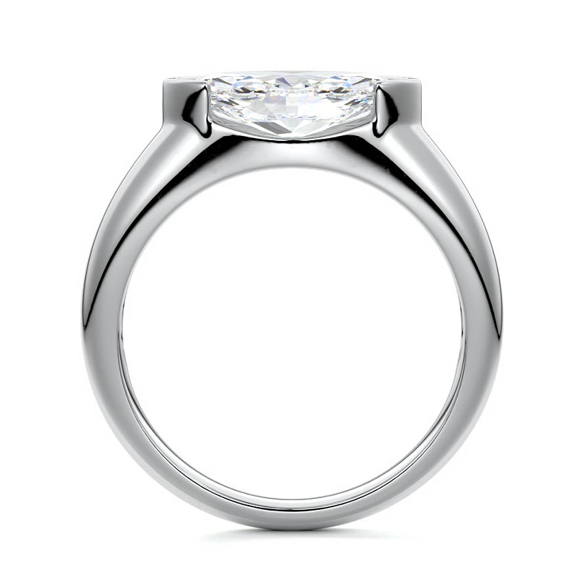 This setting with an East-to-West set center diamond is a contemporary and eye-catching choice that is perfect for those who appreciate modern design with a twist. Its half bezel setting and east-to-west orientation create a fresh and unconventional look, while the chunky band adds a touch of boldness and confidence.