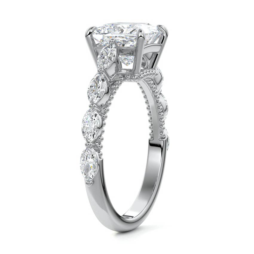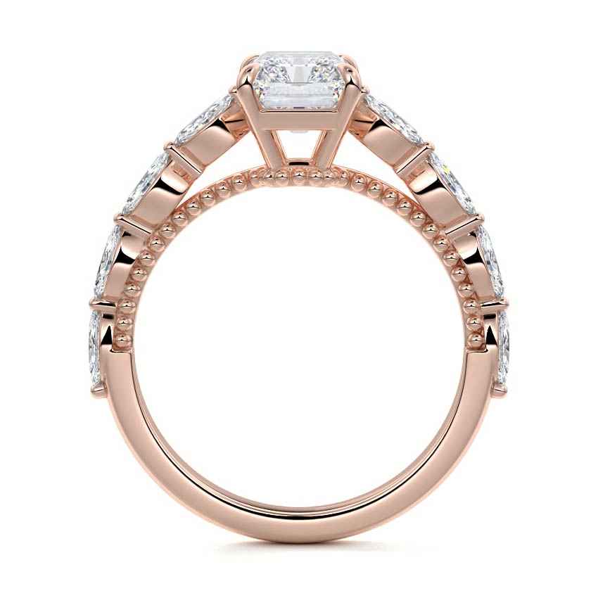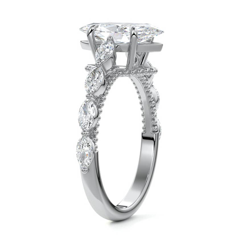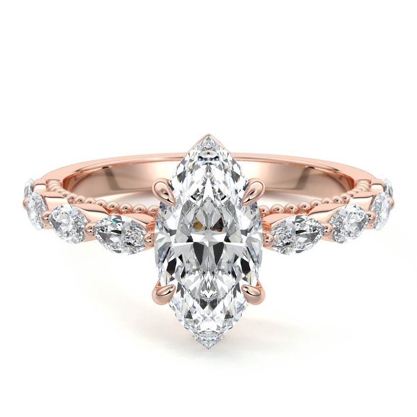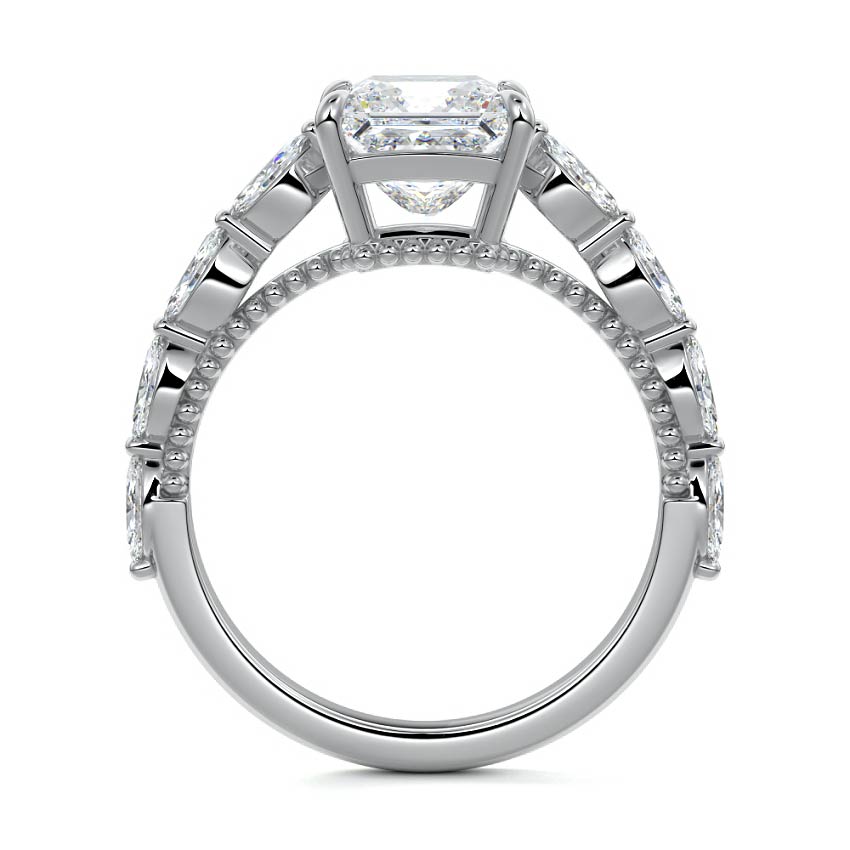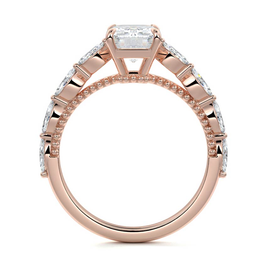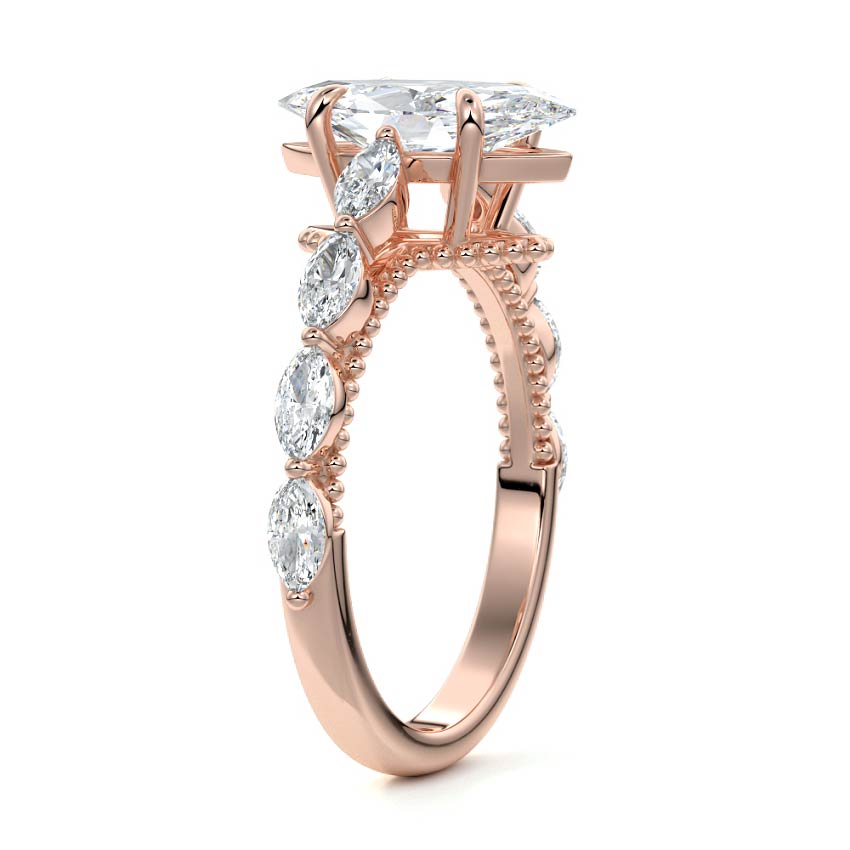 This setting features marquise-shaped diamonds meticulously set along the band, creating a captivating and distinctive pattern. The interior of the ring is adorned with intricate milgrain detailing, showcasing delicate beaded edges that enhance its overall beauty and sophistication. Together, these elements combine to create a timeless and refined piece of jewelry that beautifully balances modern aesthetics with vintage-inspired craftsmanship.