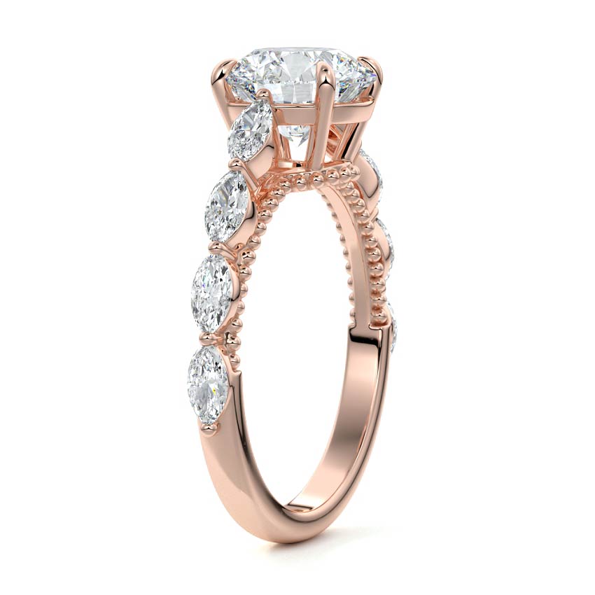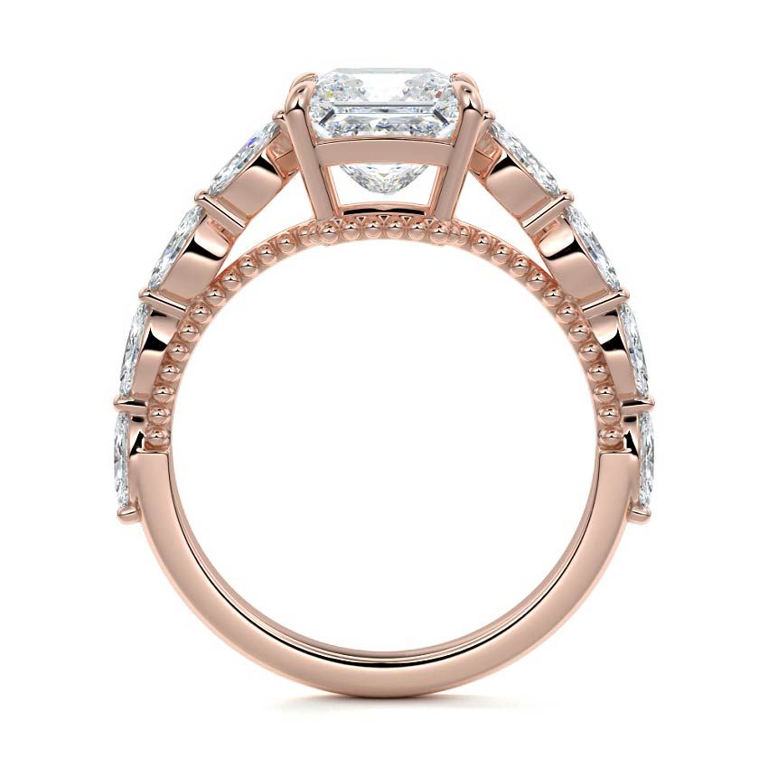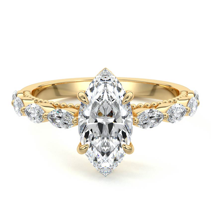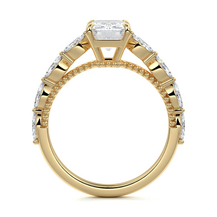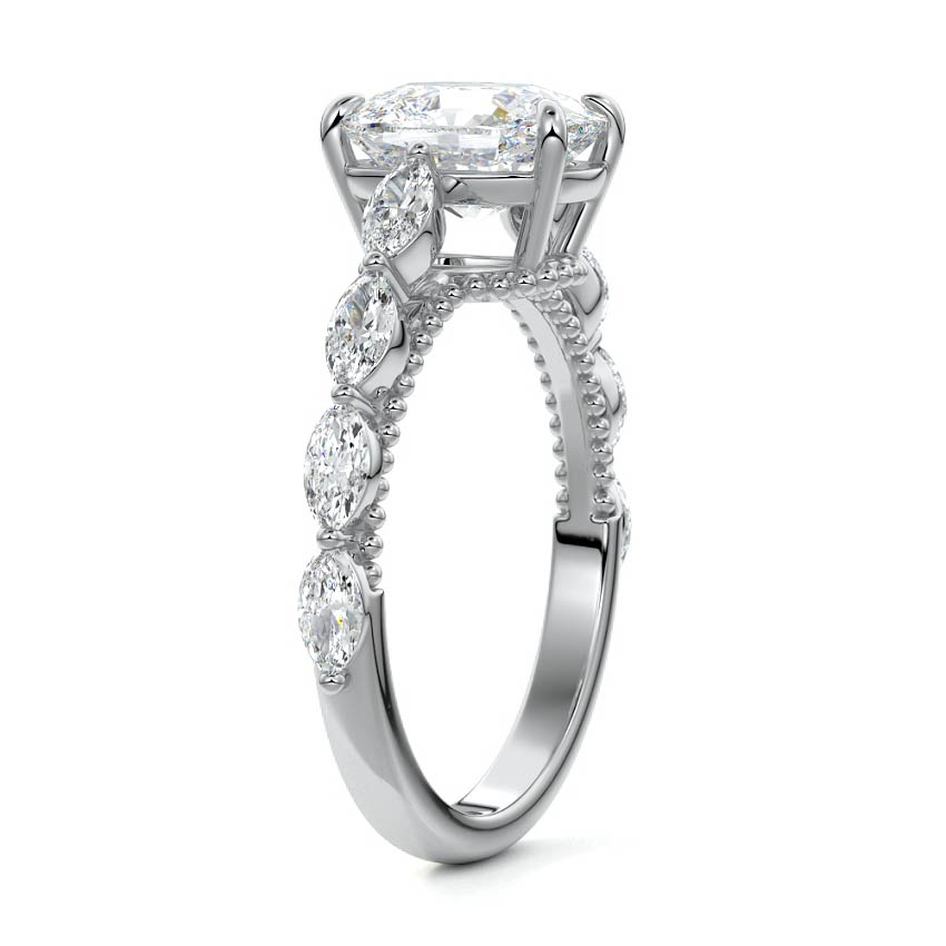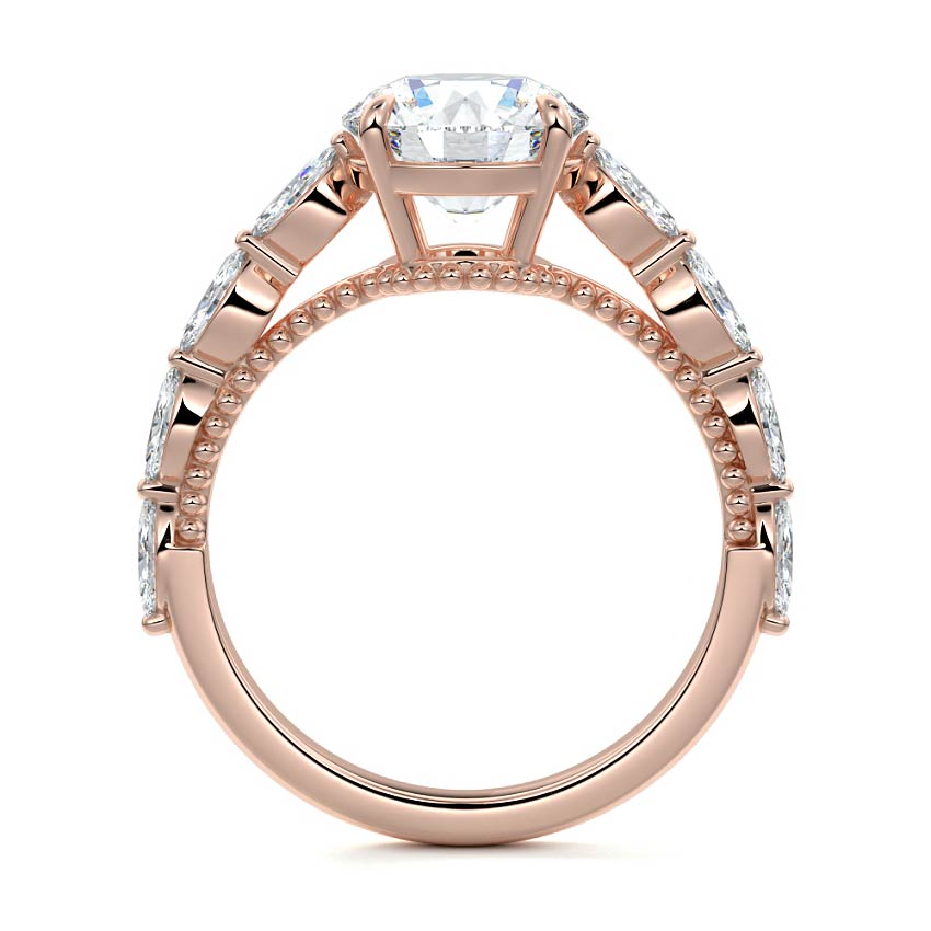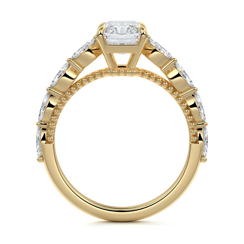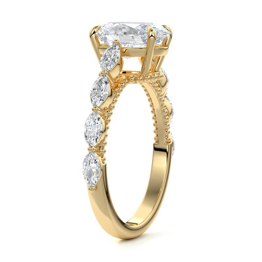 This setting features marquise-shaped diamonds meticulously set along the band, creating a captivating and distinctive pattern. The interior of the ring is adorned with intricate milgrain detailing, showcasing delicate beaded edges that enhance its overall beauty and sophistication. Together, these elements combine to create a timeless and refined piece of jewelry that beautifully balances modern aesthetics with vintage-inspired craftsmanship.