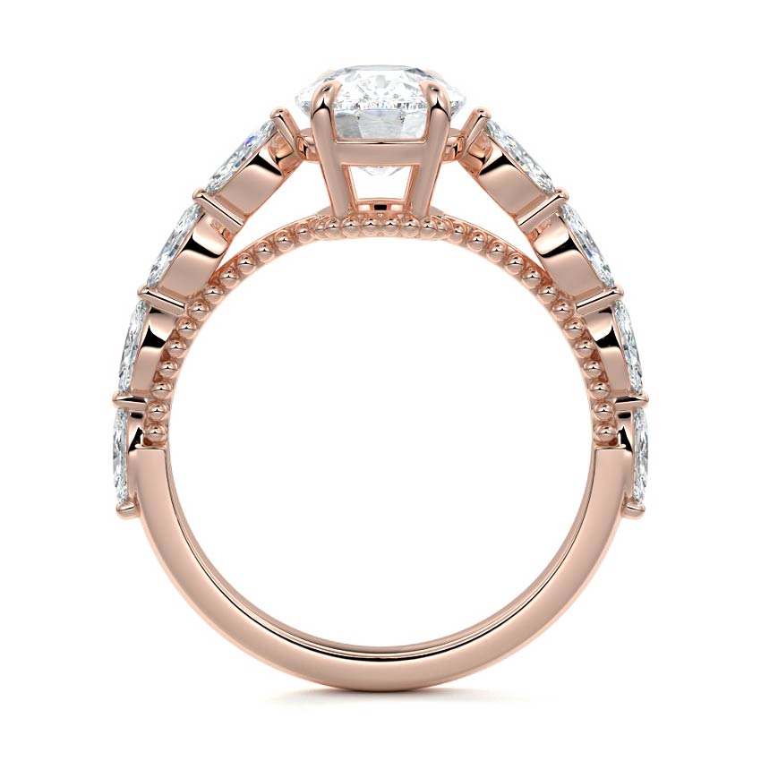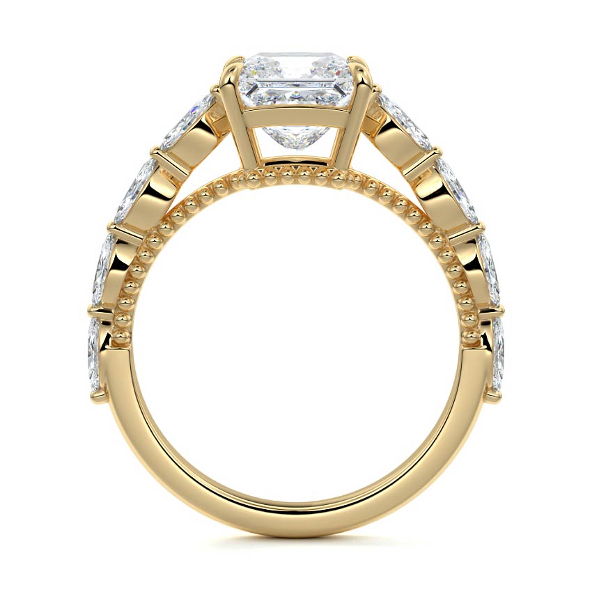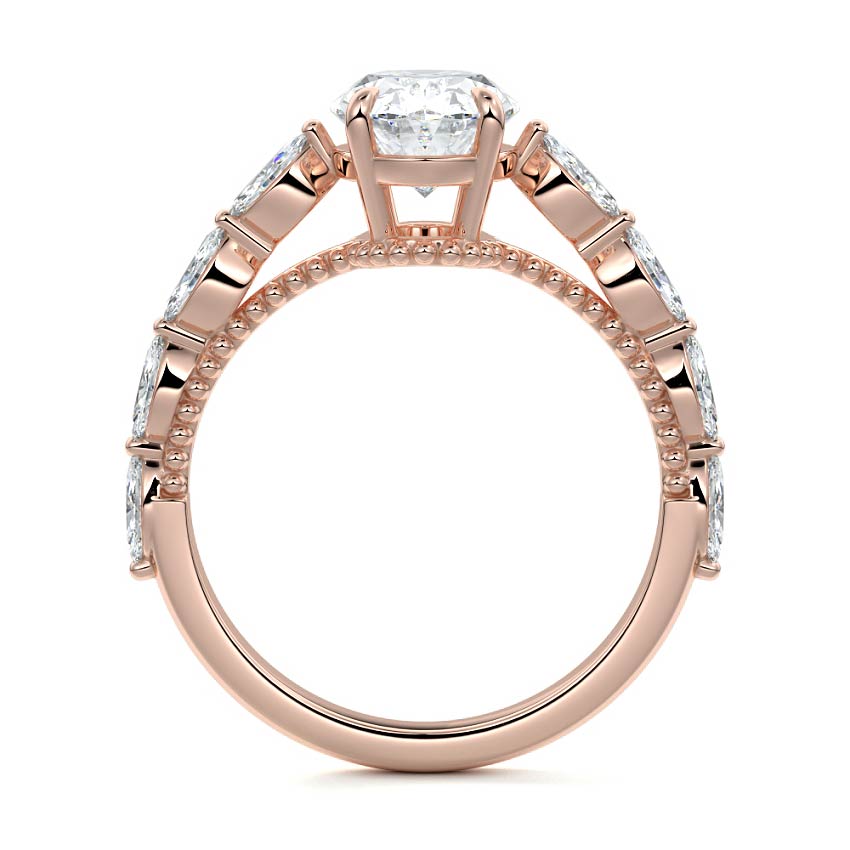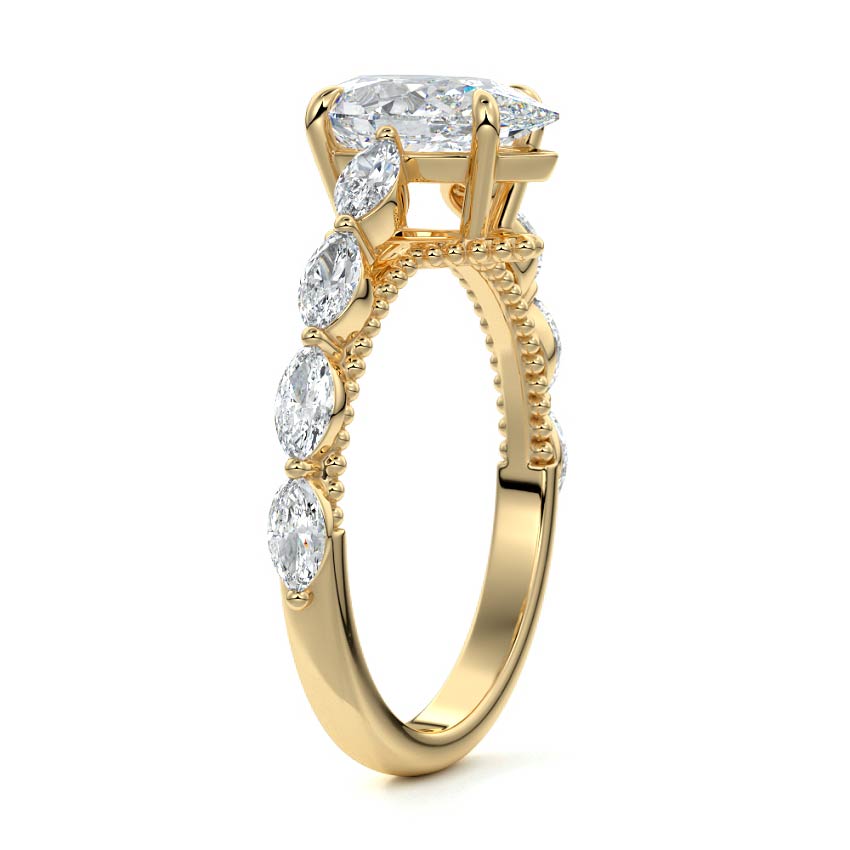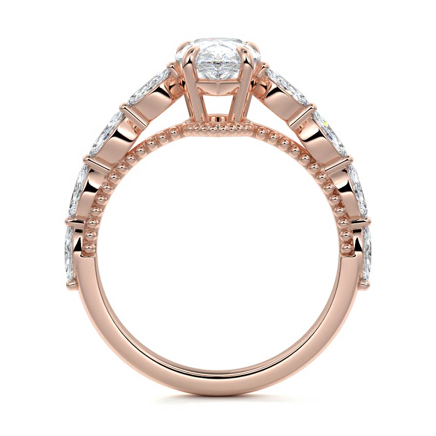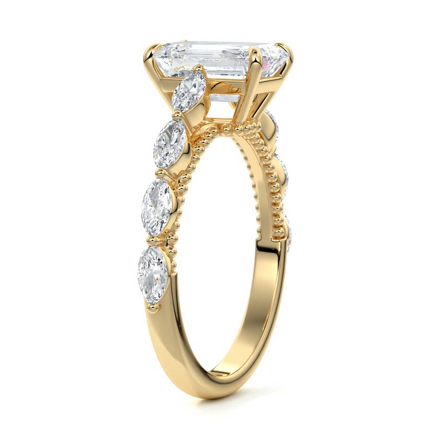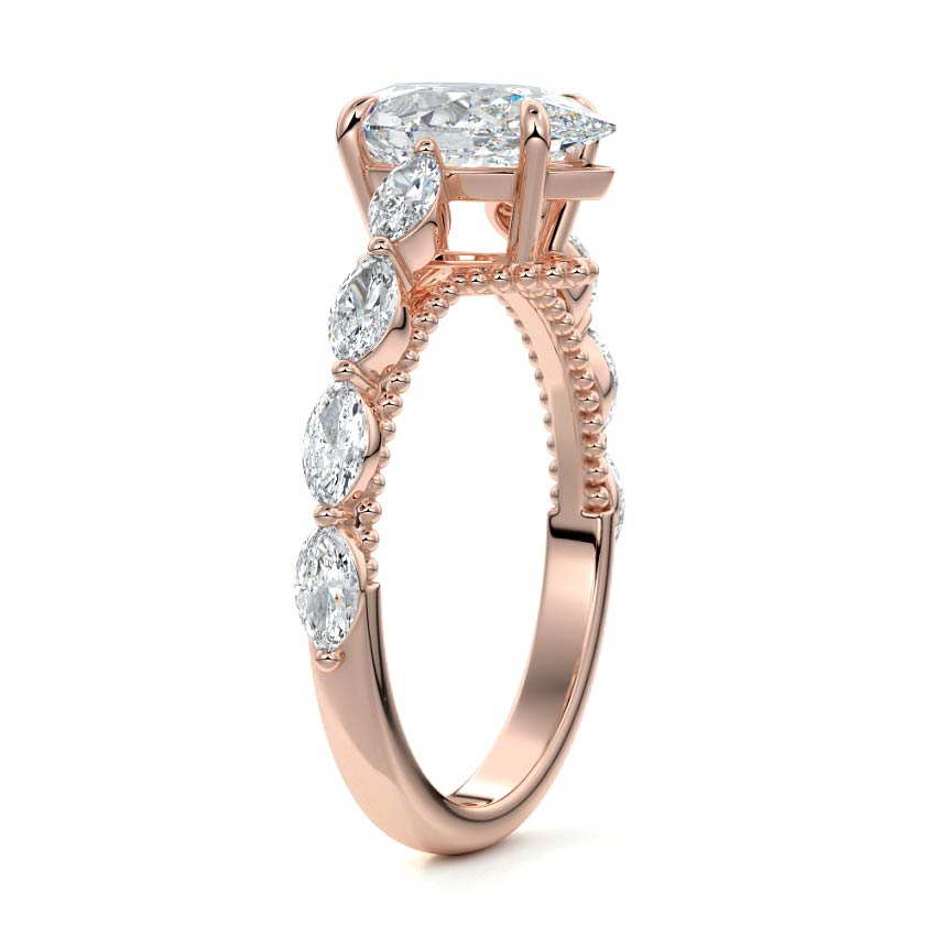 This setting features marquise-shaped diamonds meticulously set along the band, creating a captivating and distinctive pattern. The interior of the ring is adorned with intricate milgrain detailing, showcasing delicate beaded edges that enhance its overall beauty and sophistication. Together, these elements combine to create a timeless and refined piece of jewelry that beautifully balances modern aesthetics with vintage-inspired craftsmanship.