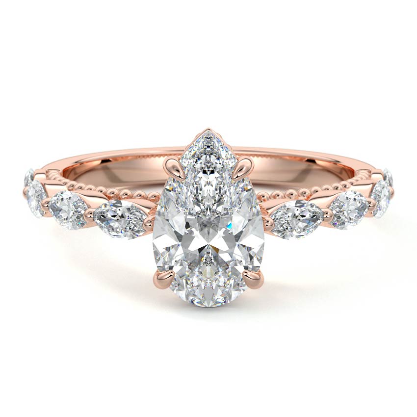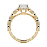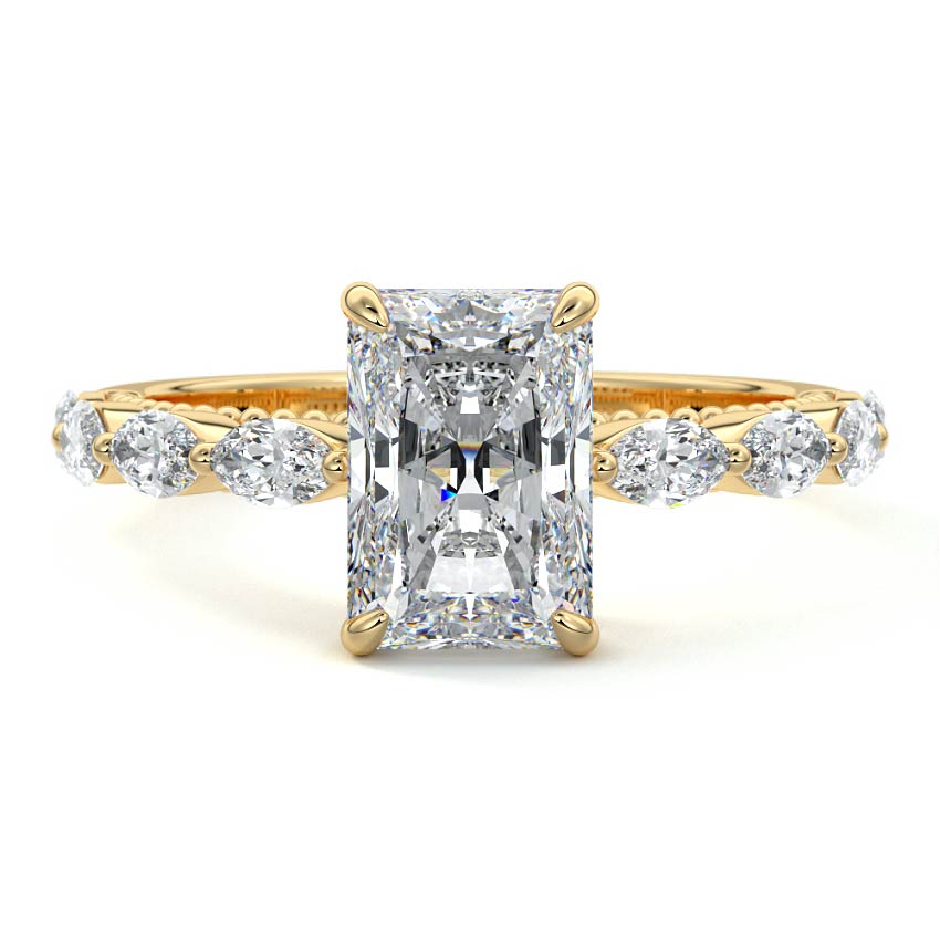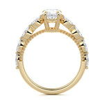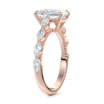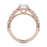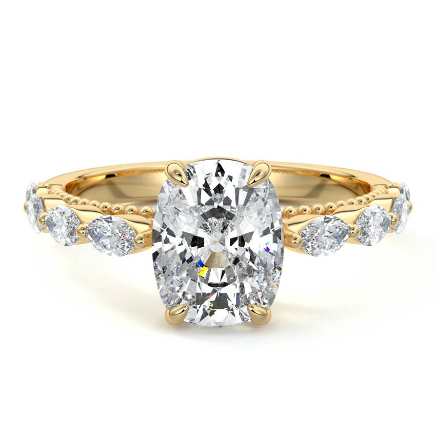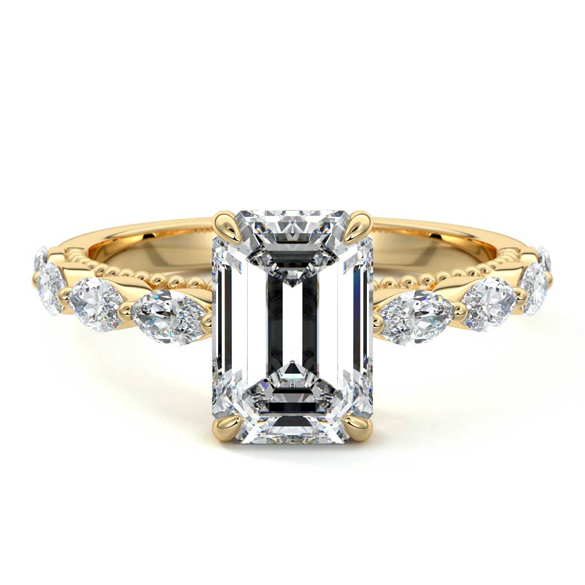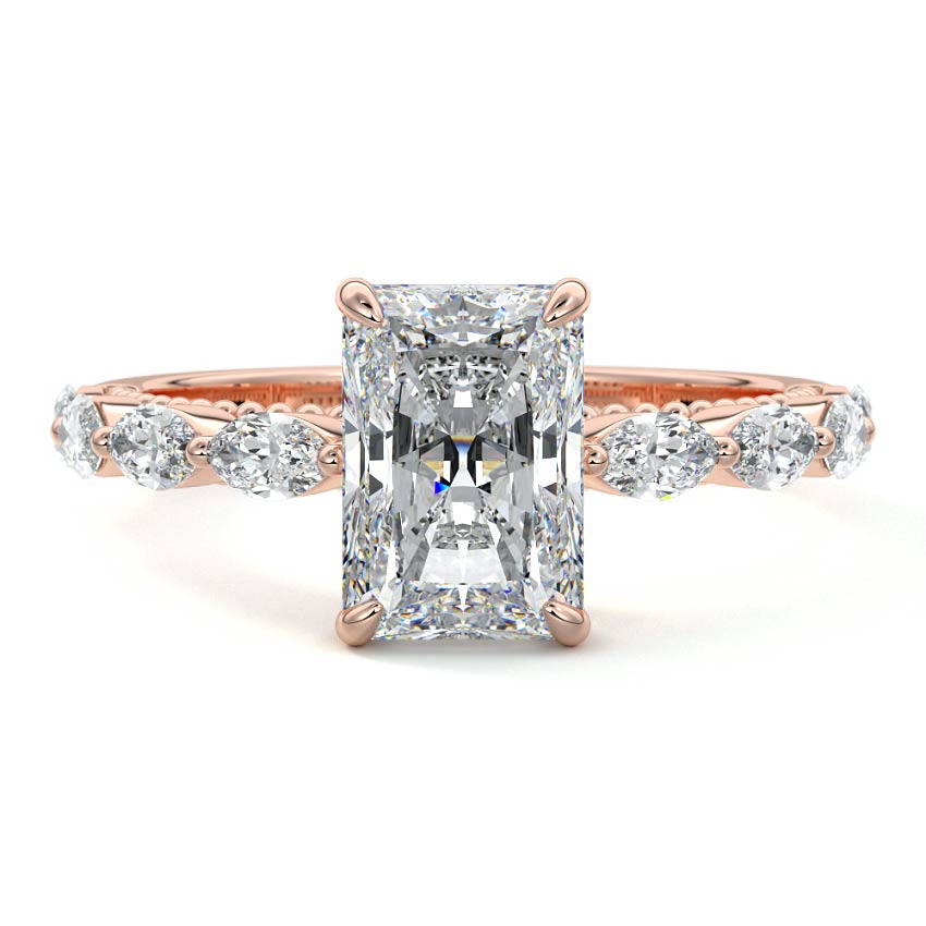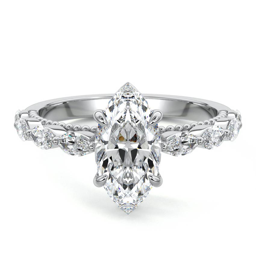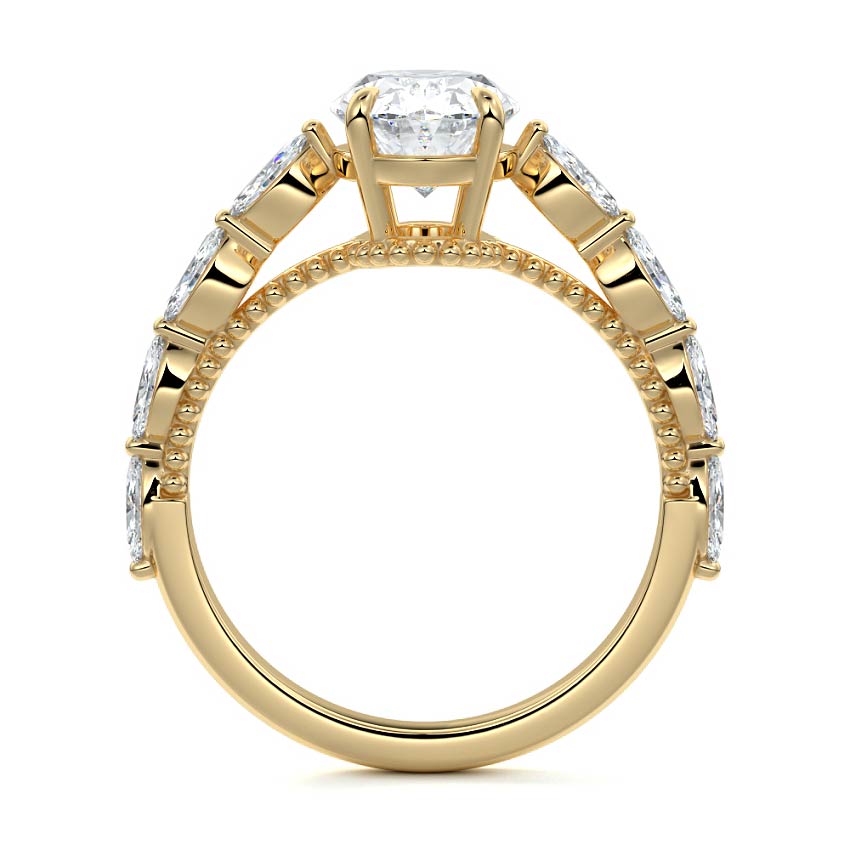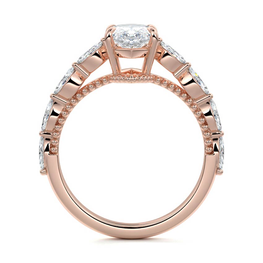 This setting features marquise-shaped diamonds meticulously set along the band, creating a captivating and distinctive pattern. The interior of the ring is adorned with intricate milgrain detailing, showcasing delicate beaded edges that enhance its overall beauty and sophistication. Together, these elements combine to create a timeless and refined piece of jewelry that beautifully balances modern aesthetics with vintage-inspired craftsmanship.