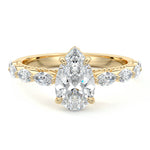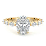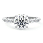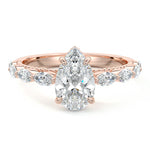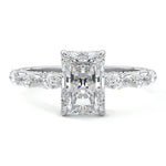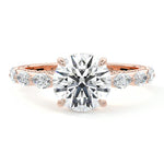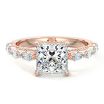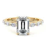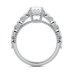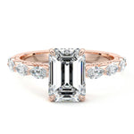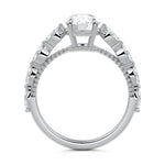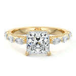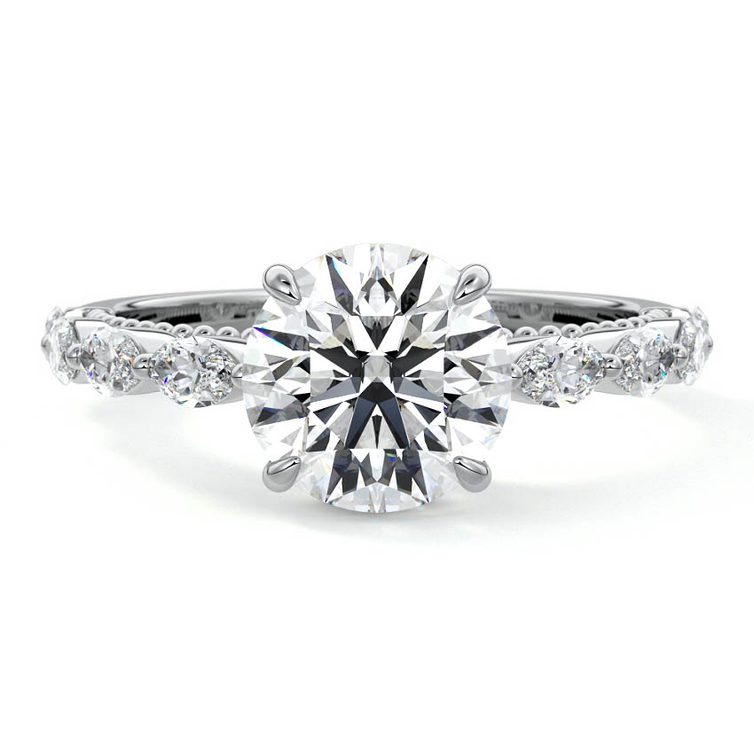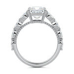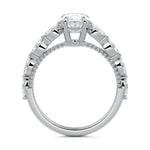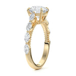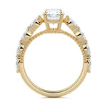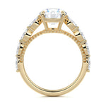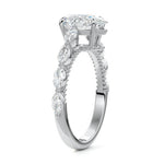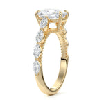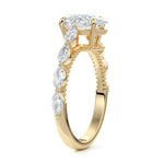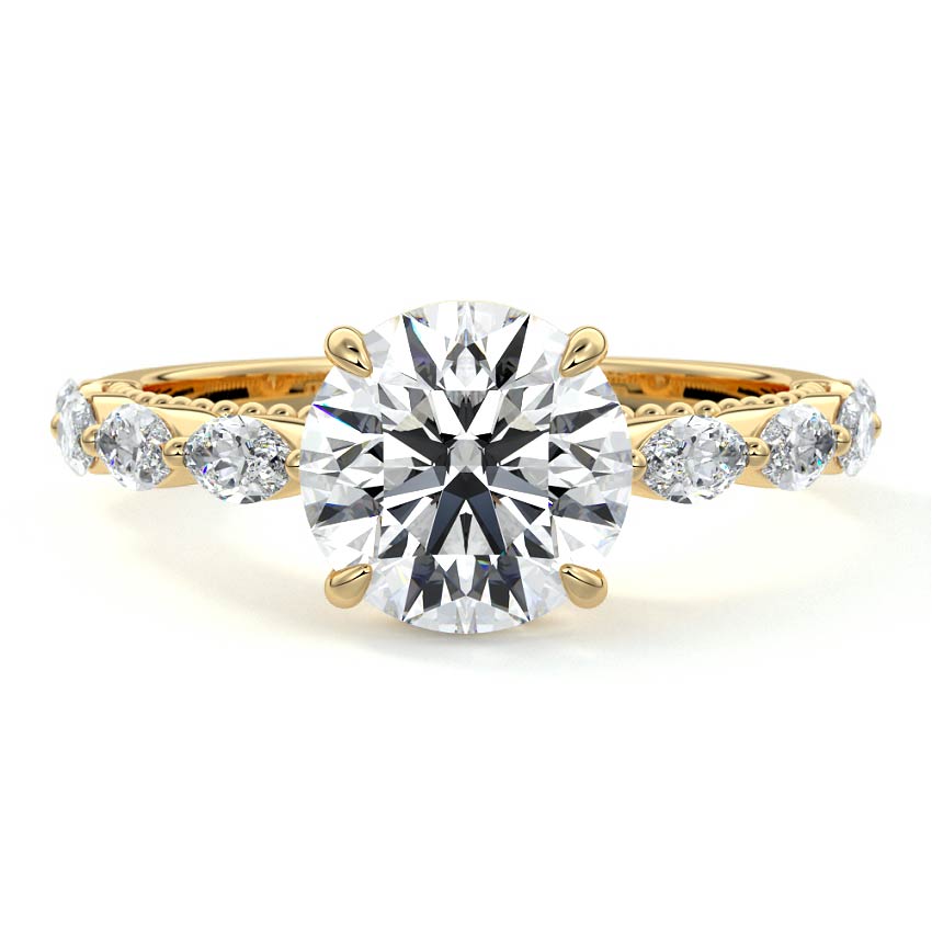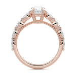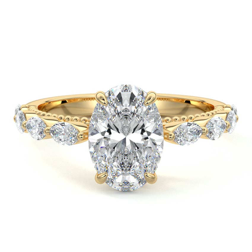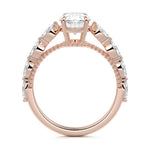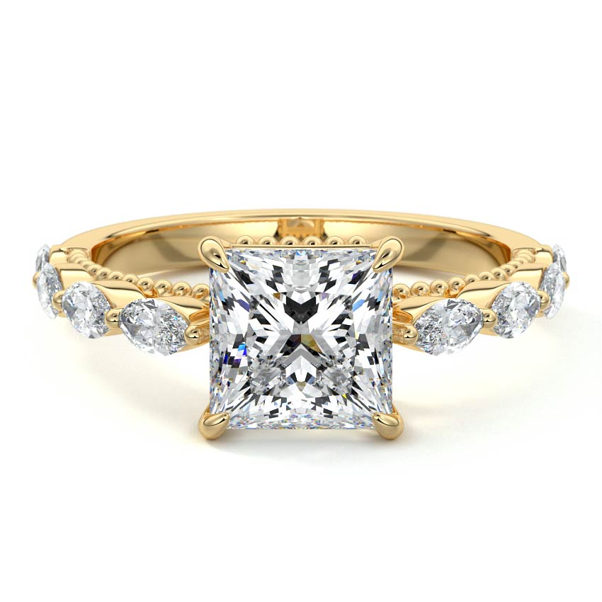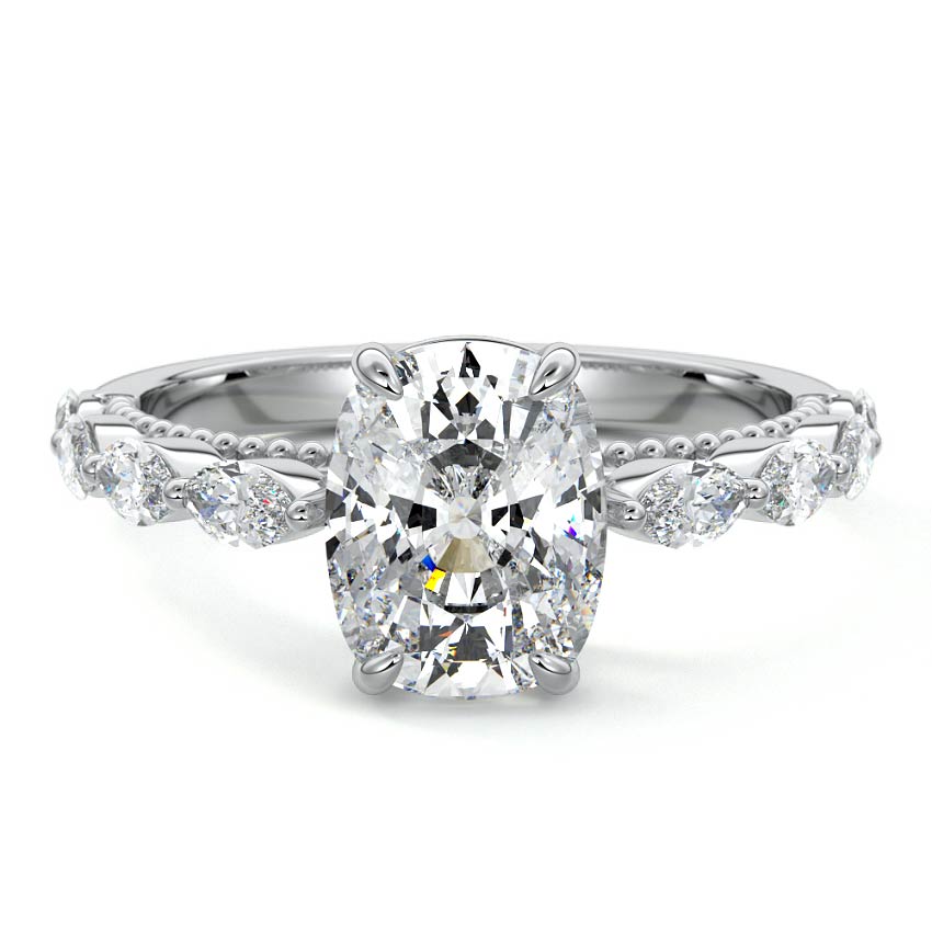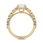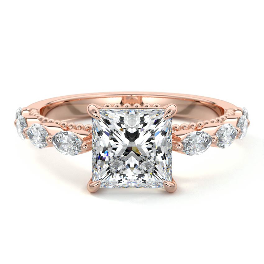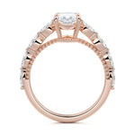 This setting features marquise-shaped diamonds meticulously set along the band, creating a captivating and distinctive pattern. The interior of the ring is adorned with intricate milgrain detailing, showcasing delicate beaded edges that enhance its overall beauty and sophistication. Together, these elements combine to create a timeless and refined piece of jewelry that beautifully balances modern aesthetics with vintage-inspired craftsmanship.