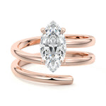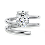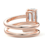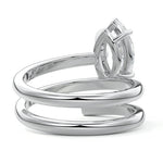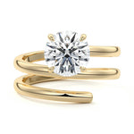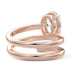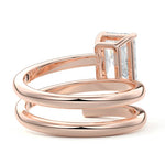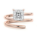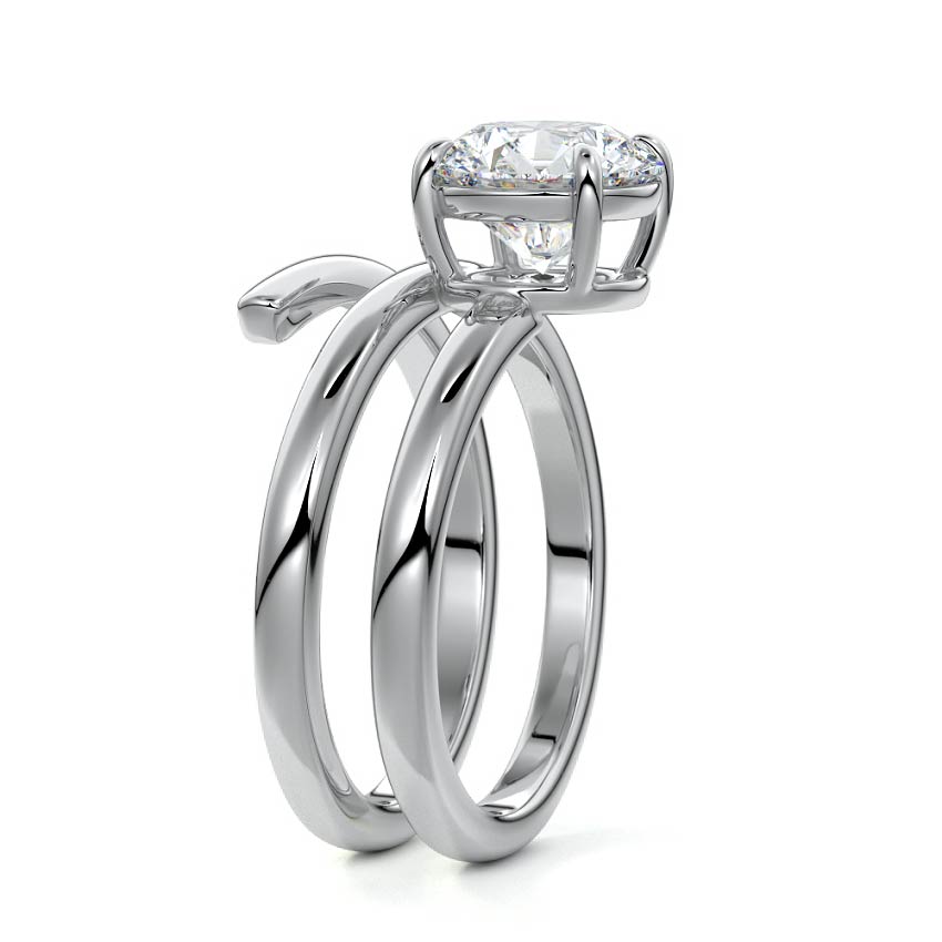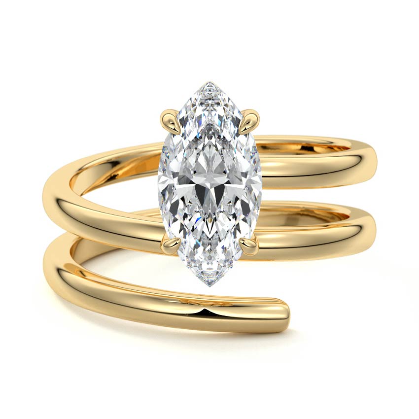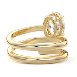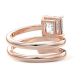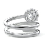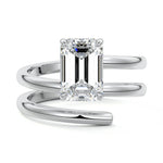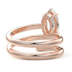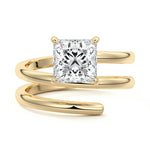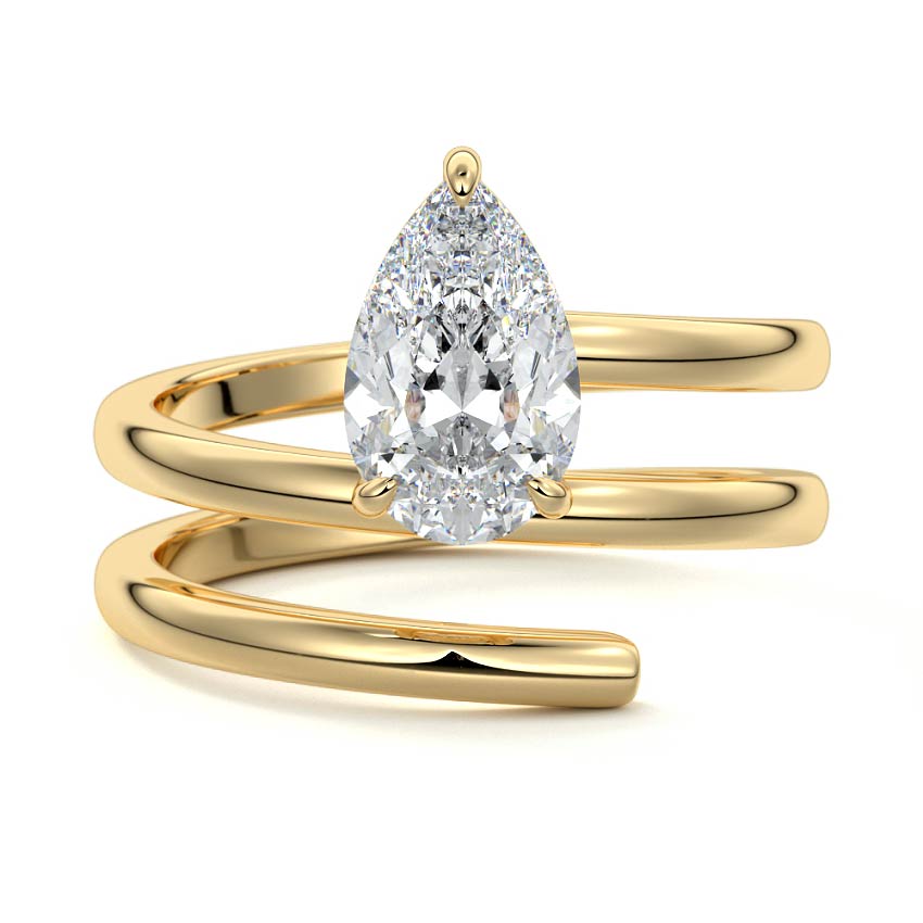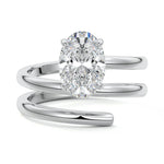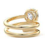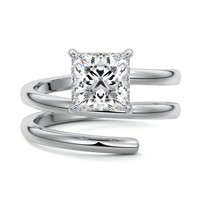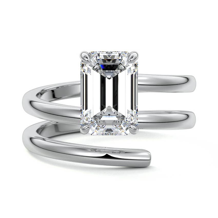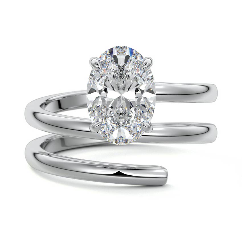 At its heart, it showcases a single, radiant gemstone cradled in a classic solitaire setting, brilliantly showcasing the gem's luminosity. Enveloping this centerpiece, a gracefully coiled band intricately winds around, imparting a distinct and captivating element to the ring's overall design.