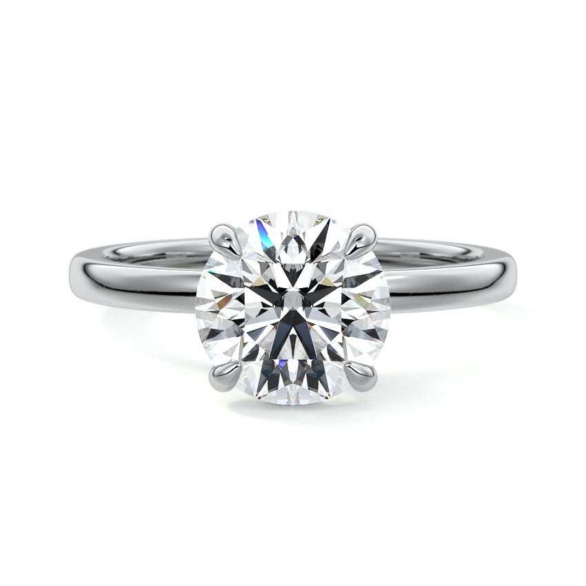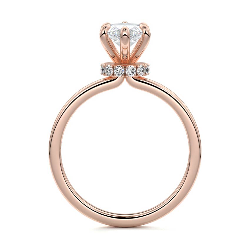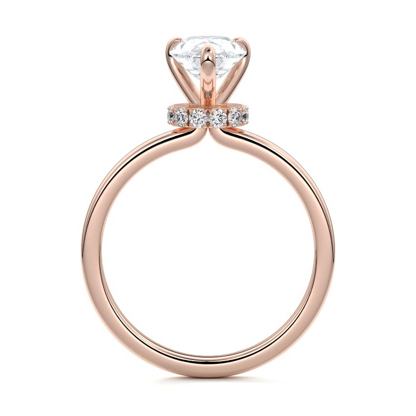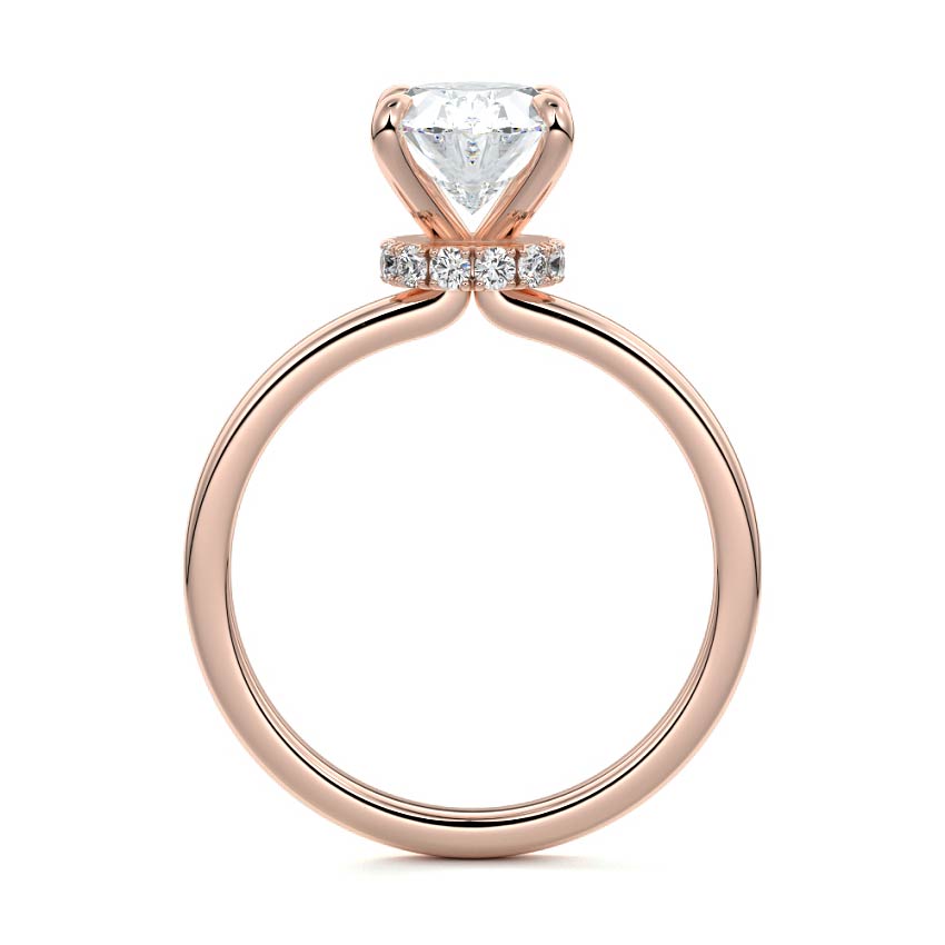 At its core, this setting presents a solitary, exquisite gemstone, beautifully showcased in a minimalist solitaire setting. Beneath the surface, a subtle and exceptionally low-profile hidden halo surrounds the center stone, adding a touch of brilliance and intrigue while maintaining the ring's sleek and understated appeal.