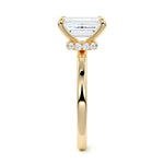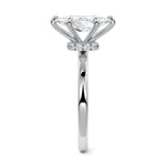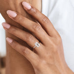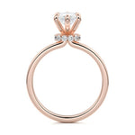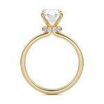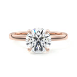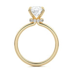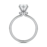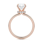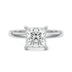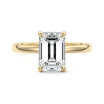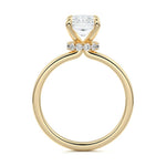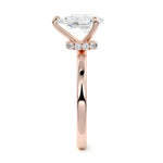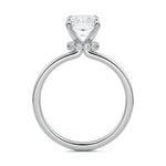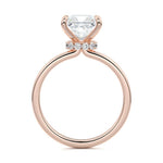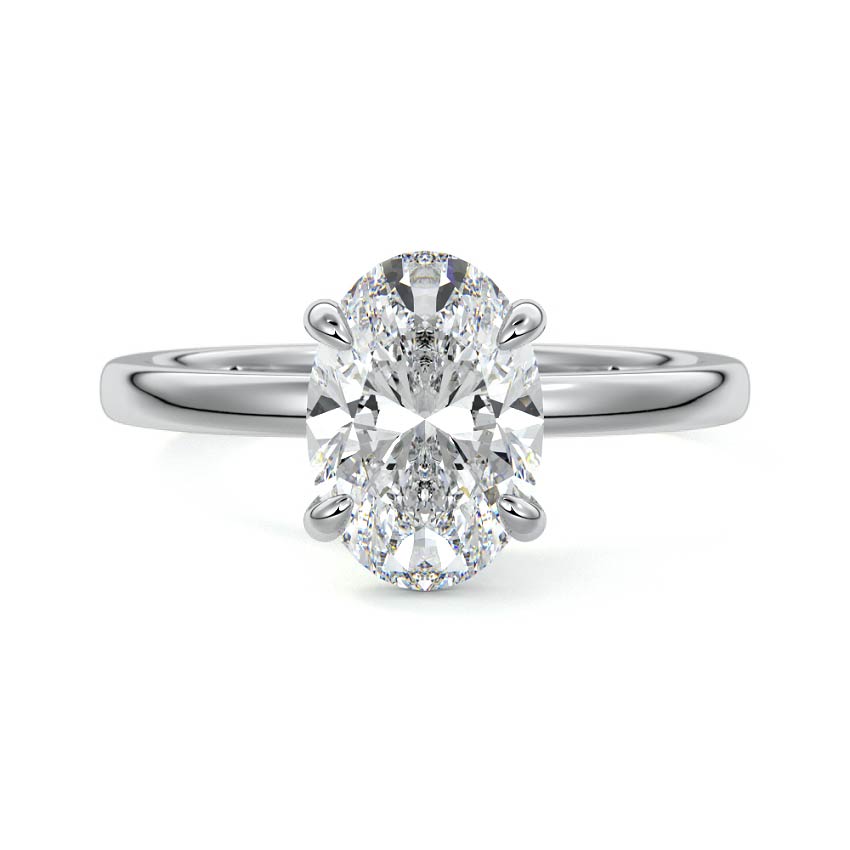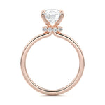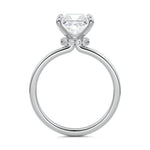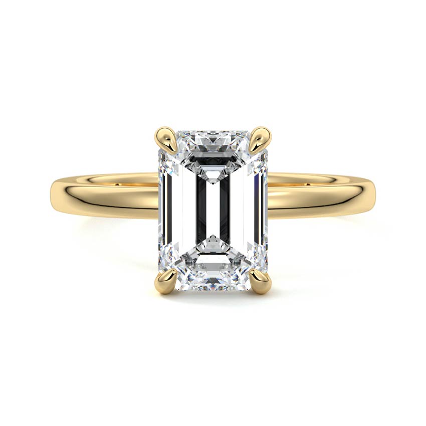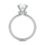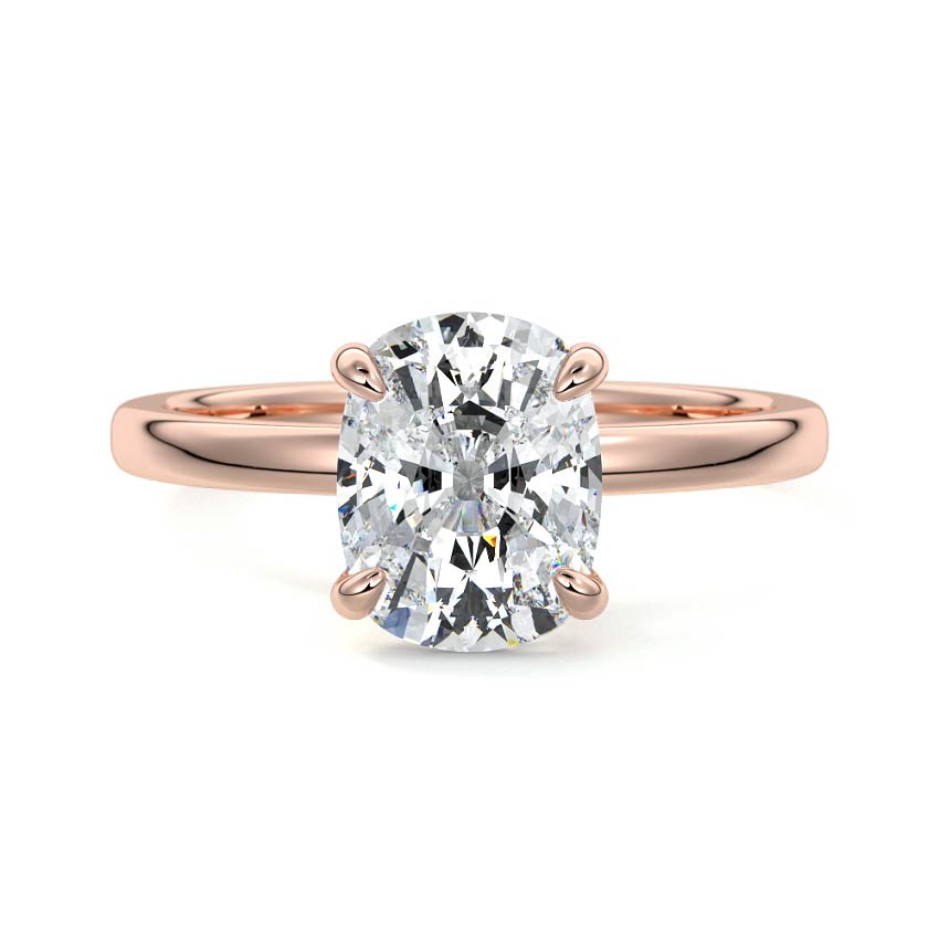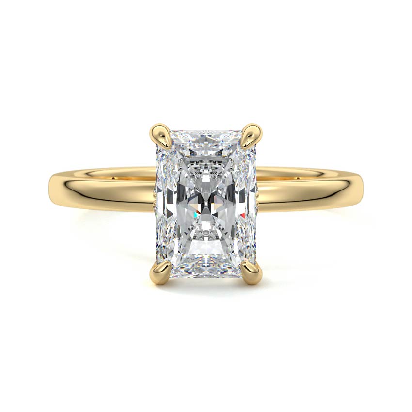 At its core, this setting presents a solitary, exquisite gemstone, beautifully showcased in a minimalist solitaire setting. Beneath the surface, a subtle and exceptionally low-profile hidden halo surrounds the center stone, adding a touch of brilliance and intrigue while maintaining the ring's sleek and understated appeal.