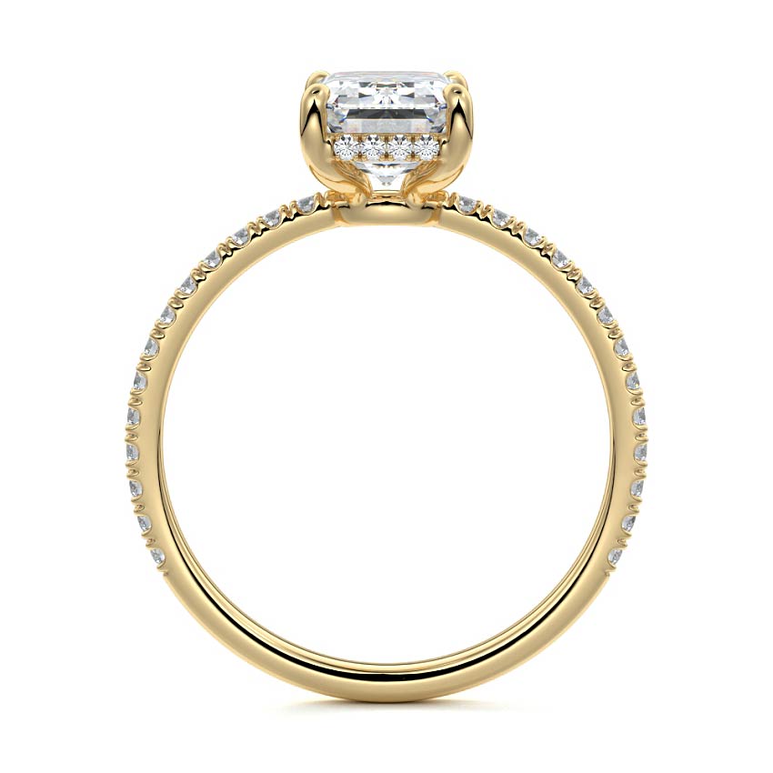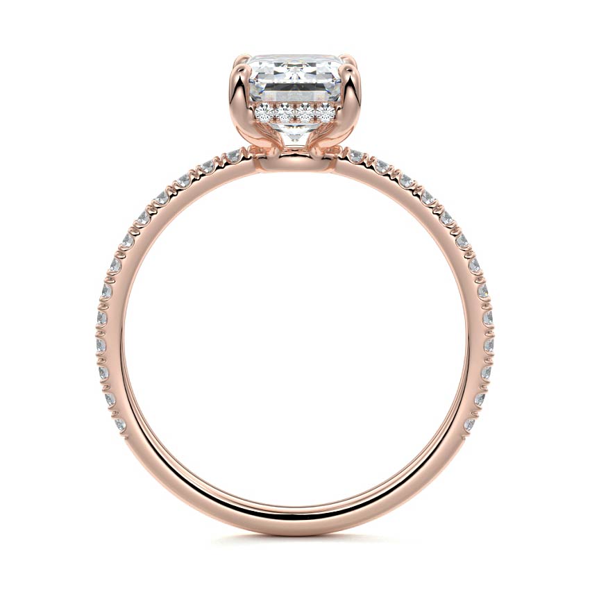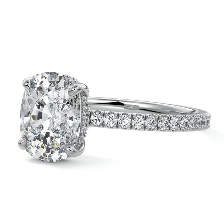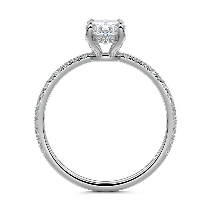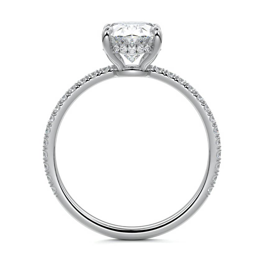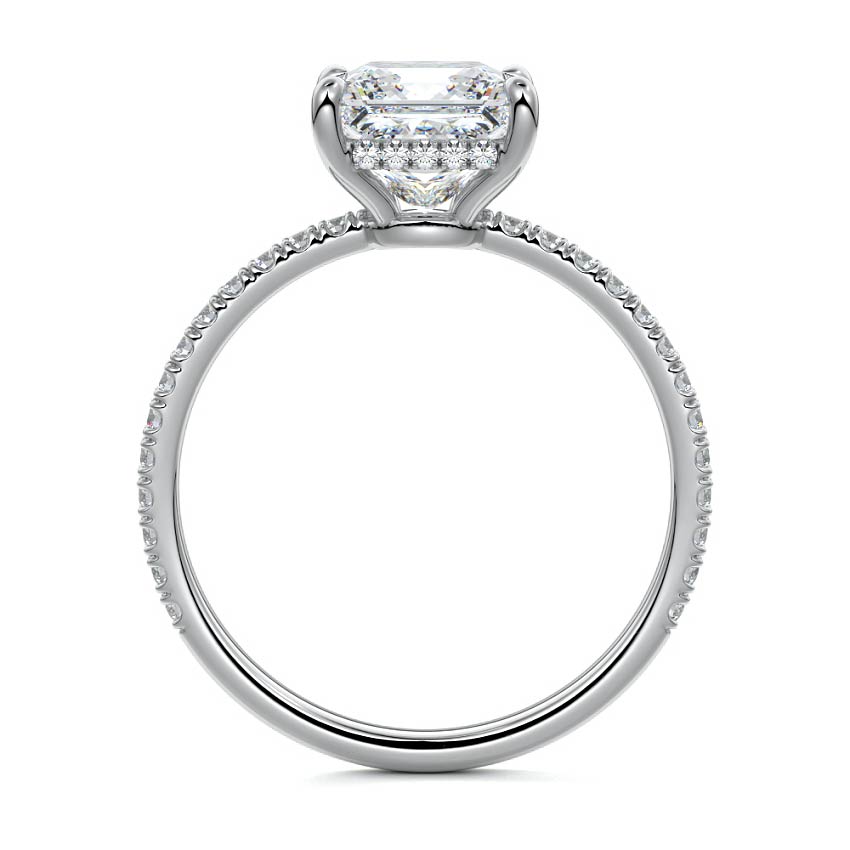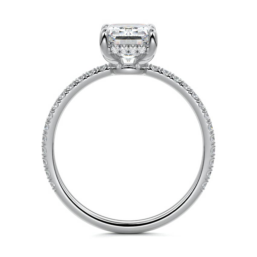 This setting boasts a meticulously crafted diamond Hidden Halo, elegantly encircling the center stone, which is intentionally set at a lower position. This unique design combines the brilliance of pavé-set diamonds with the subtle charm of the Hidden Halo, creating a stunning and contemporary piece that highlights the center stone's beauty while adding a touch of sophistication.