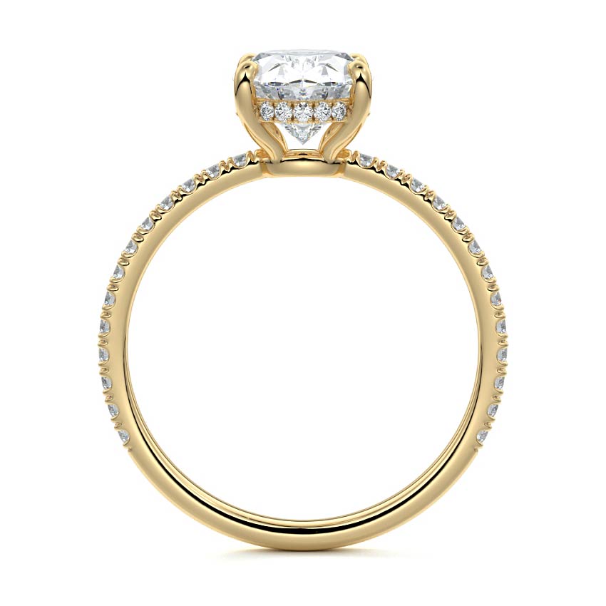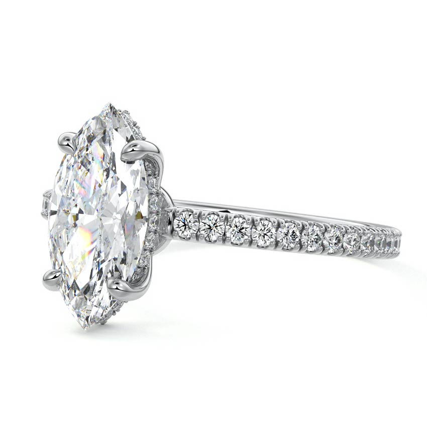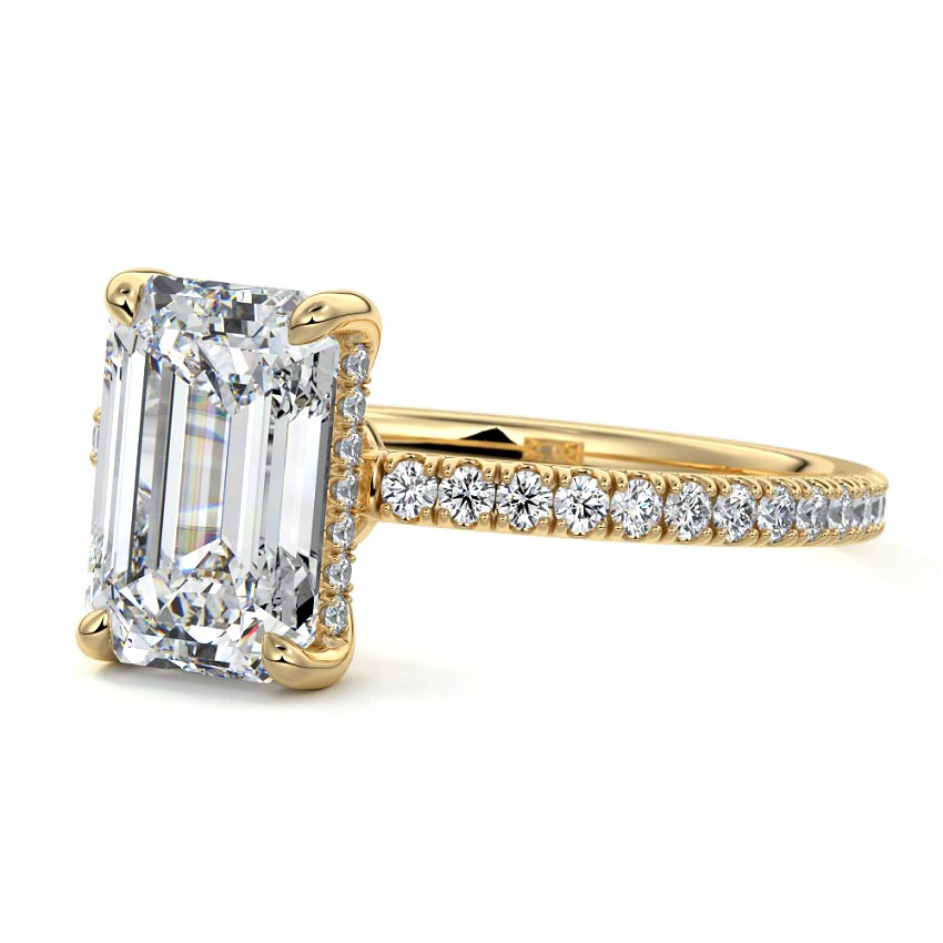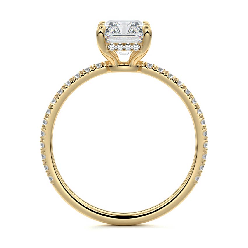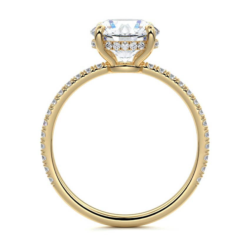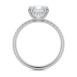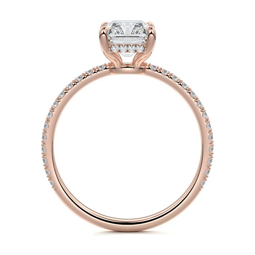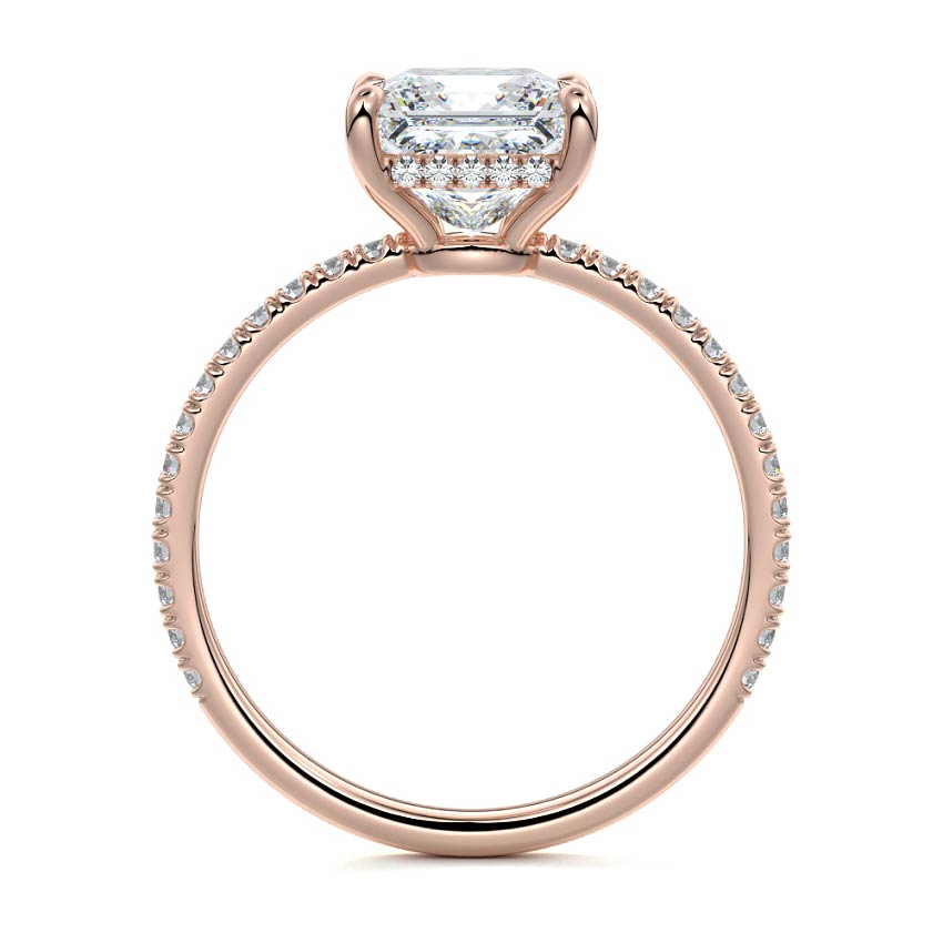 This setting boasts a meticulously crafted diamond Hidden Halo, elegantly encircling the center stone, which is intentionally set at a lower position. This unique design combines the brilliance of pavé-set diamonds with the subtle charm of the Hidden Halo, creating a stunning and contemporary piece that highlights the center stone's beauty while adding a touch of sophistication.