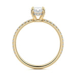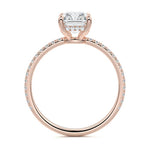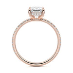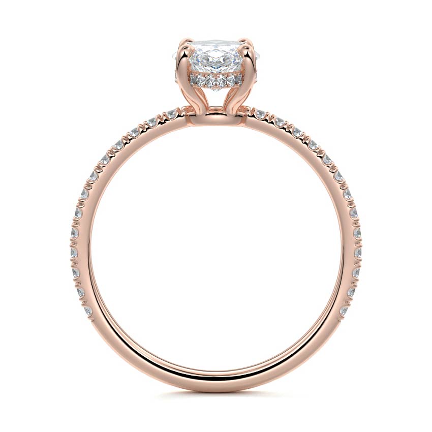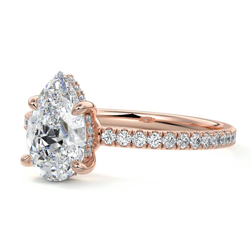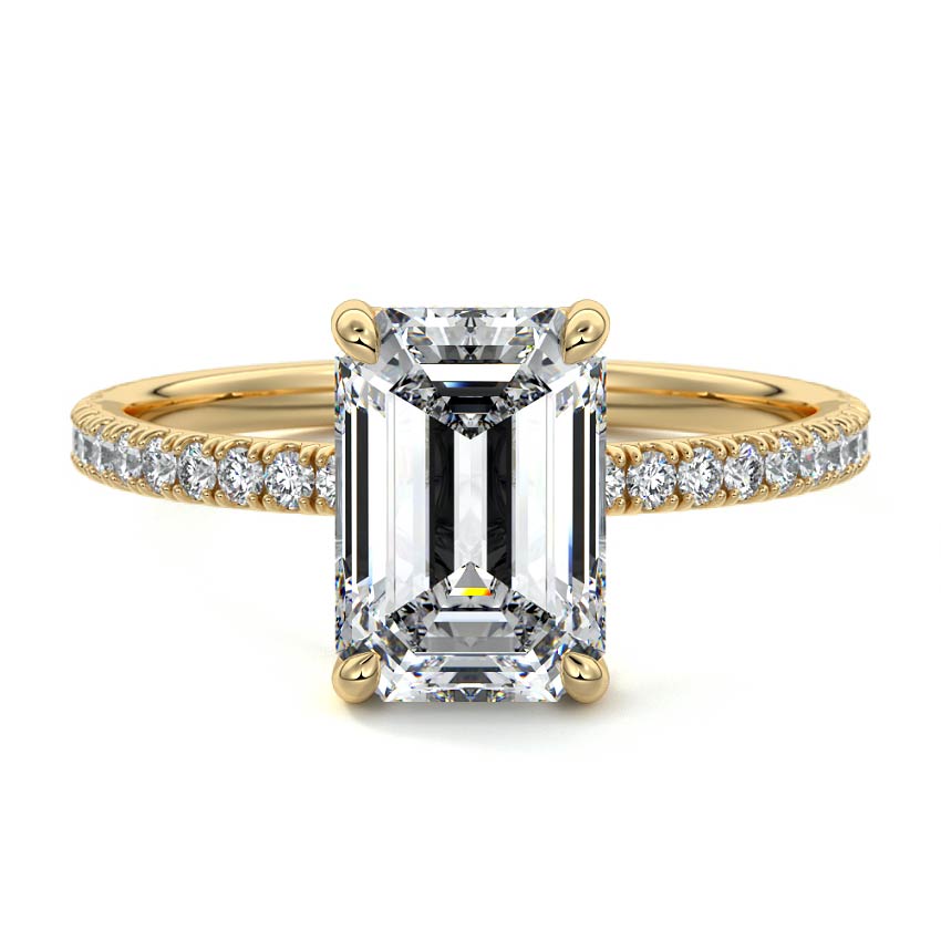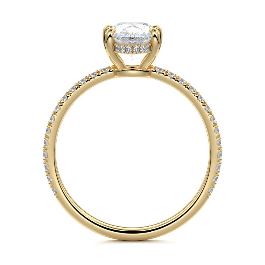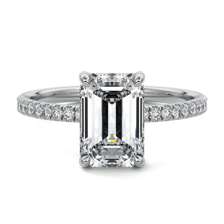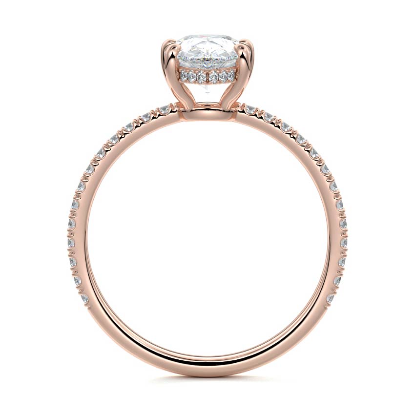 This setting boasts a meticulously crafted diamond Hidden Halo, elegantly encircling the center stone, which is intentionally set at a lower position. This unique design combines the brilliance of pavé-set diamonds with the subtle charm of the Hidden Halo, creating a stunning and contemporary piece that highlights the center stone's beauty while adding a touch of sophistication.