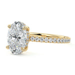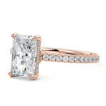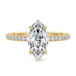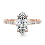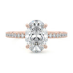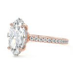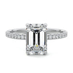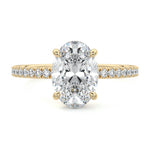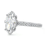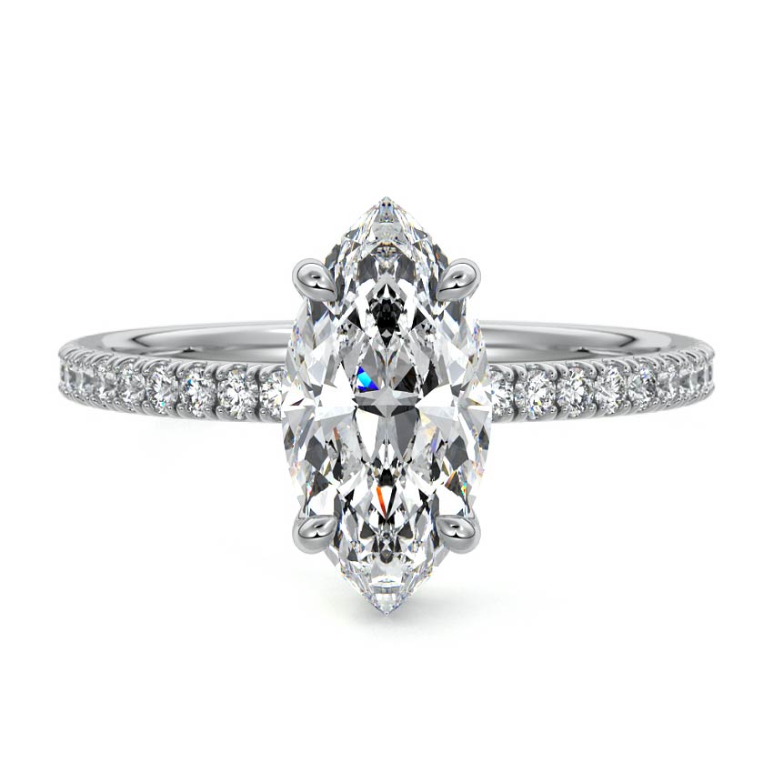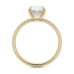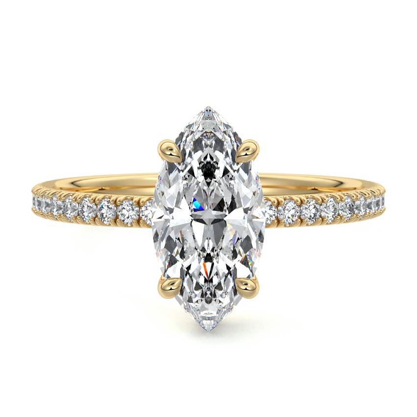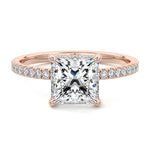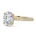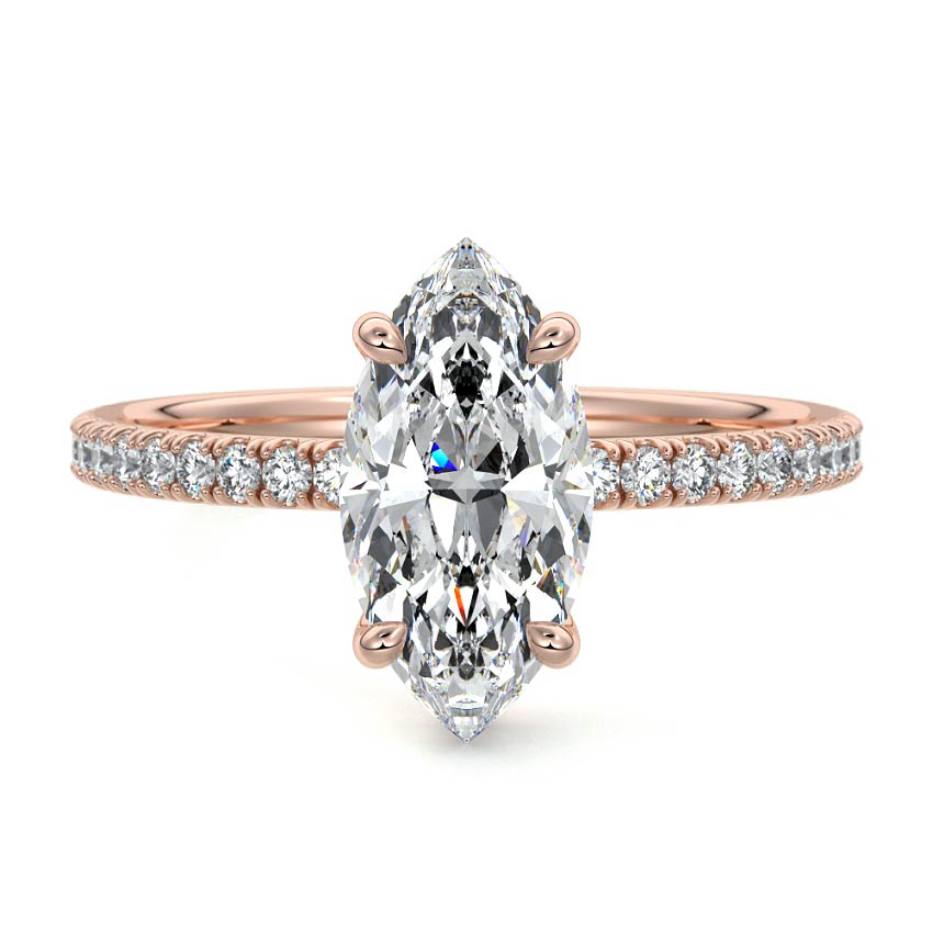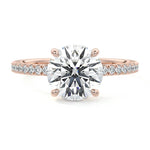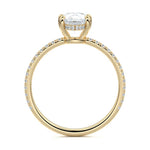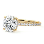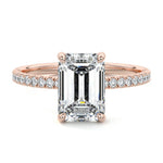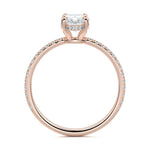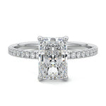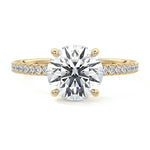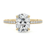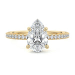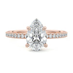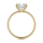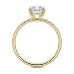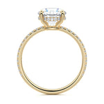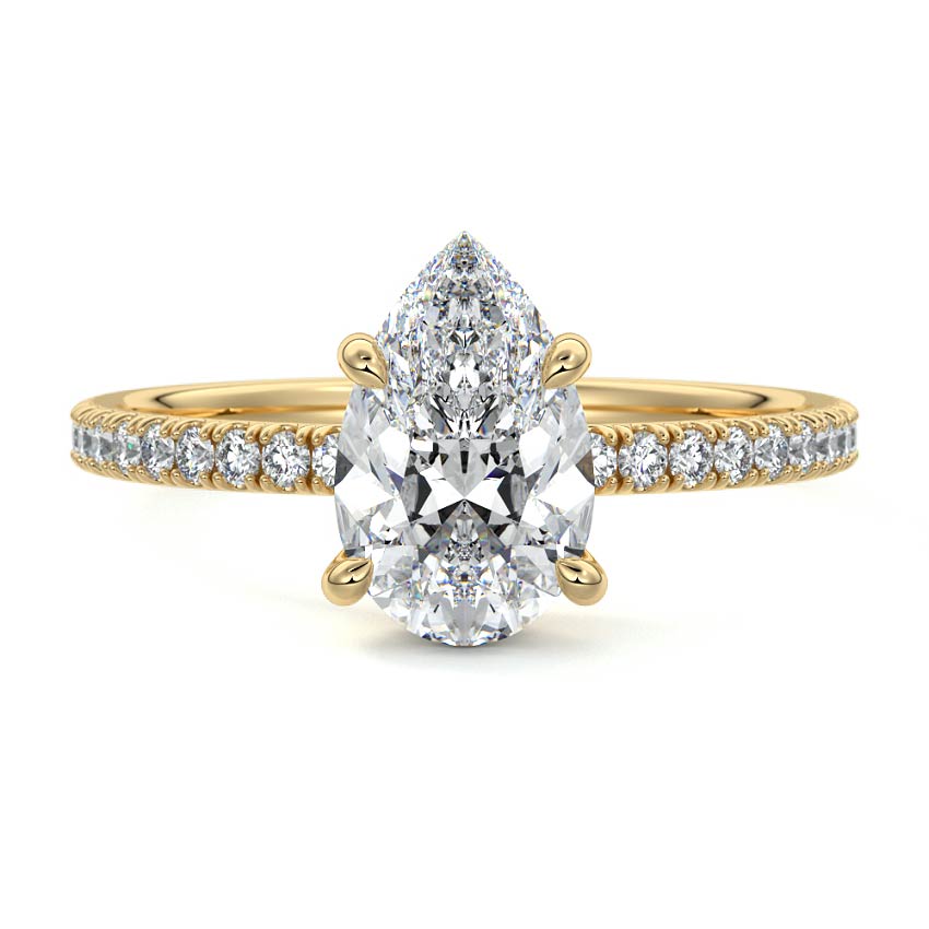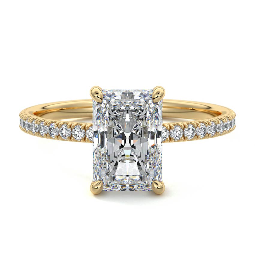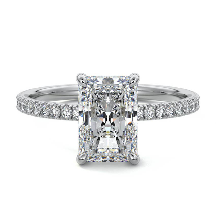 This setting boasts a meticulously crafted diamond Hidden Halo, elegantly encircling the center stone, which is intentionally set at a lower position. This unique design combines the brilliance of pavé-set diamonds with the subtle charm of the Hidden Halo, creating a stunning and contemporary piece that highlights the center stone's beauty while adding a touch of sophistication.