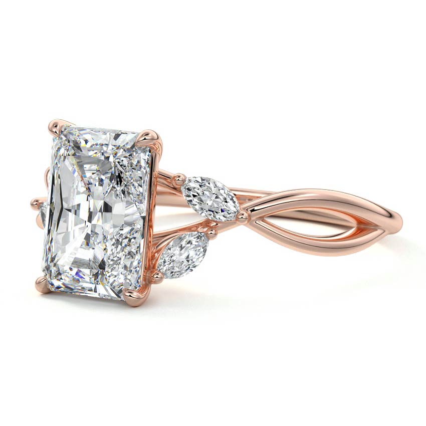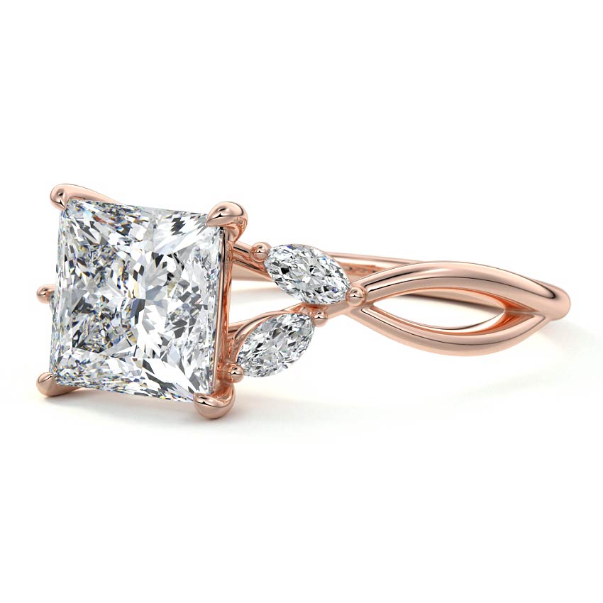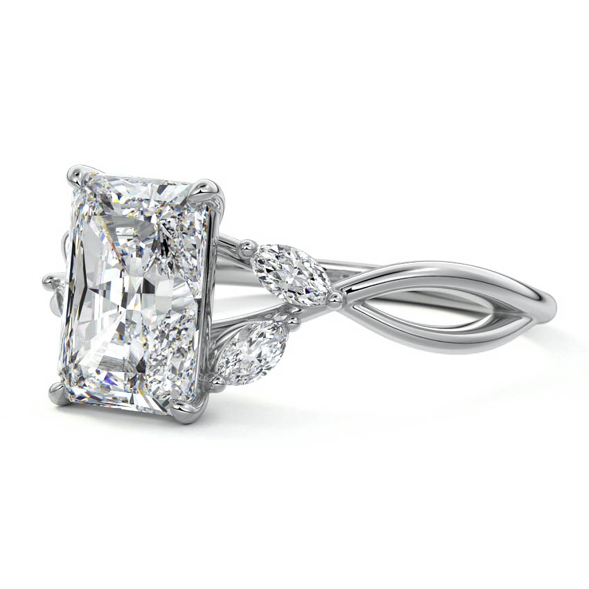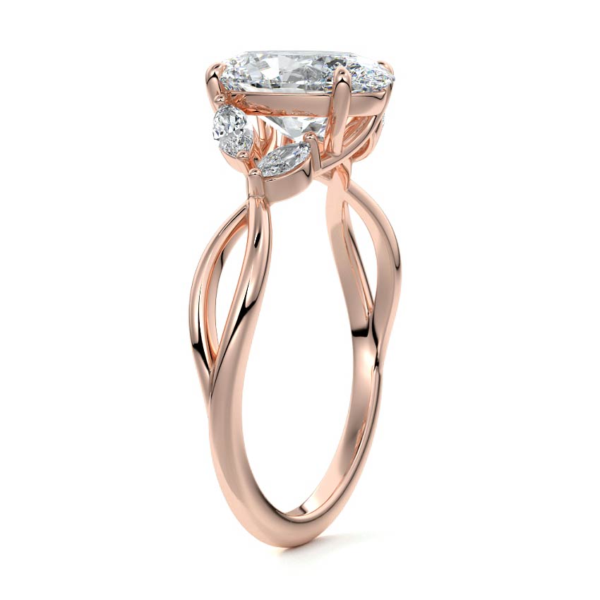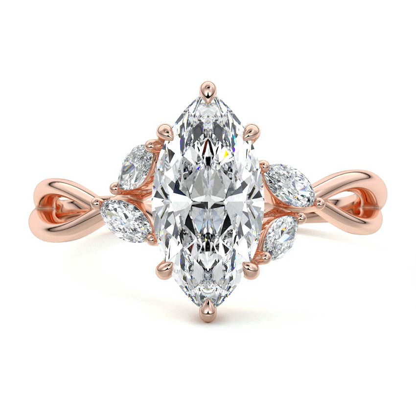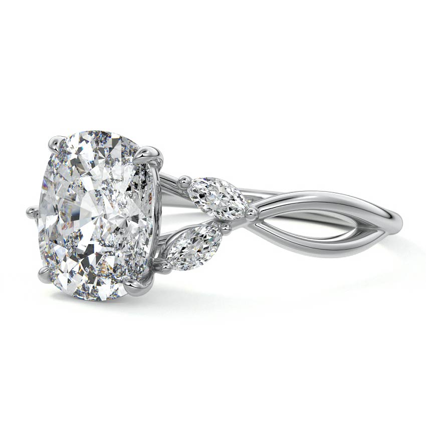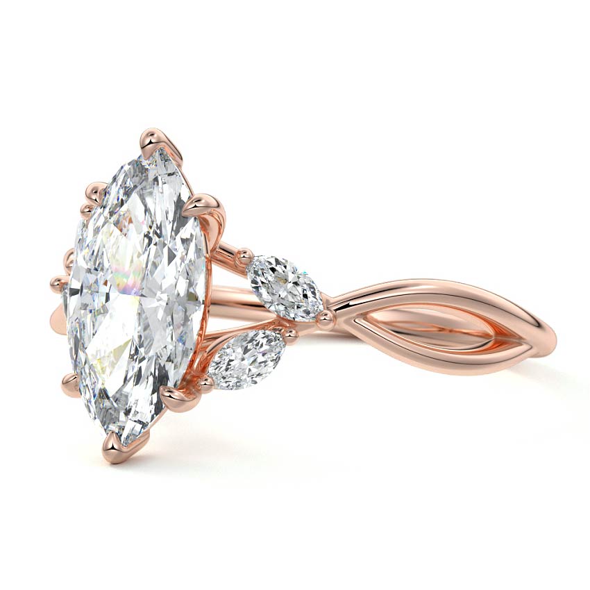 This ring setting draws inspiration from the natural world, with a design reminiscent of vines and flowers. On each side of the central feature, two marquise-cut diamonds gracefully integrate into the design, resembling delicate vine leaves or petals, creating an enchanting and organic aesthetic.