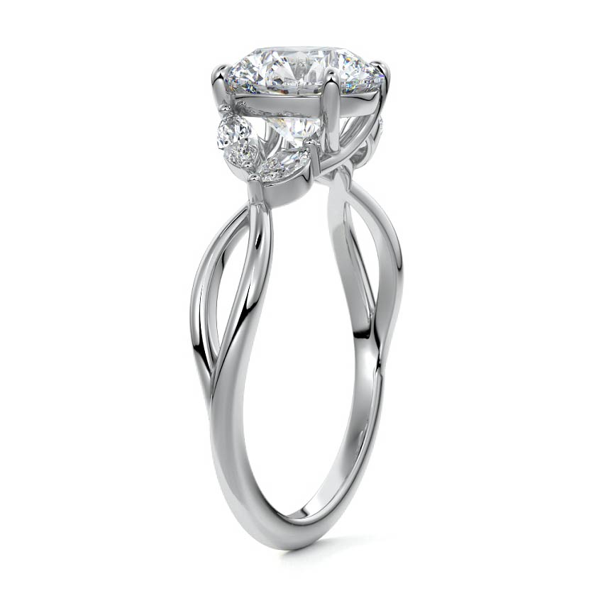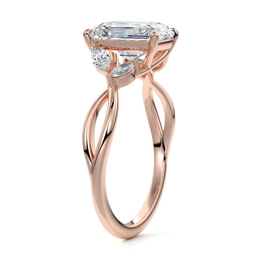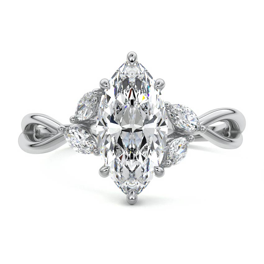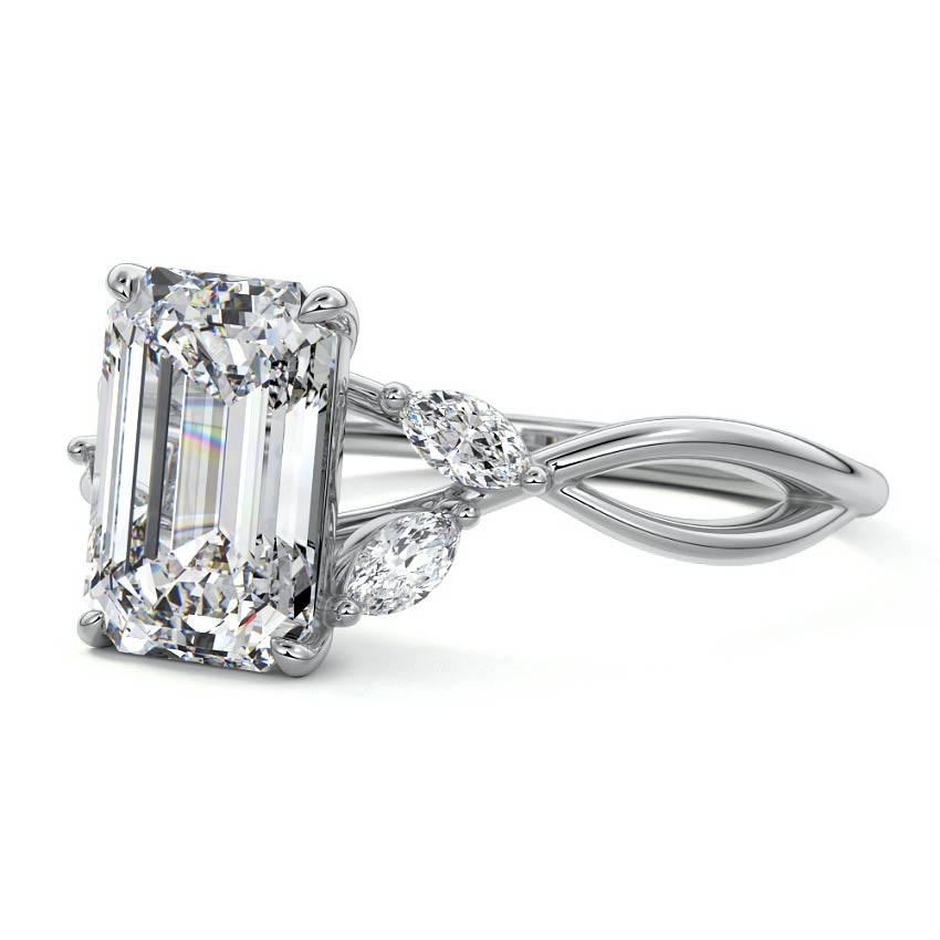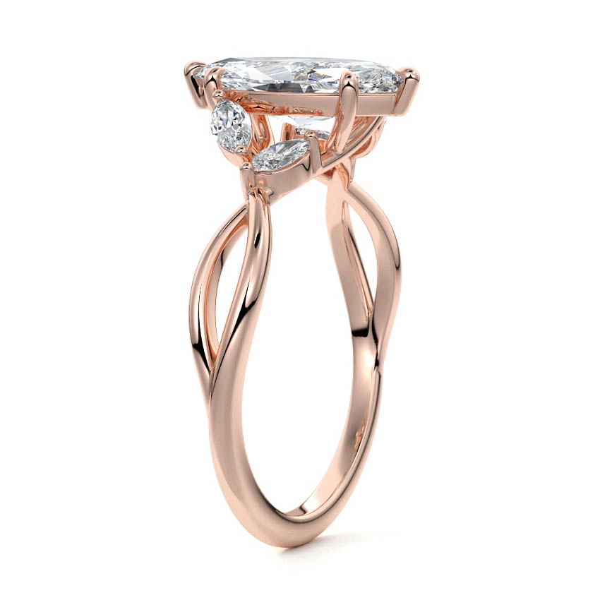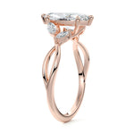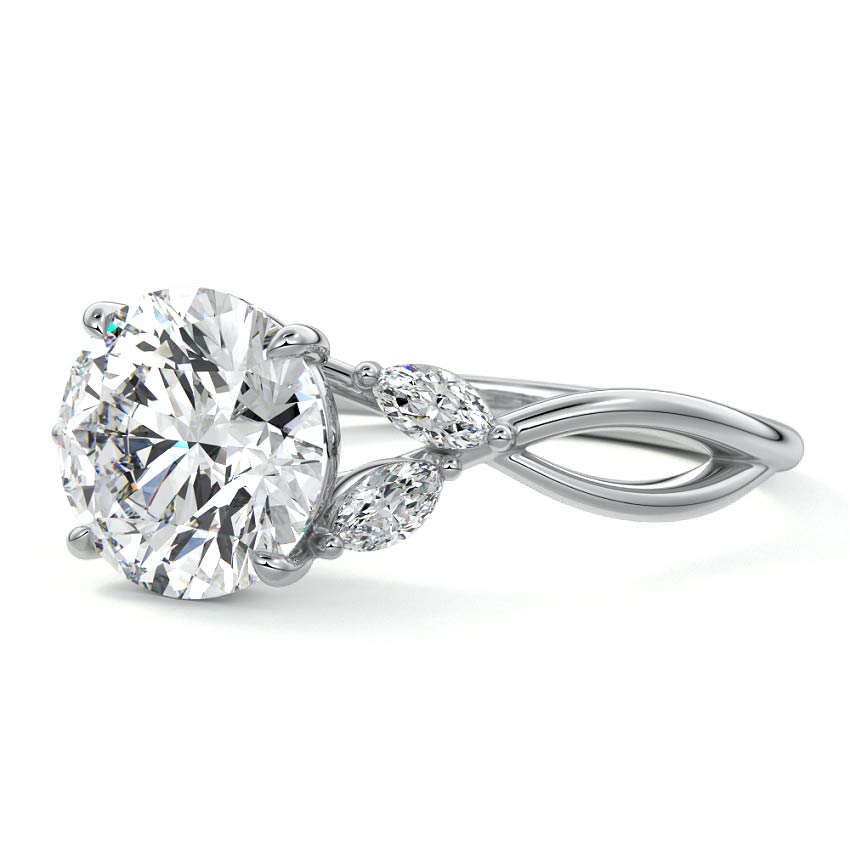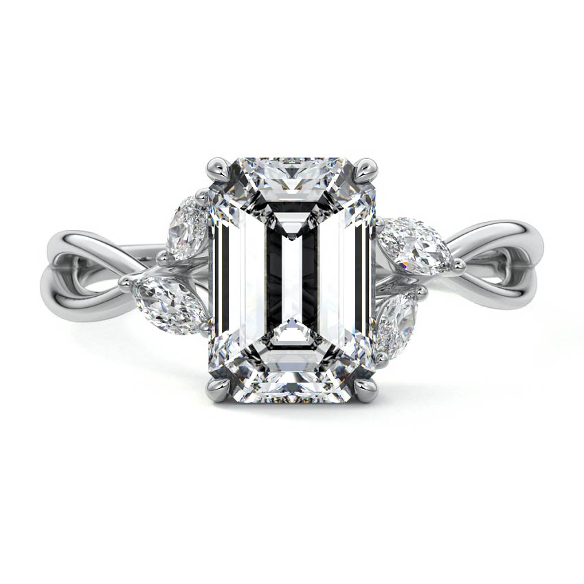This ring setting draws inspiration from the natural world, with a design reminiscent of vines and flowers. On each side of the central feature, two marquise-cut diamonds gracefully integrate into the design, resembling delicate vine leaves or petals, creating an enchanting and organic aesthetic.