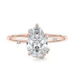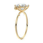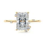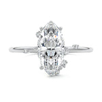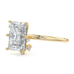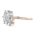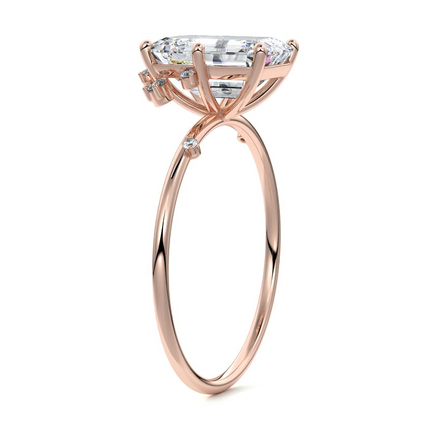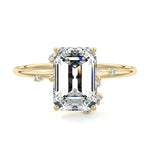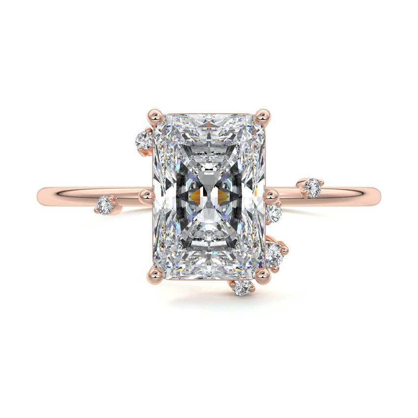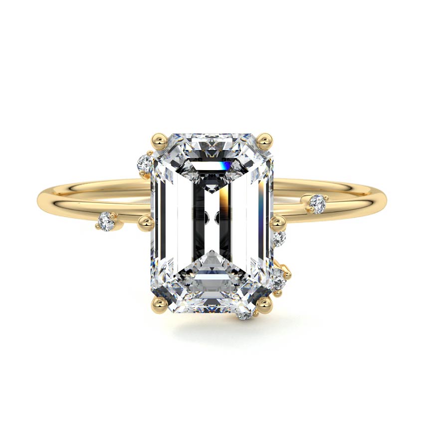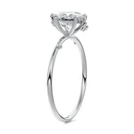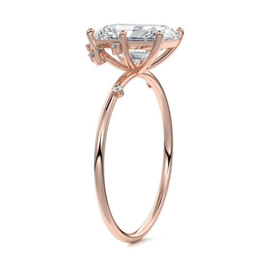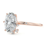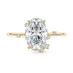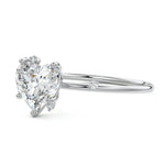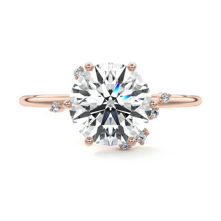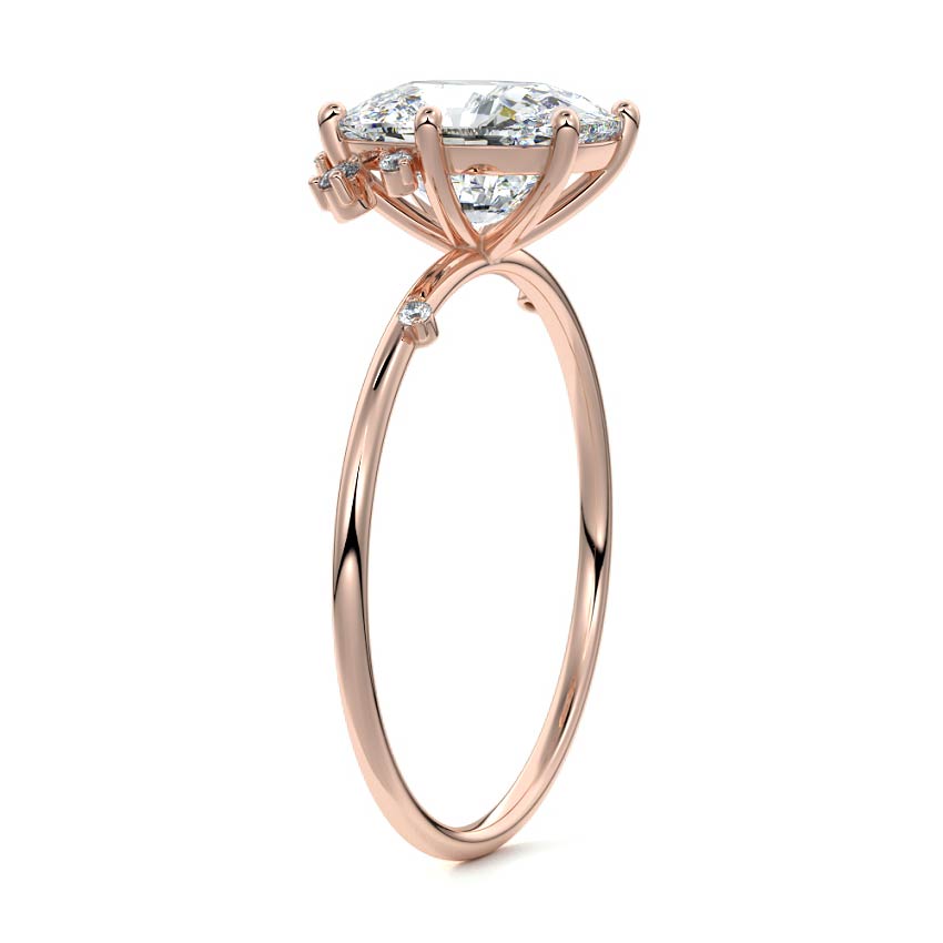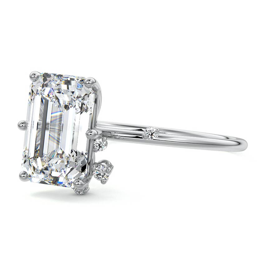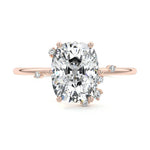 This setting secures the center stone with six meticulously crafted prongs while embellishing the band with the added charm of intermittently positioned round brilliant cut diamonds, resulting in a ring that exudes both classic beauty and modern sophistication.