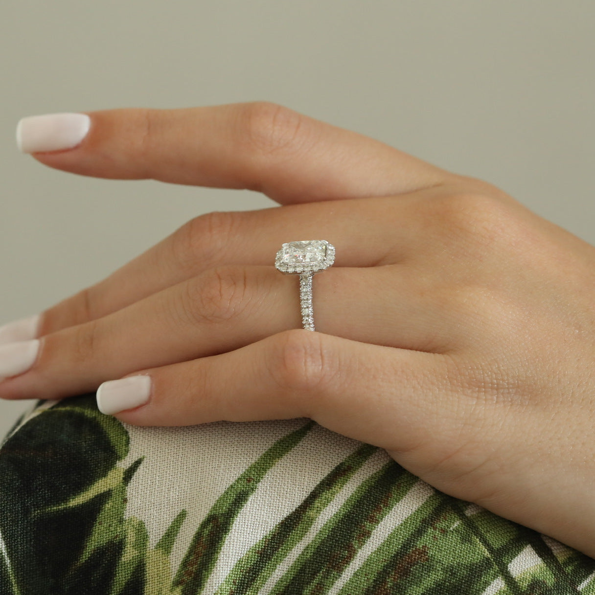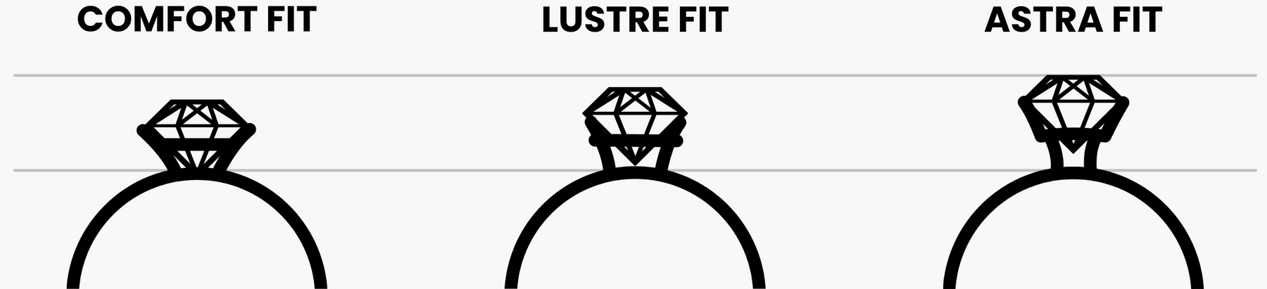 Settings with a Lustre Fit have a medium profile, and have a balance of aesthetics and wearability. The center stone sits slightly higher above the finger, while any brilliantly-cut side stones are nestled closely to the shank. It is the perfect choice for those looking for a slightly more bold style that is still easy-to-wear for everyday.