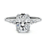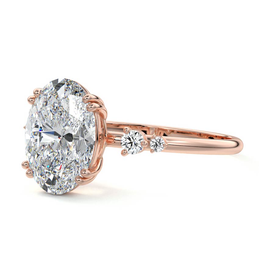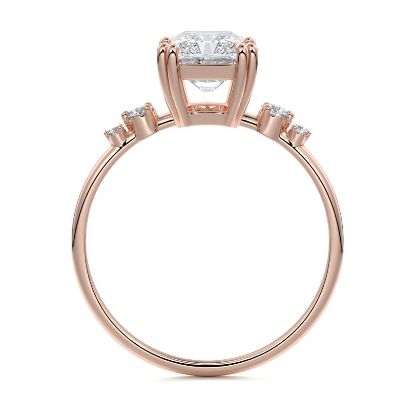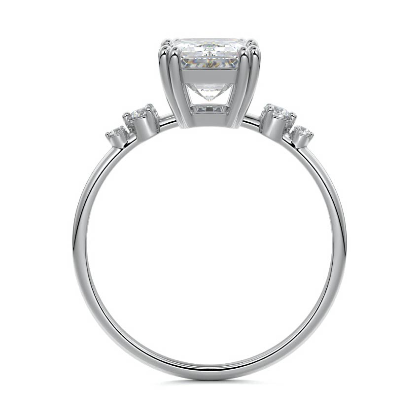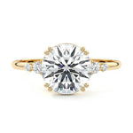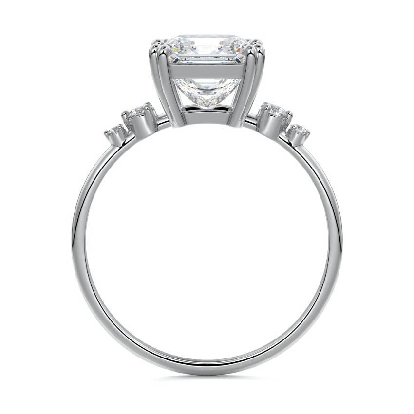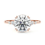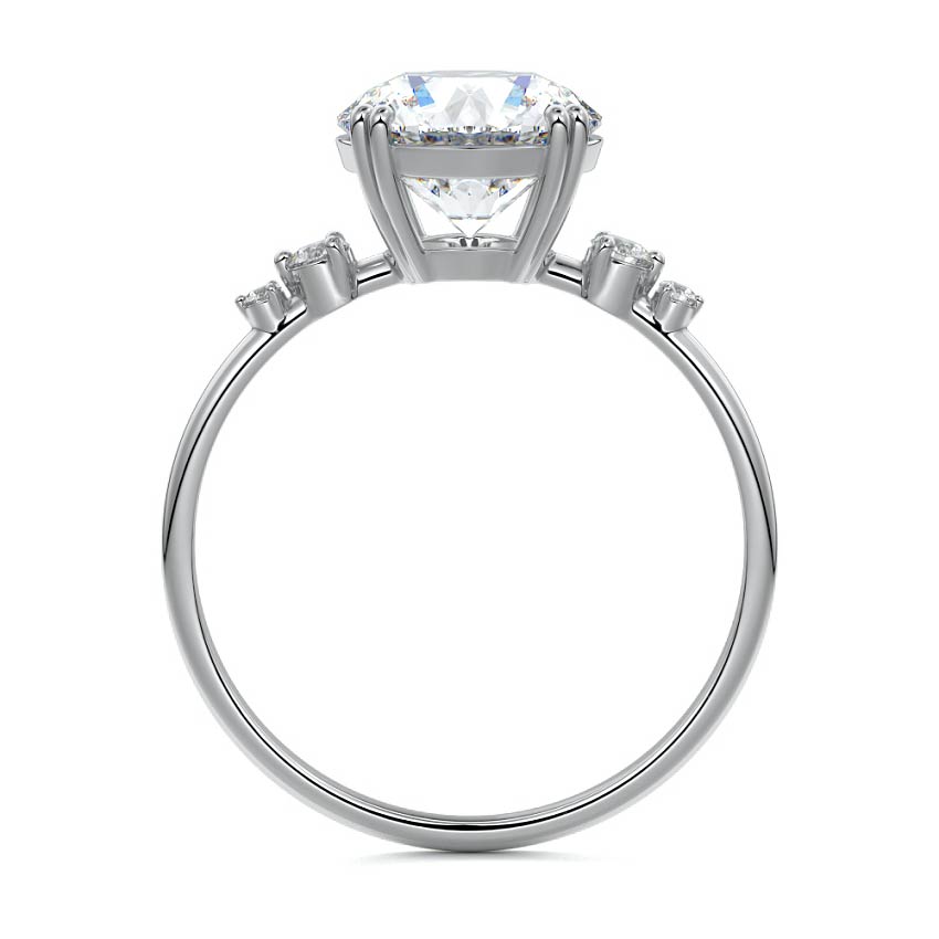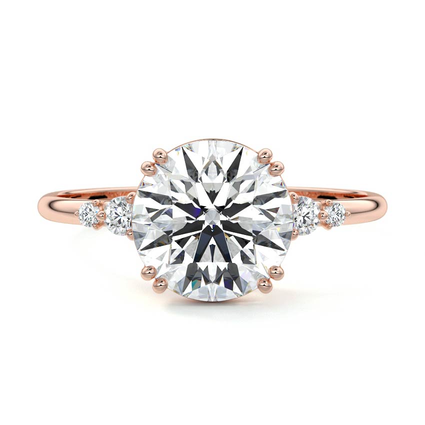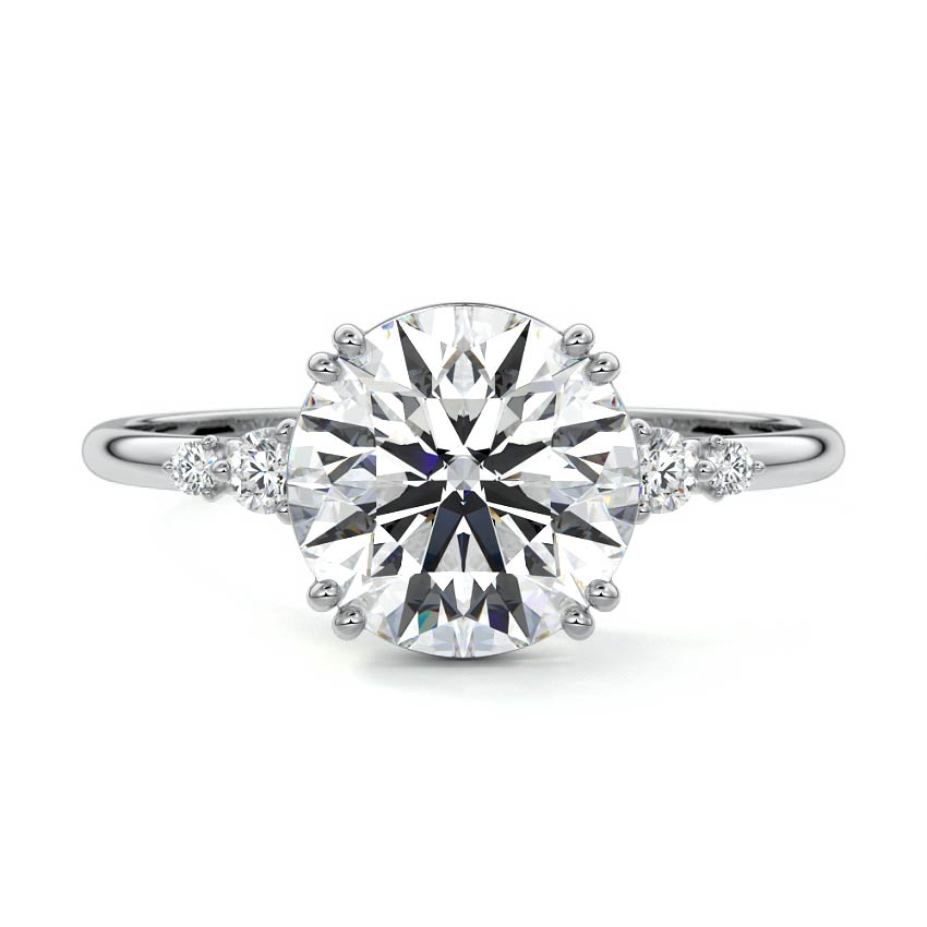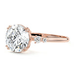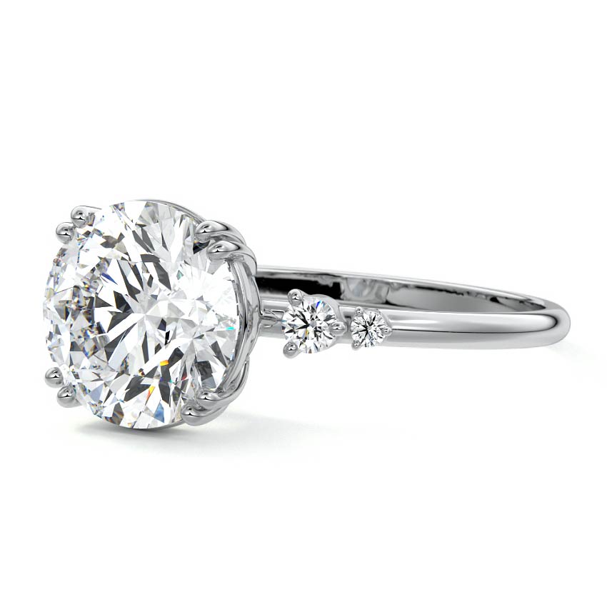 This vintage-inspired setting showcases a high set center stone positioned elegantly with a delicate double-prong arrangement. Flanking the center stone are two smaller round brilliant-cut diamonds, enhancing the setting's timeless and graceful allure.