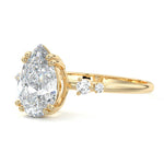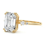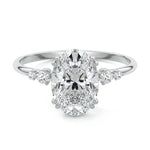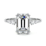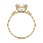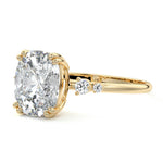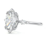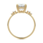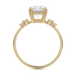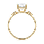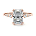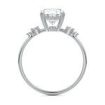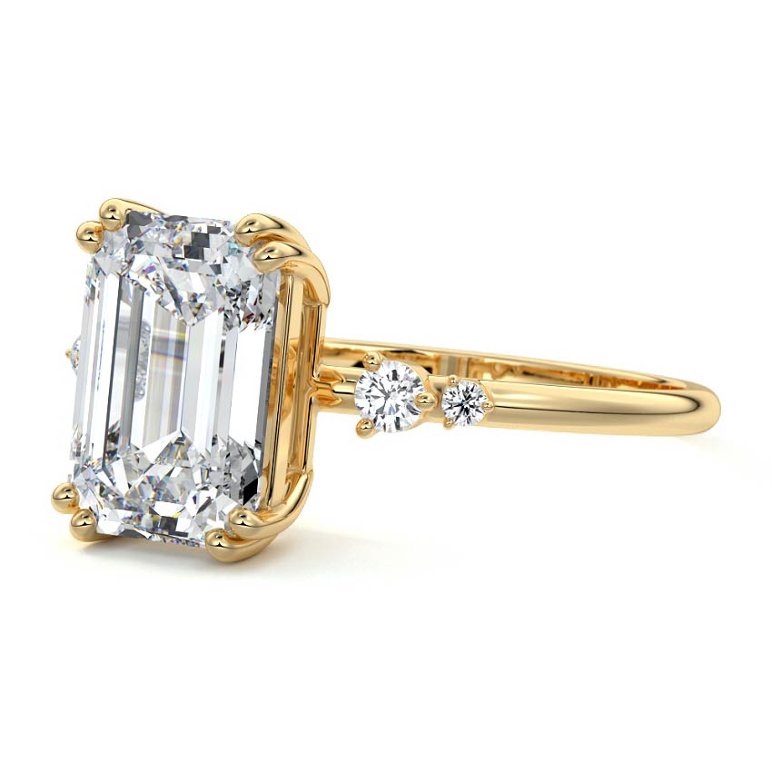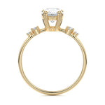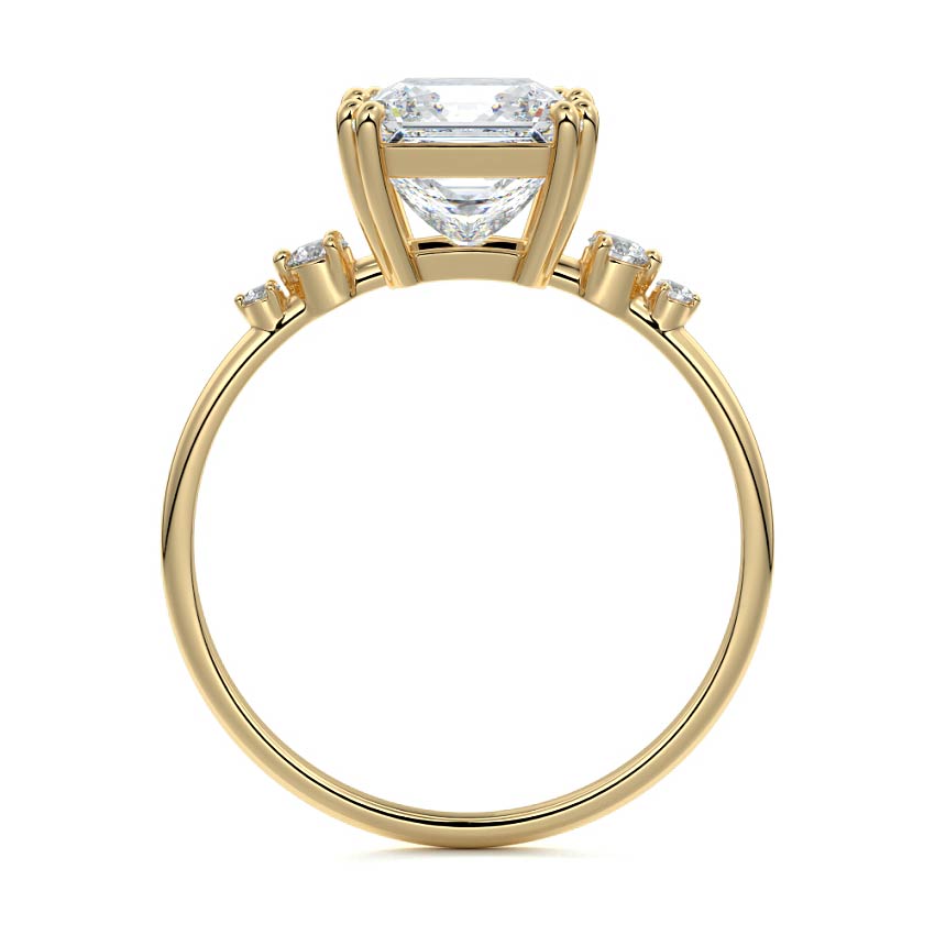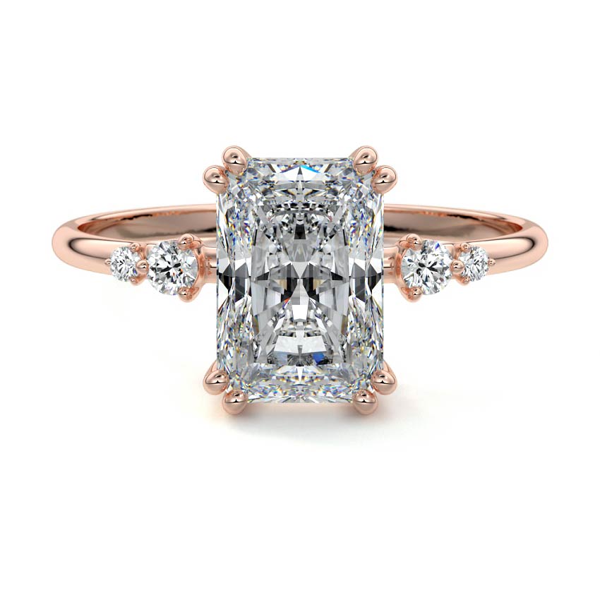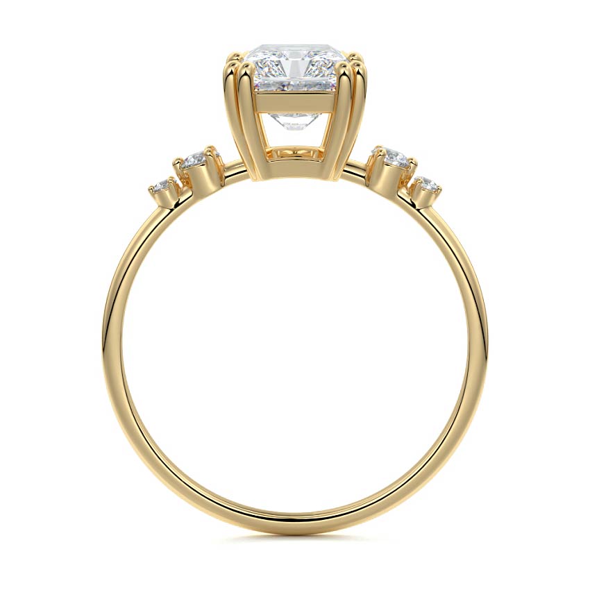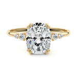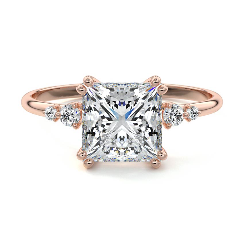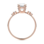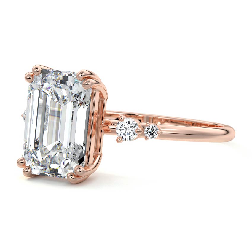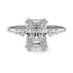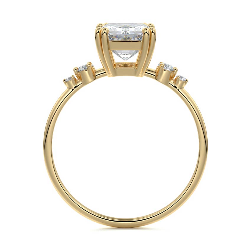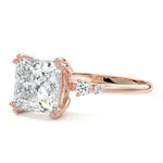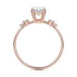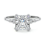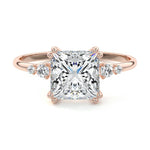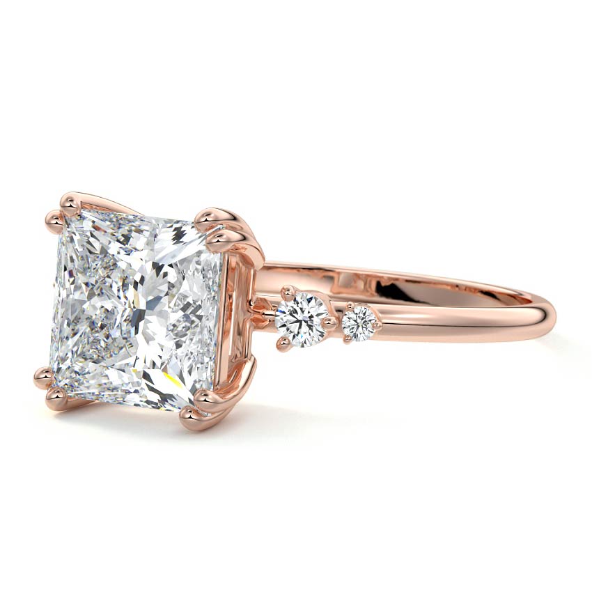 This vintage-inspired setting showcases a high set center stone positioned elegantly with a delicate double-prong arrangement. Flanking the center stone are two smaller round brilliant-cut diamonds, enhancing the setting's timeless and graceful allure.