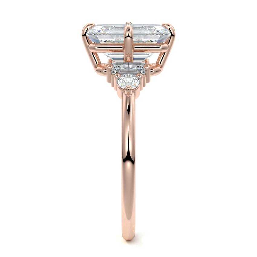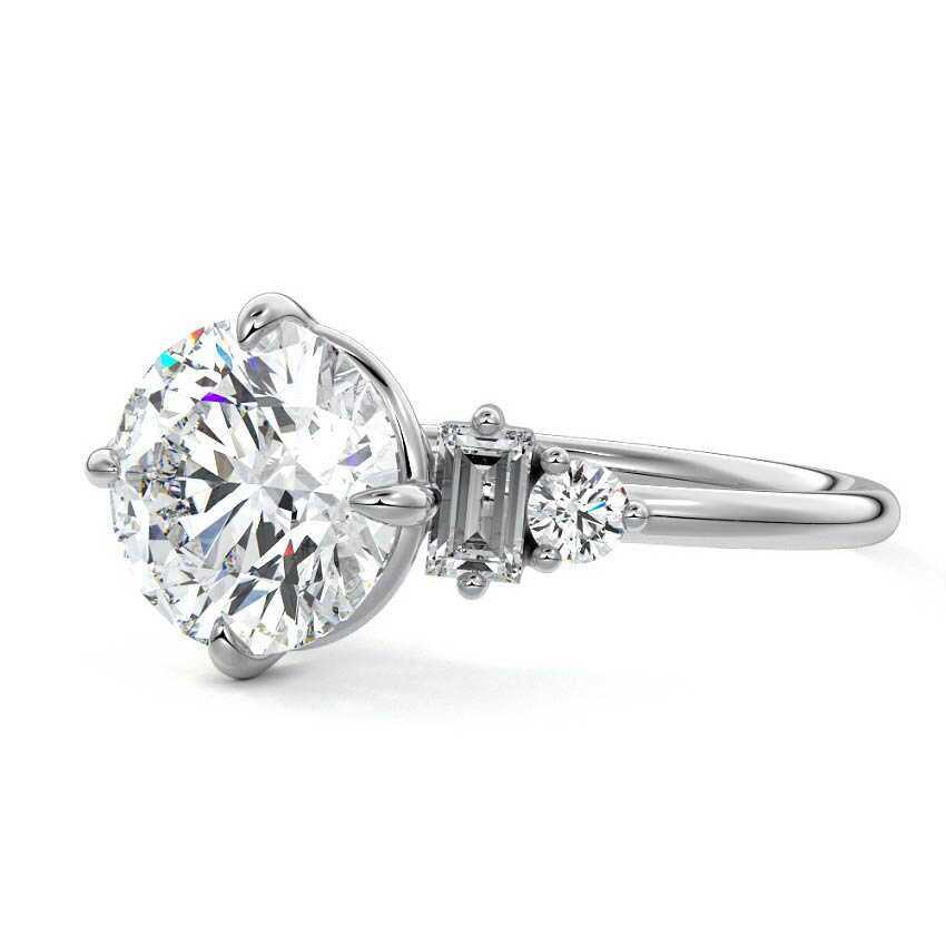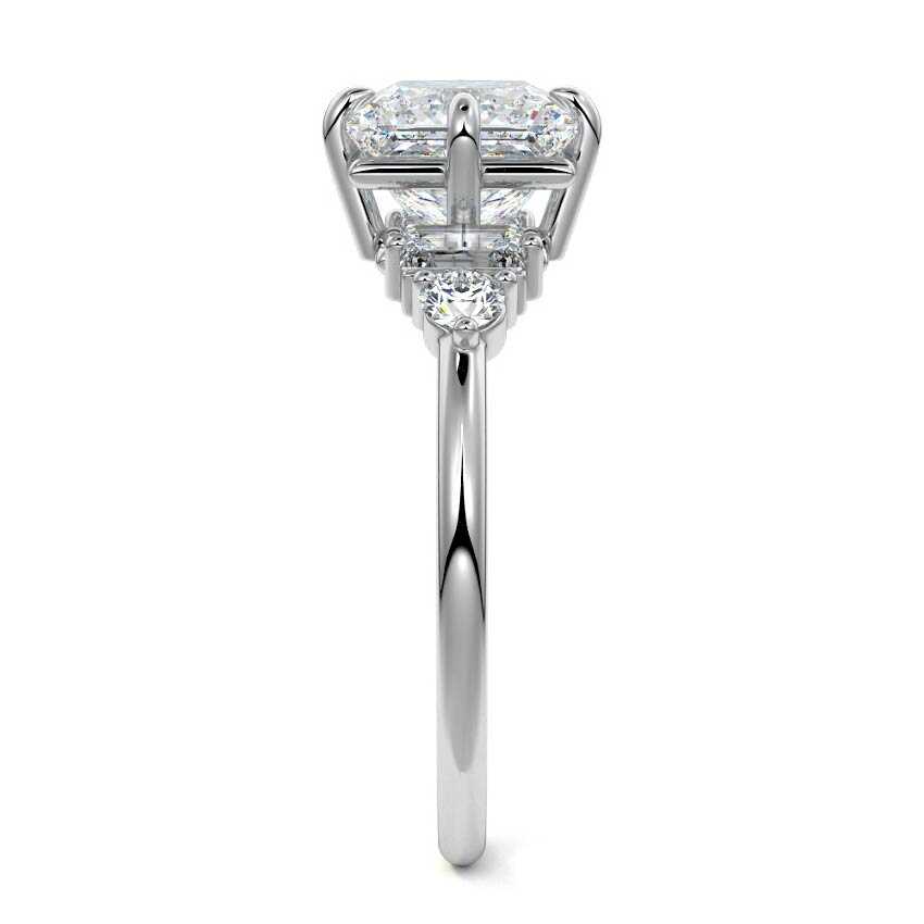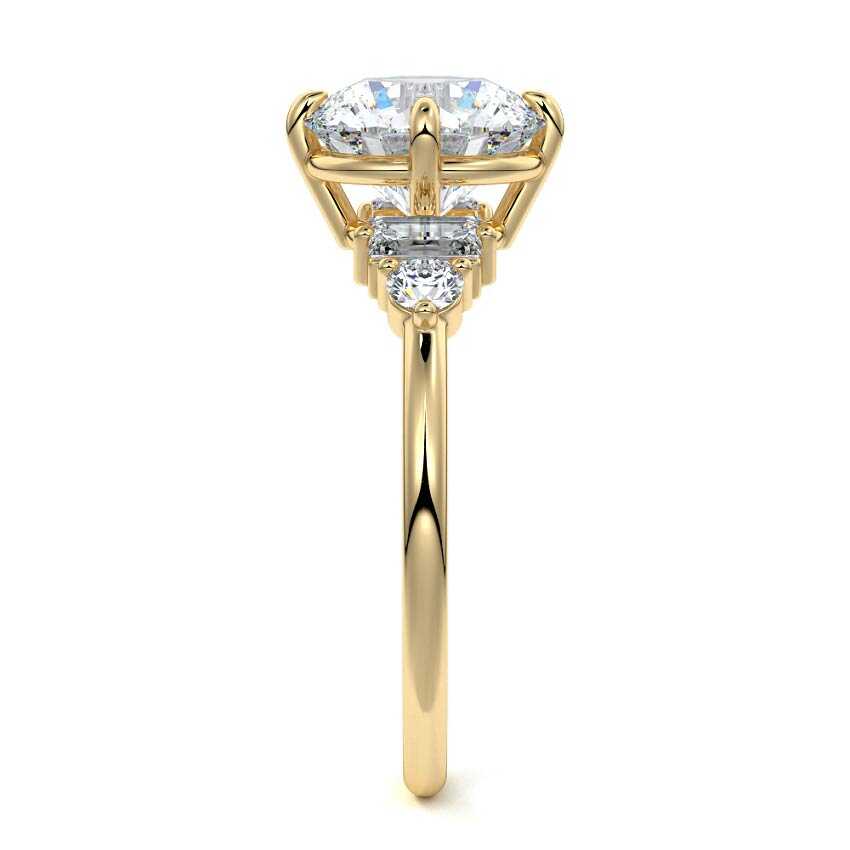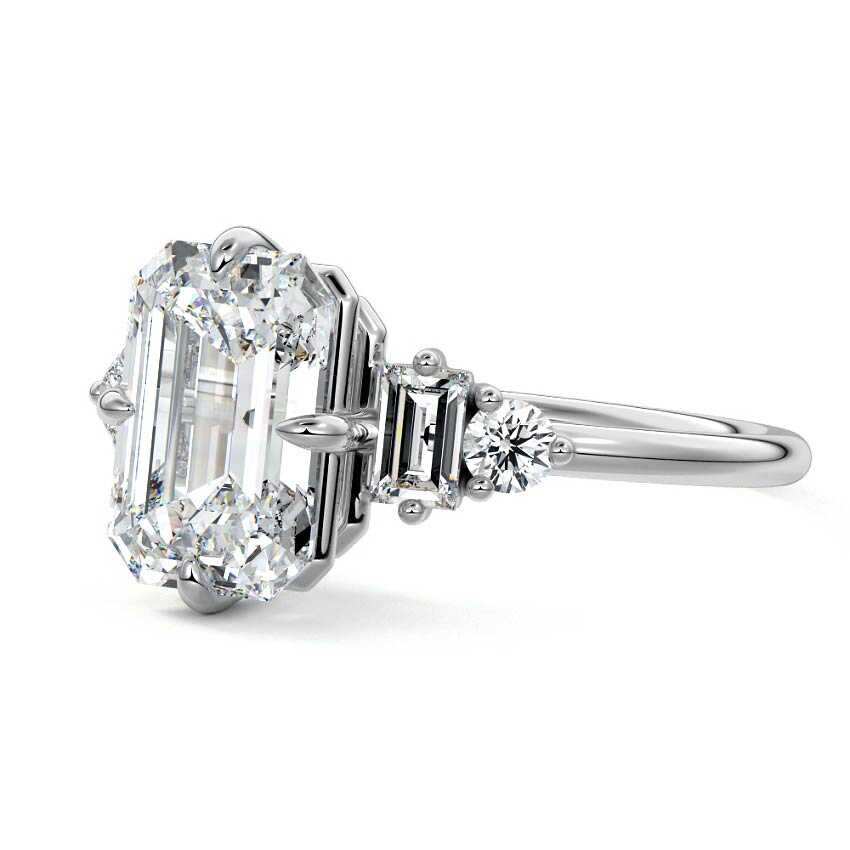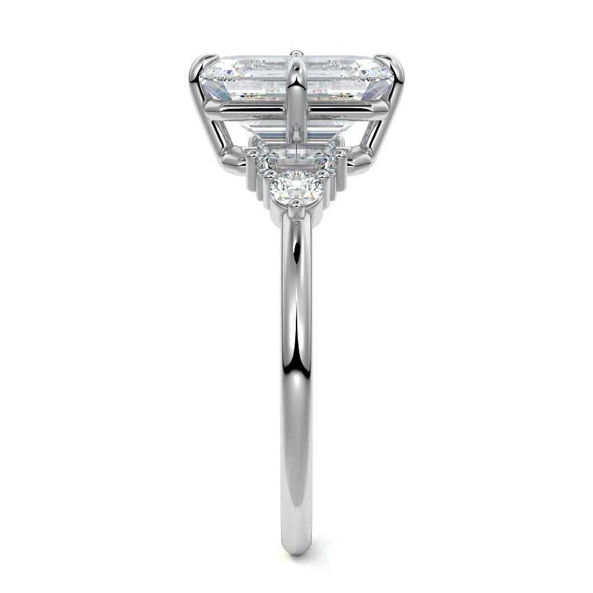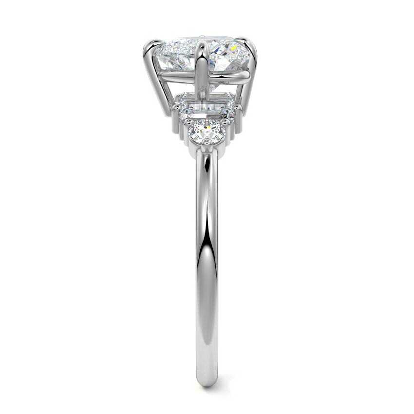 This unique engagement ring showcases a stunning design with baguette and round diamonds beautifully placed on each side of the center stone. The combination of sleek baguettes and sparkling rounds creates a captivating contrast, enhancing the overall brilliance and elegance of the ring. This exquisite arrangement not only adds visual interest but also symbolizes the perfect balance of strength and romance, making it a truly one-of-a-kind choice for your special moment.