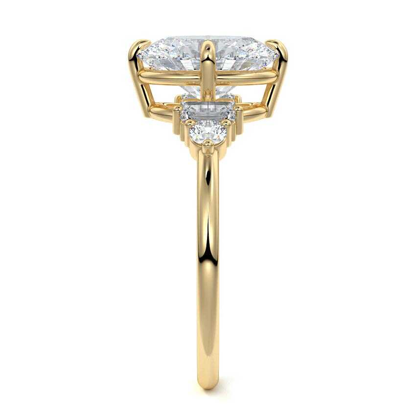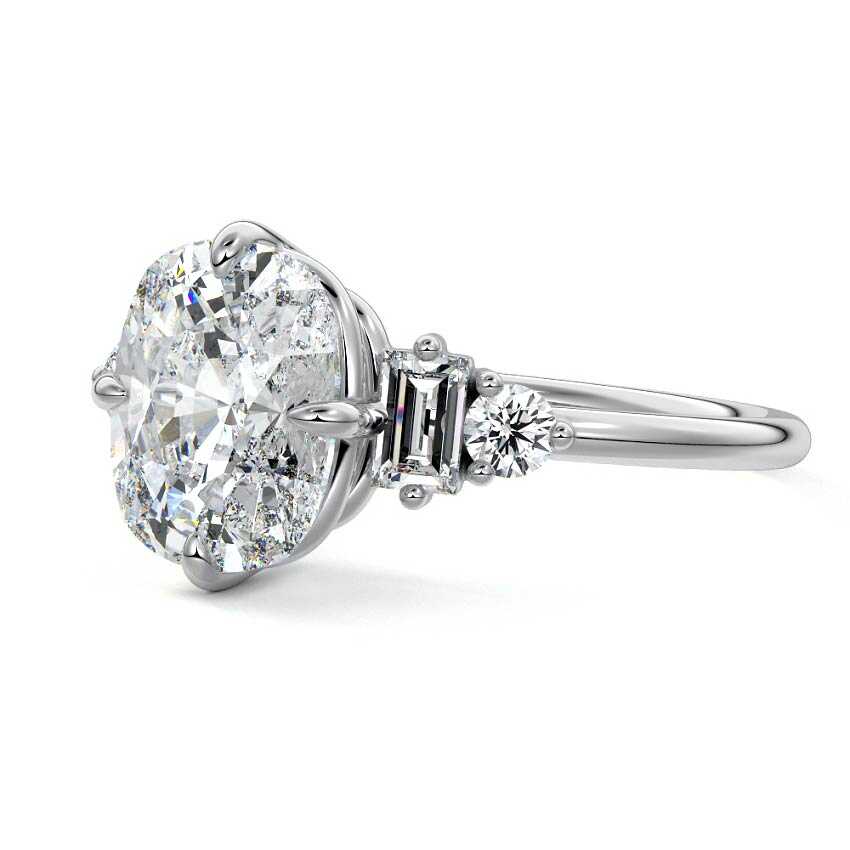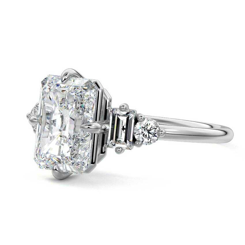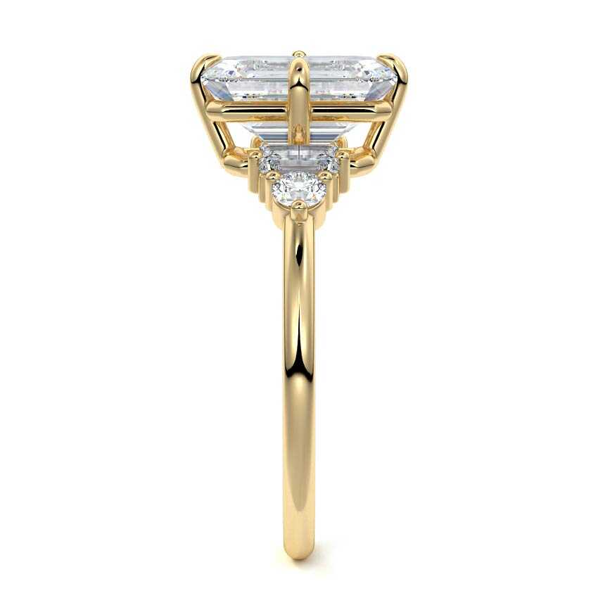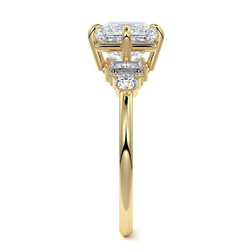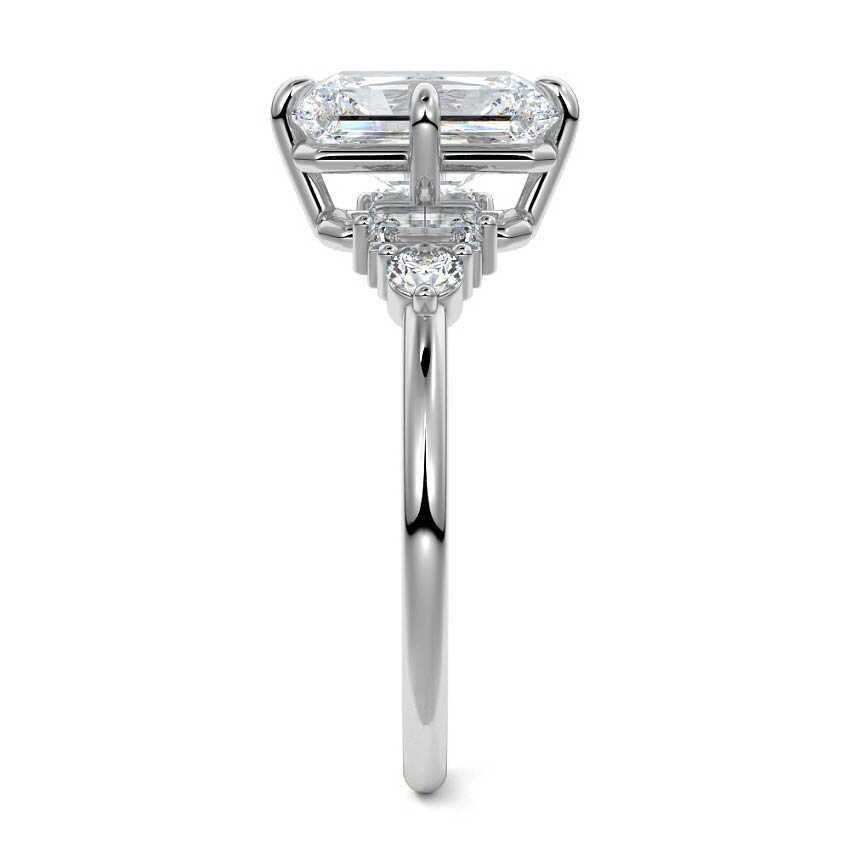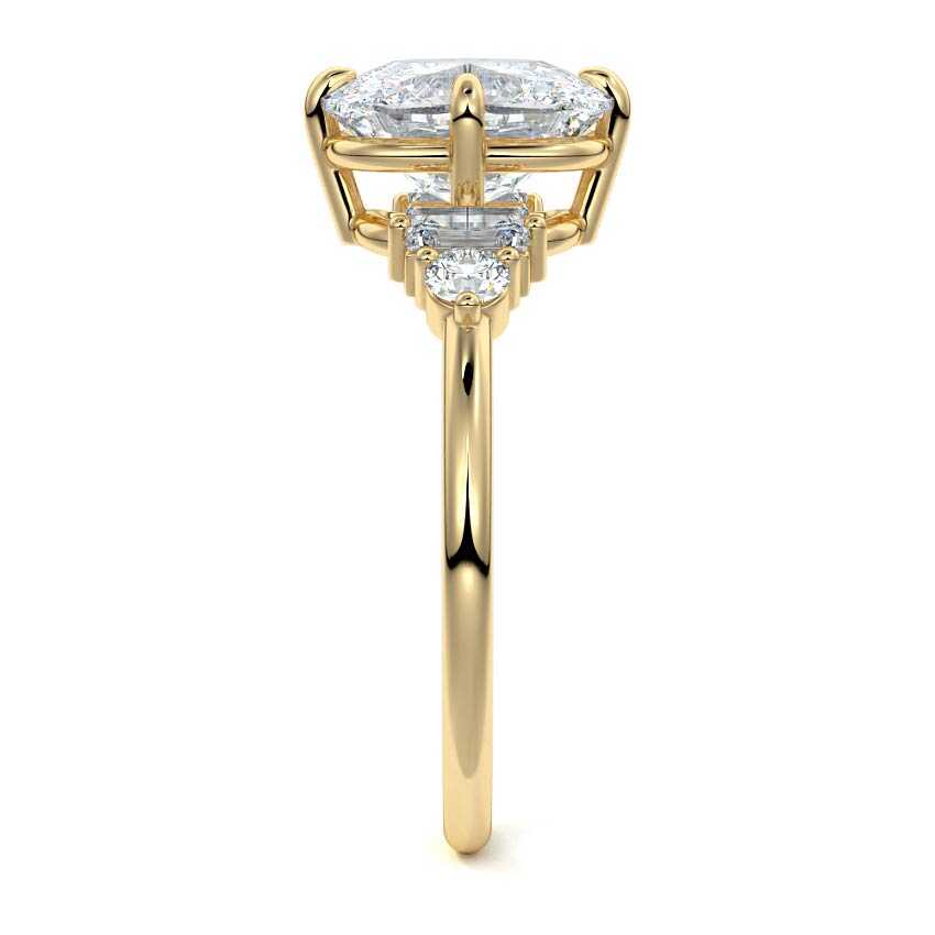 This unique engagement ring showcases a stunning design with baguette and round diamonds beautifully placed on each side of the center stone. The combination of sleek baguettes and sparkling rounds creates a captivating contrast, enhancing the overall brilliance and elegance of the ring. This exquisite arrangement not only adds visual interest but also symbolizes the perfect balance of strength and romance, making it a truly one-of-a-kind choice for your special moment.