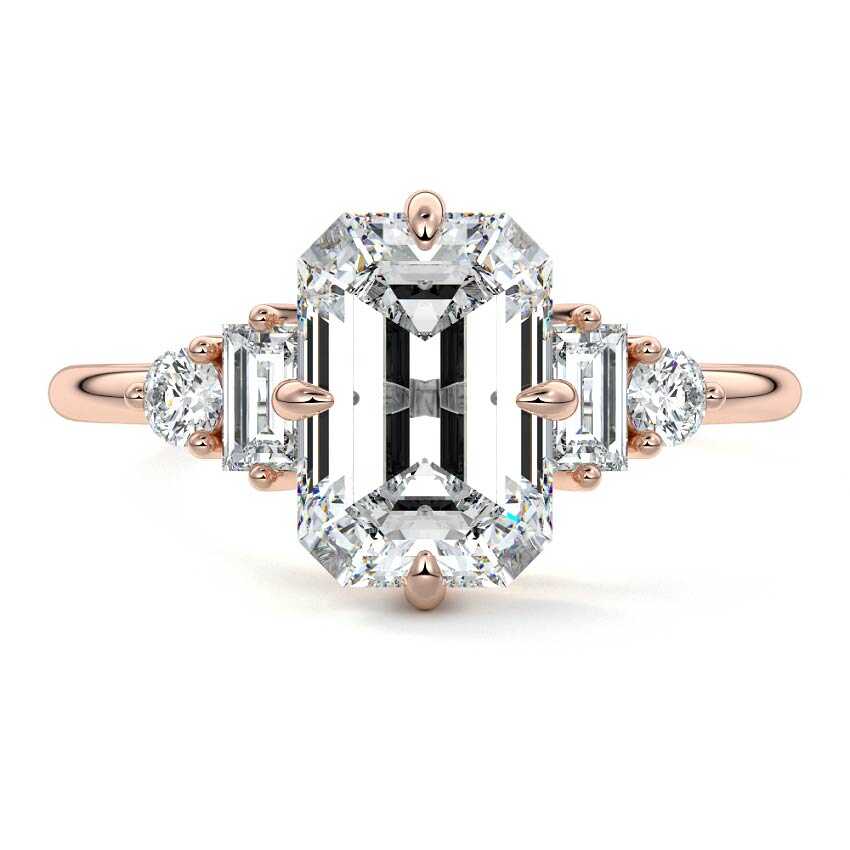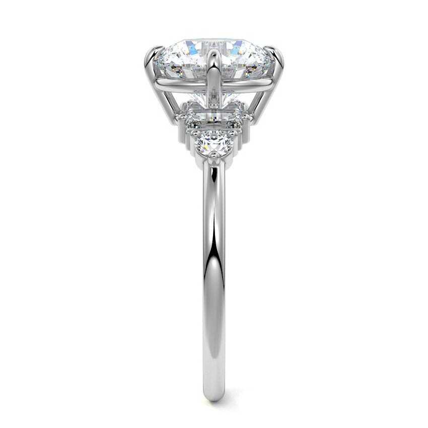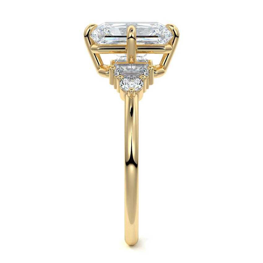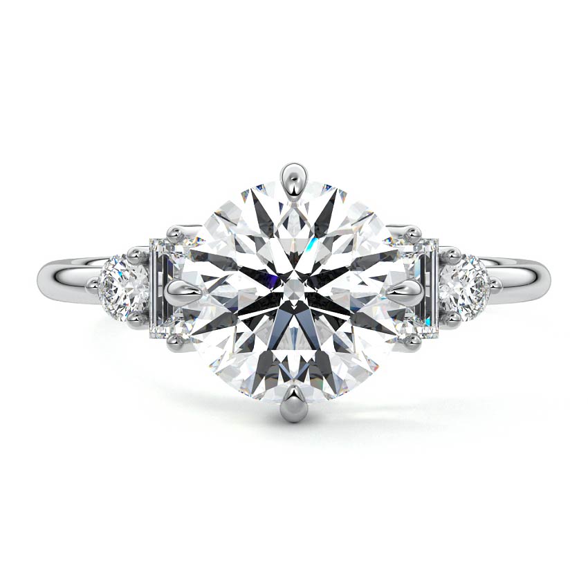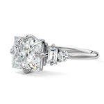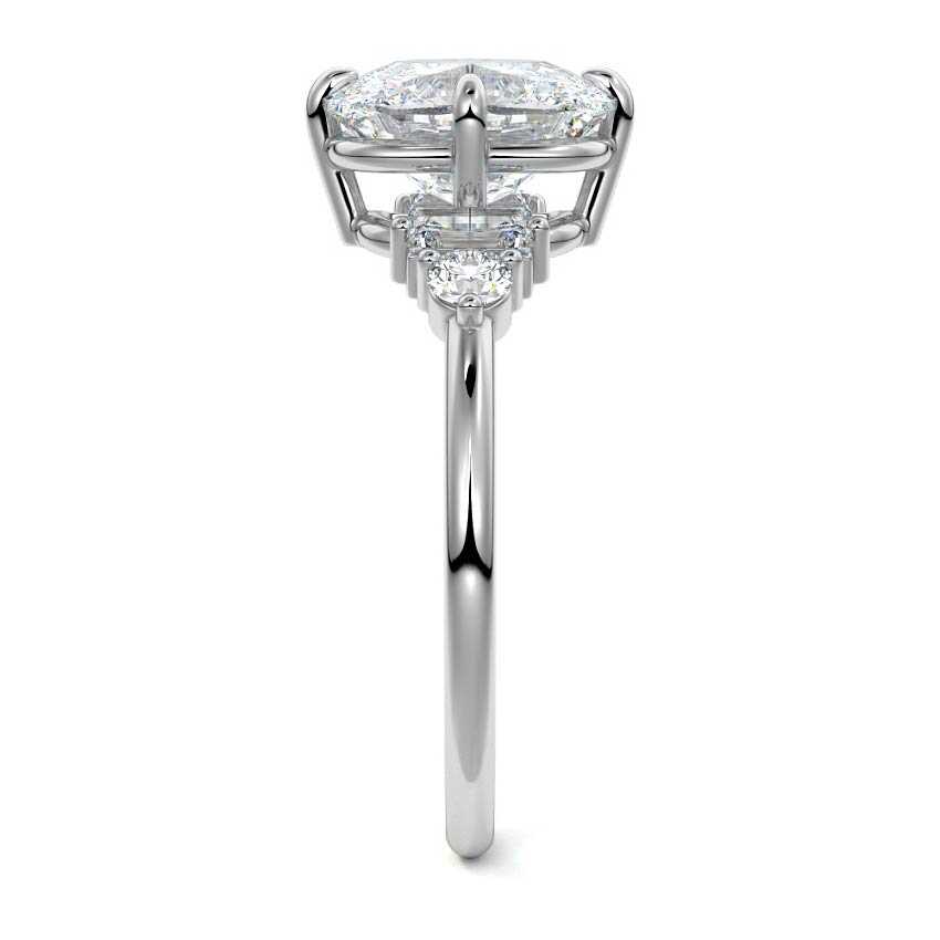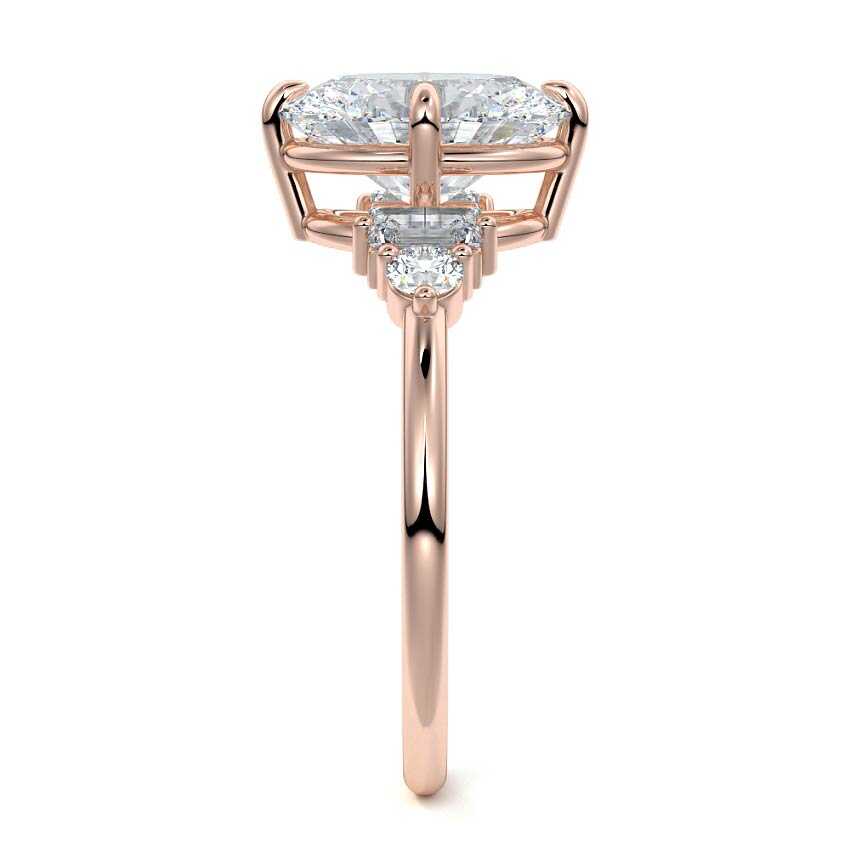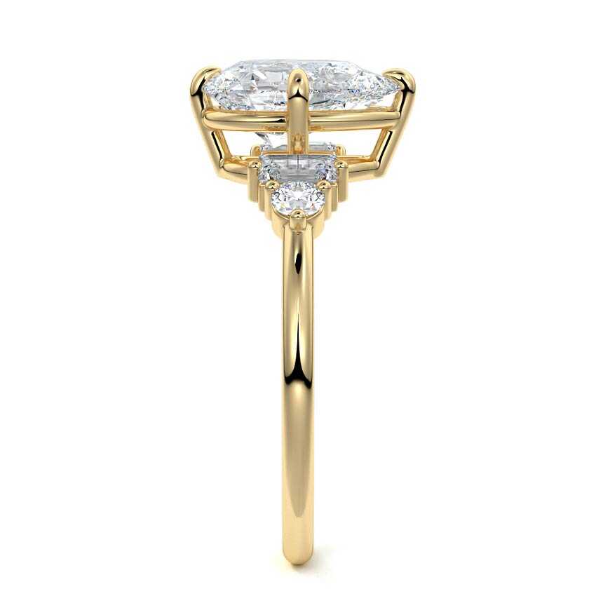 This unique engagement ring showcases a stunning design with baguette and round diamonds beautifully placed on each side of the center stone. The combination of sleek baguettes and sparkling rounds creates a captivating contrast, enhancing the overall brilliance and elegance of the ring. This exquisite arrangement not only adds visual interest but also symbolizes the perfect balance of strength and romance, making it a truly one-of-a-kind choice for your special moment.