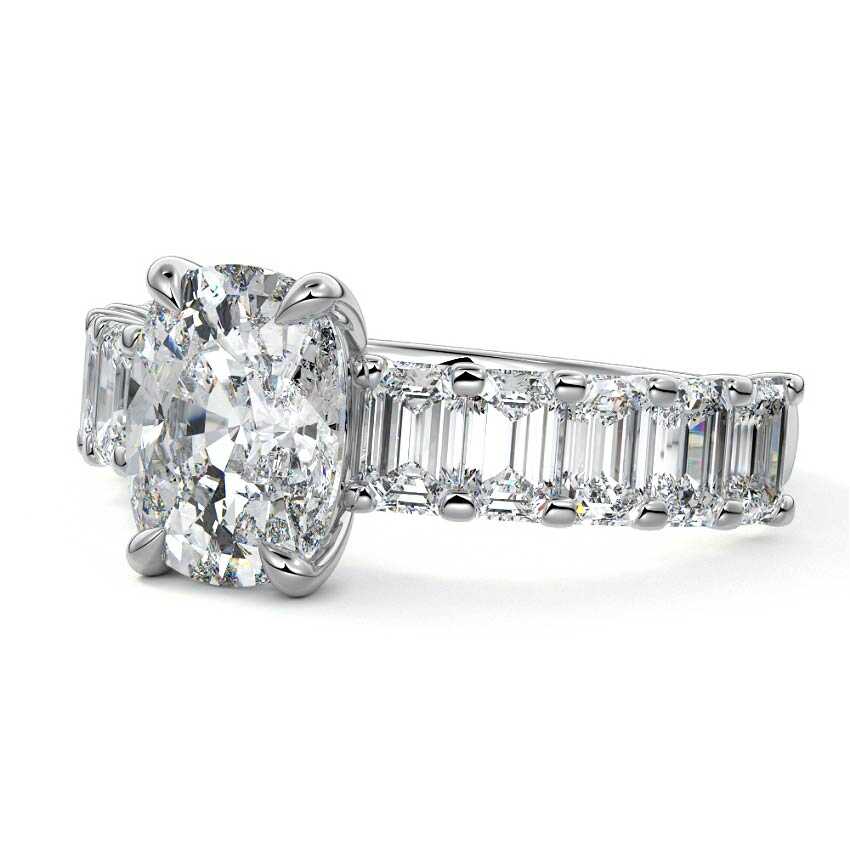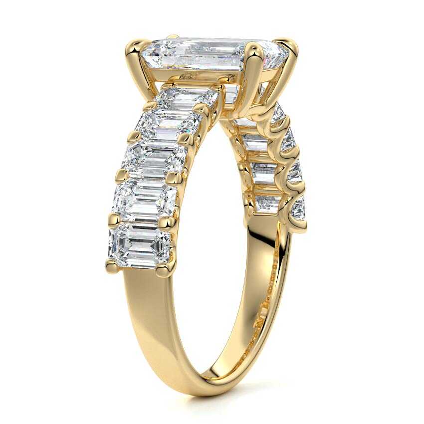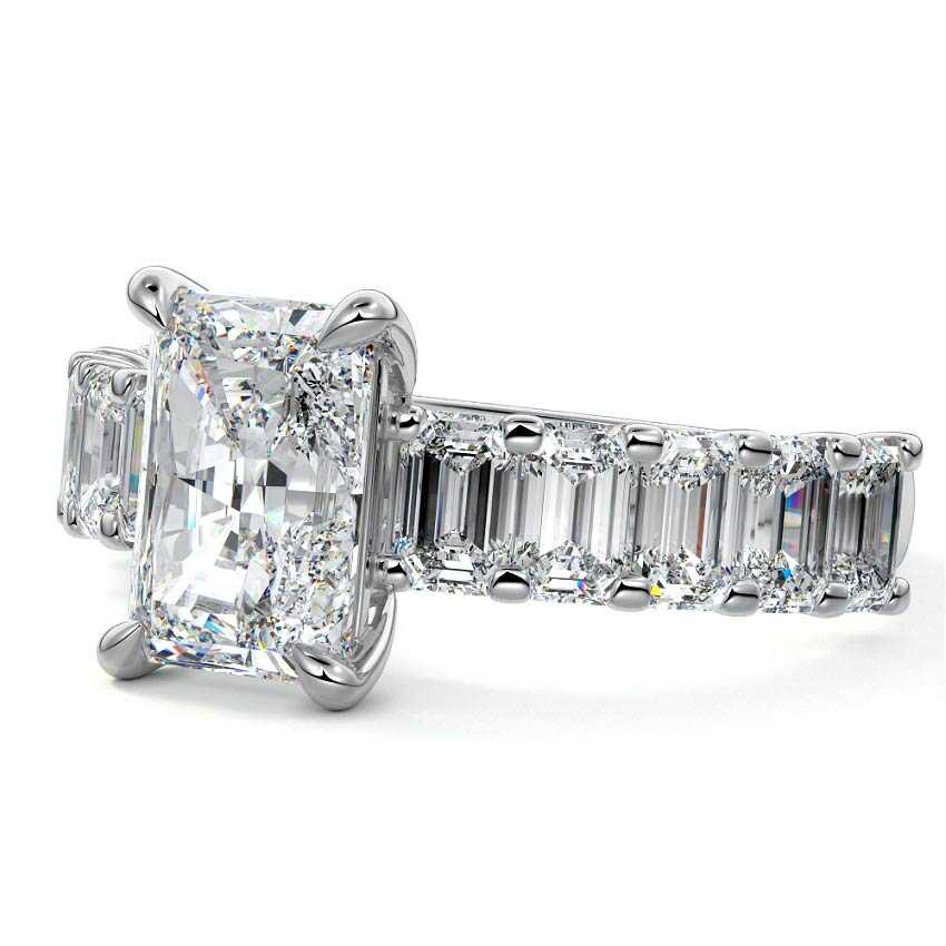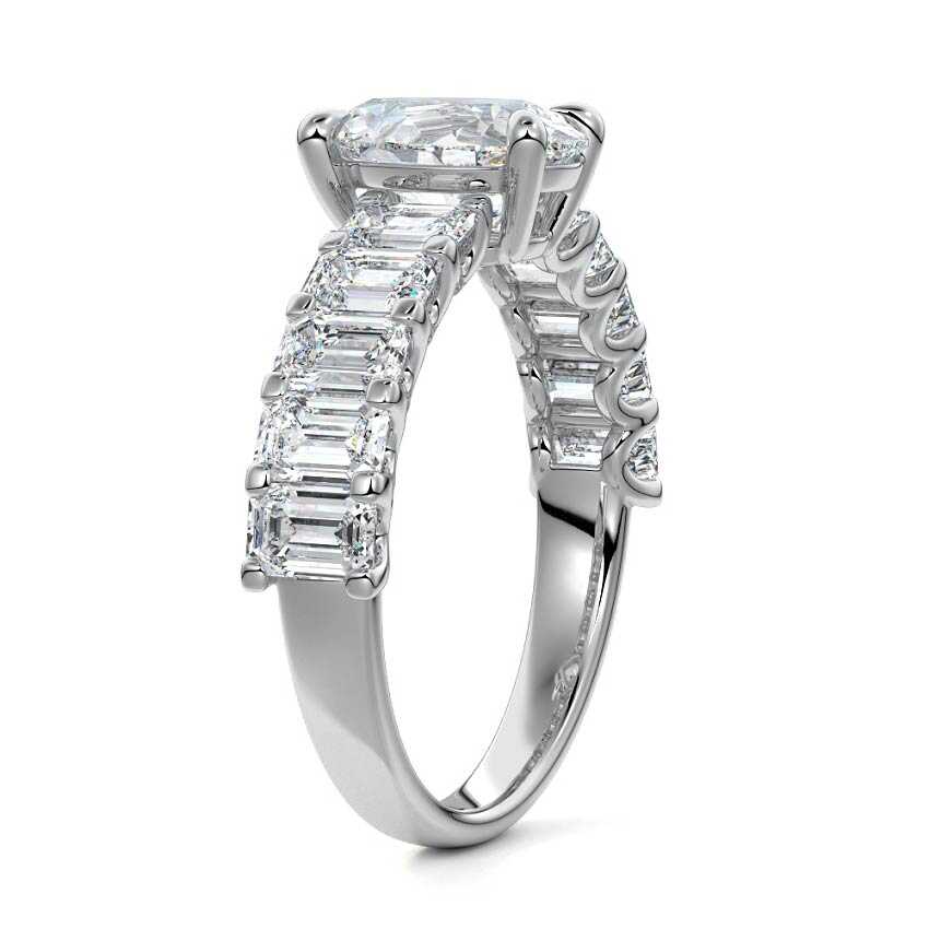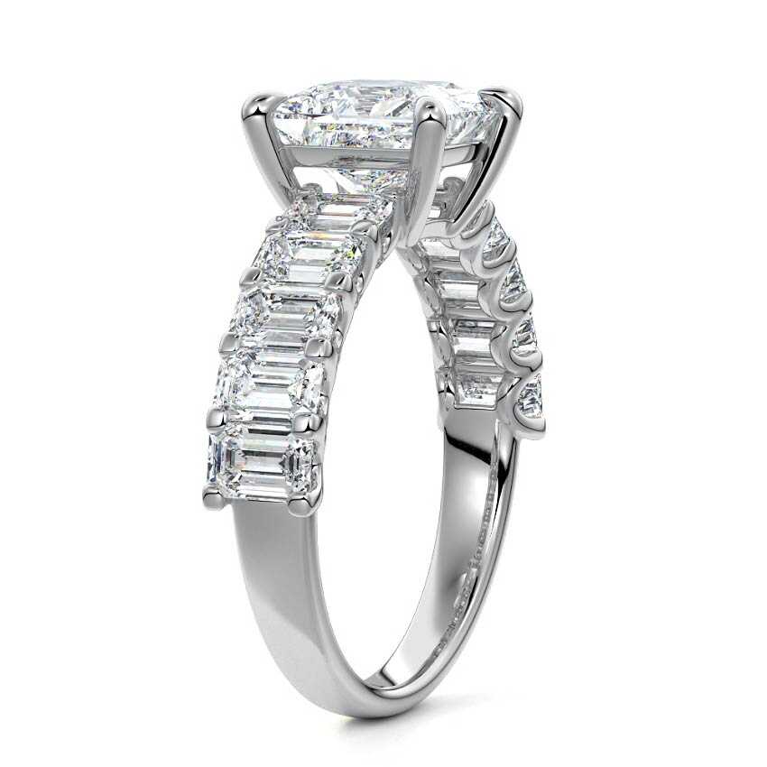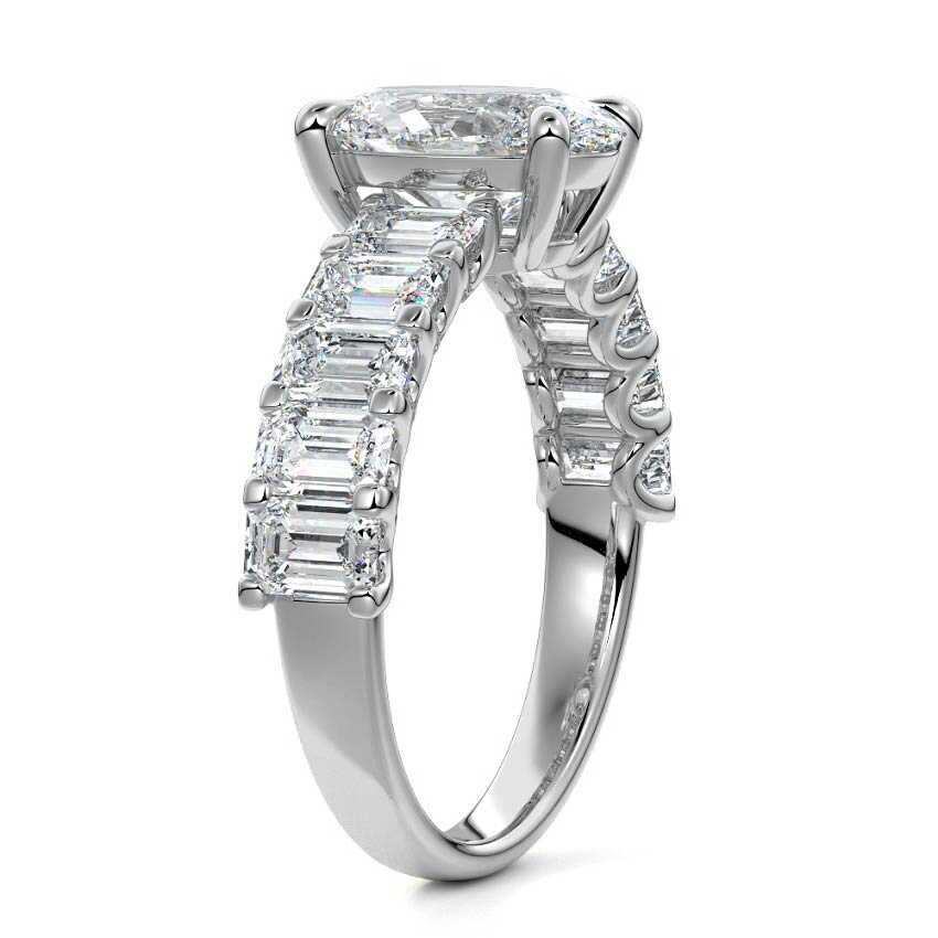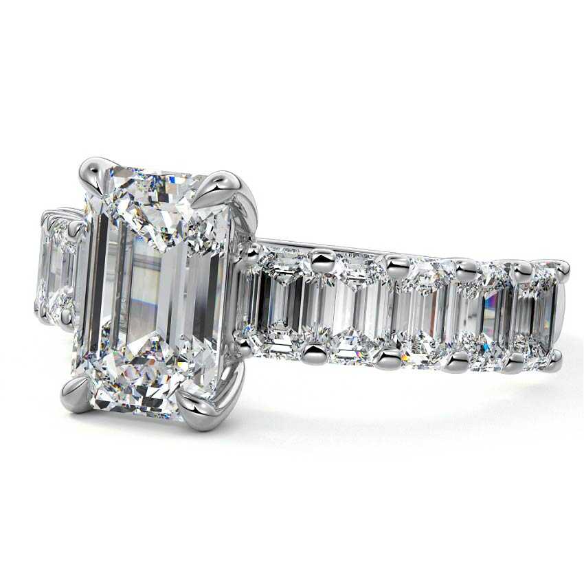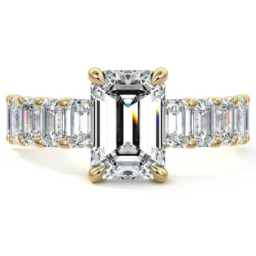 This stunning engagement ring features a half-way band set with sparkling emerald-cut diamonds, creating a breathtakingly elegant design. The elongated shape of the emerald diamonds lends a modern touch while enhancing the ring's overall clarity and brilliance. The half-way setting allows for an unobstructed view of the center stone, ensuring the entire ring has an ice-clear appearance. Perfect for those who appreciate unique, sophisticated jewelry, this ring is a striking symbol of love and commitment.