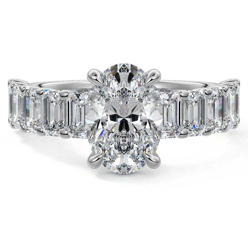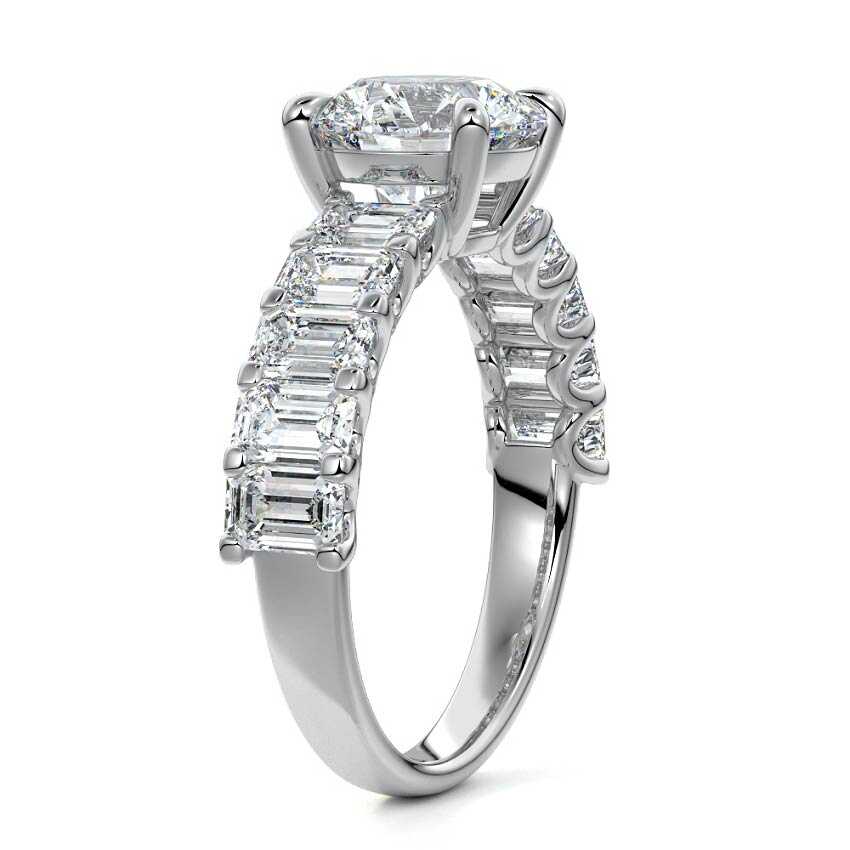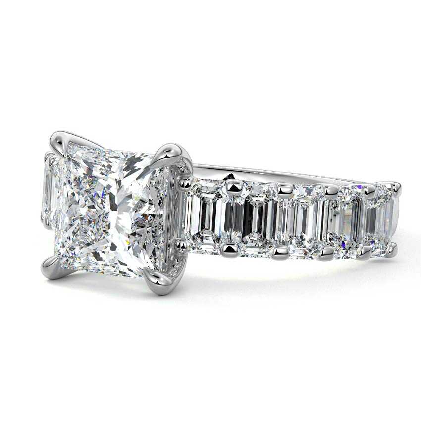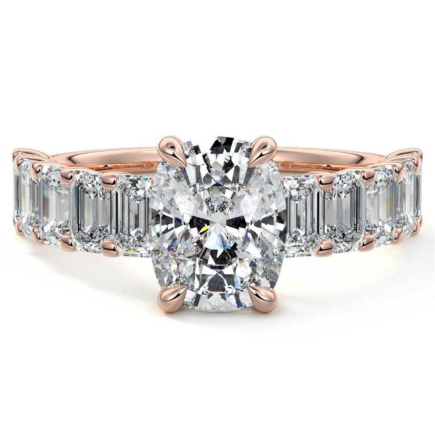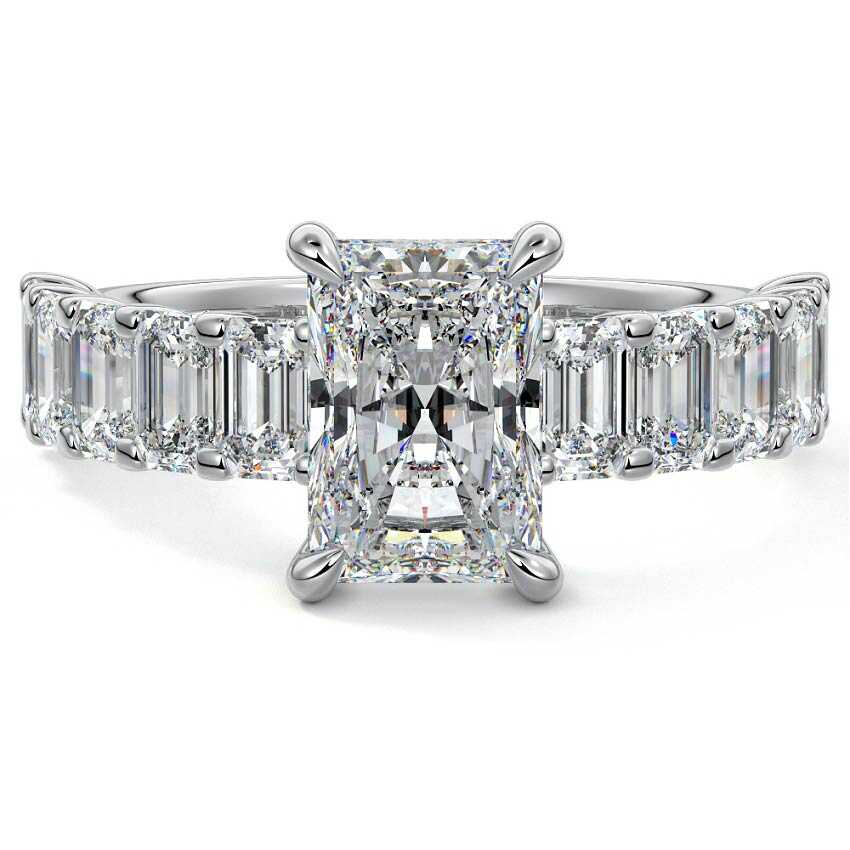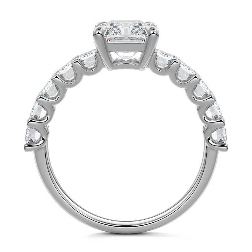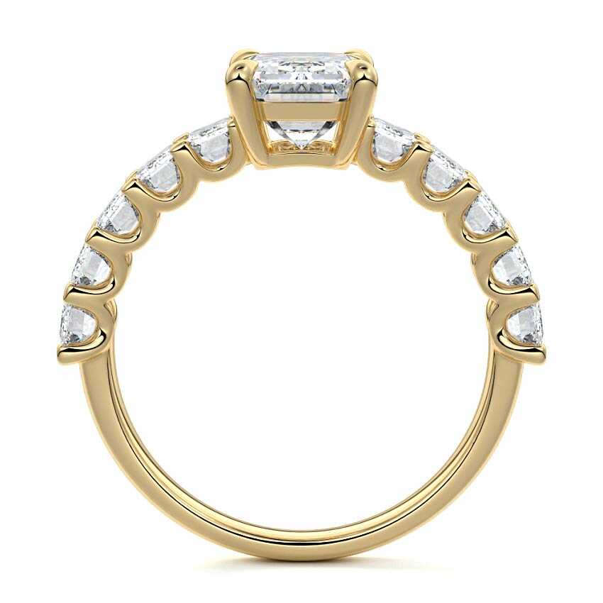 This stunning engagement ring features a half-way band set with sparkling emerald-cut diamonds, creating a breathtakingly elegant design. The elongated shape of the emerald diamonds lends a modern touch while enhancing the ring's overall clarity and brilliance. The half-way setting allows for an unobstructed view of the center stone, ensuring the entire ring has an ice-clear appearance. Perfect for those who appreciate unique, sophisticated jewelry, this ring is a striking symbol of love and commitment.