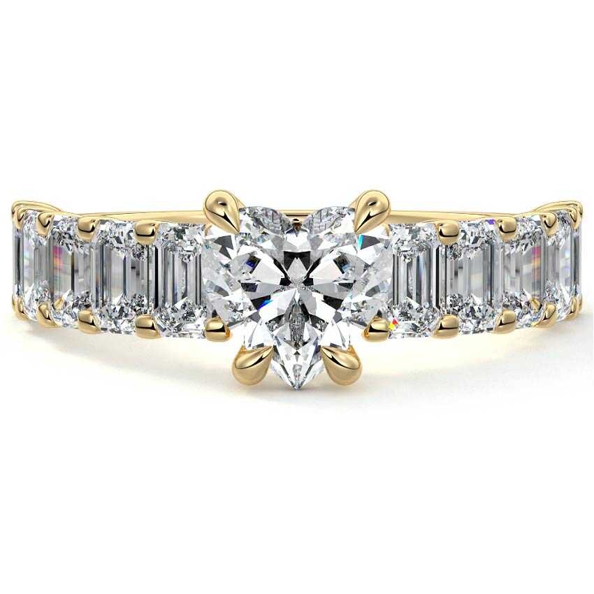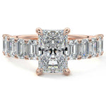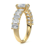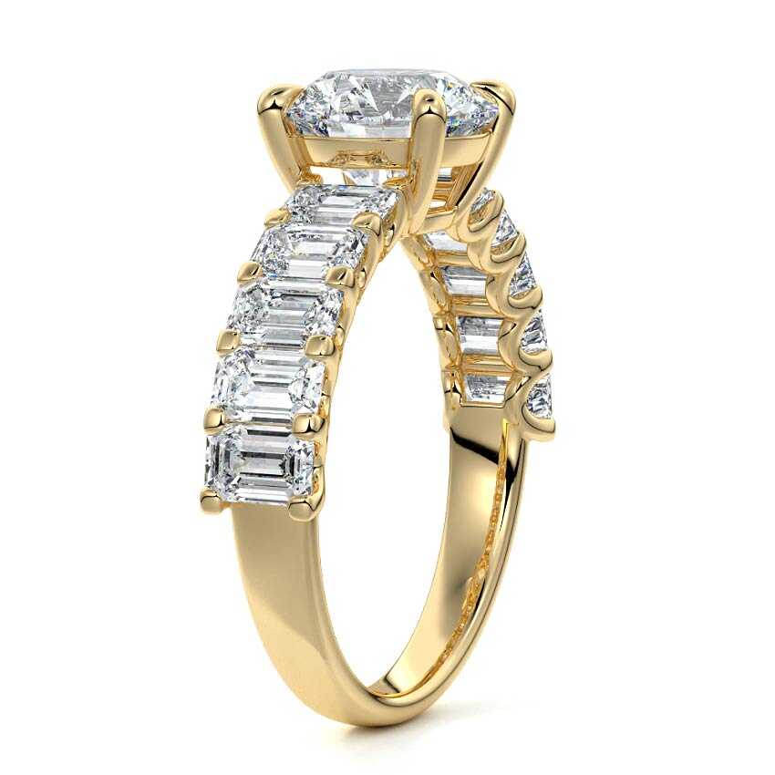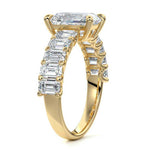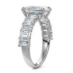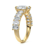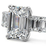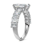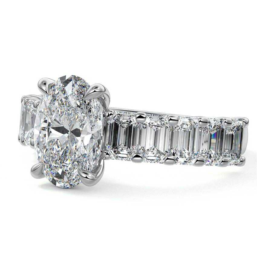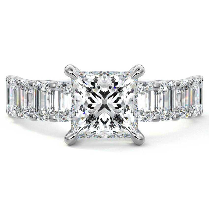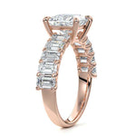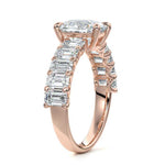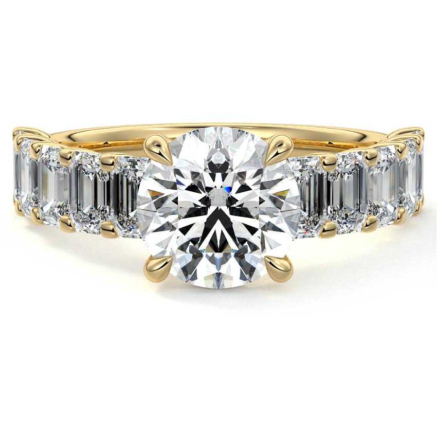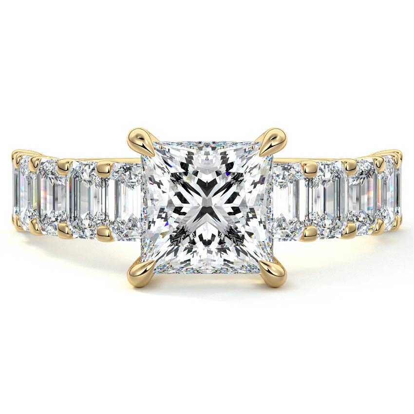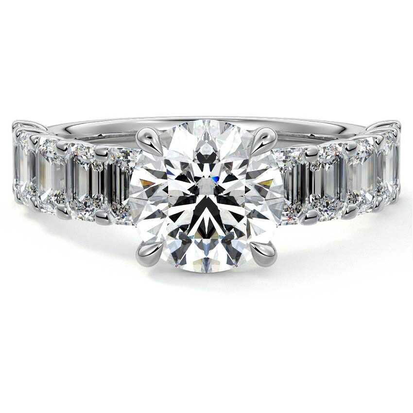 This stunning engagement ring features a half-way band set with sparkling emerald-cut diamonds, creating a breathtakingly elegant design. The elongated shape of the emerald diamonds lends a modern touch while enhancing the ring's overall clarity and brilliance. The half-way setting allows for an unobstructed view of the center stone, ensuring the entire ring has an ice-clear appearance. Perfect for those who appreciate unique, sophisticated jewelry, this ring is a striking symbol of love and commitment.